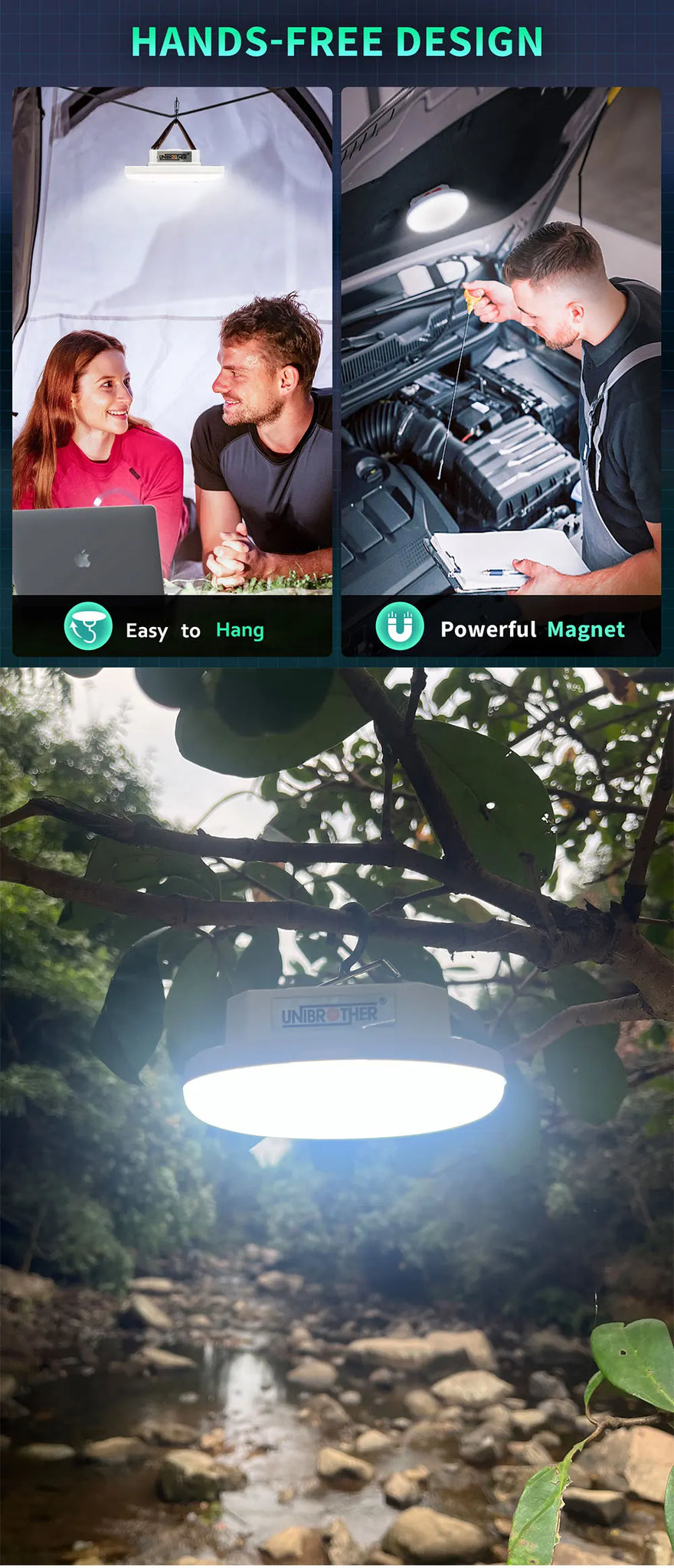 Perfect for camping, fishing, and hunting, its durable ABS and aluminum construction is waterproof, allowing use in rainy conditions. The dual magnets enable easy attachment to metal surfaces, while the adjustable belt and hook offer versatile hanging options. Charge your devices on the go with the USB interface, and keep track of the battery status with the power indicator.