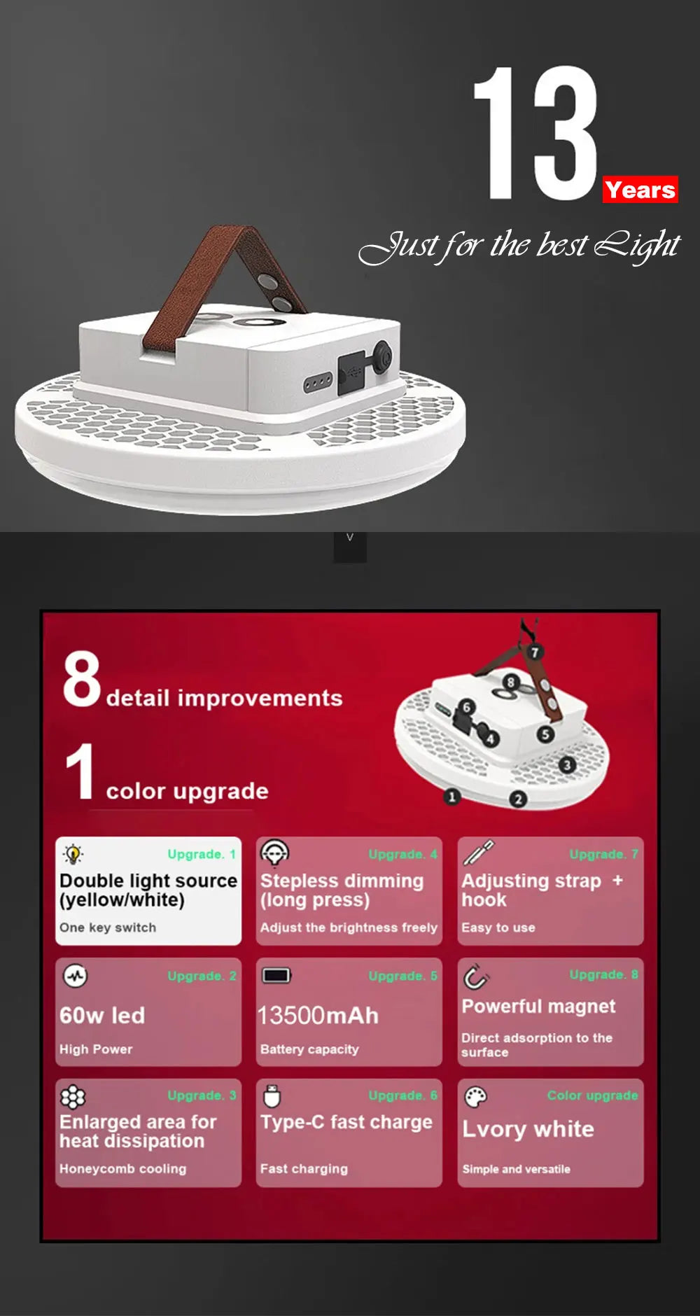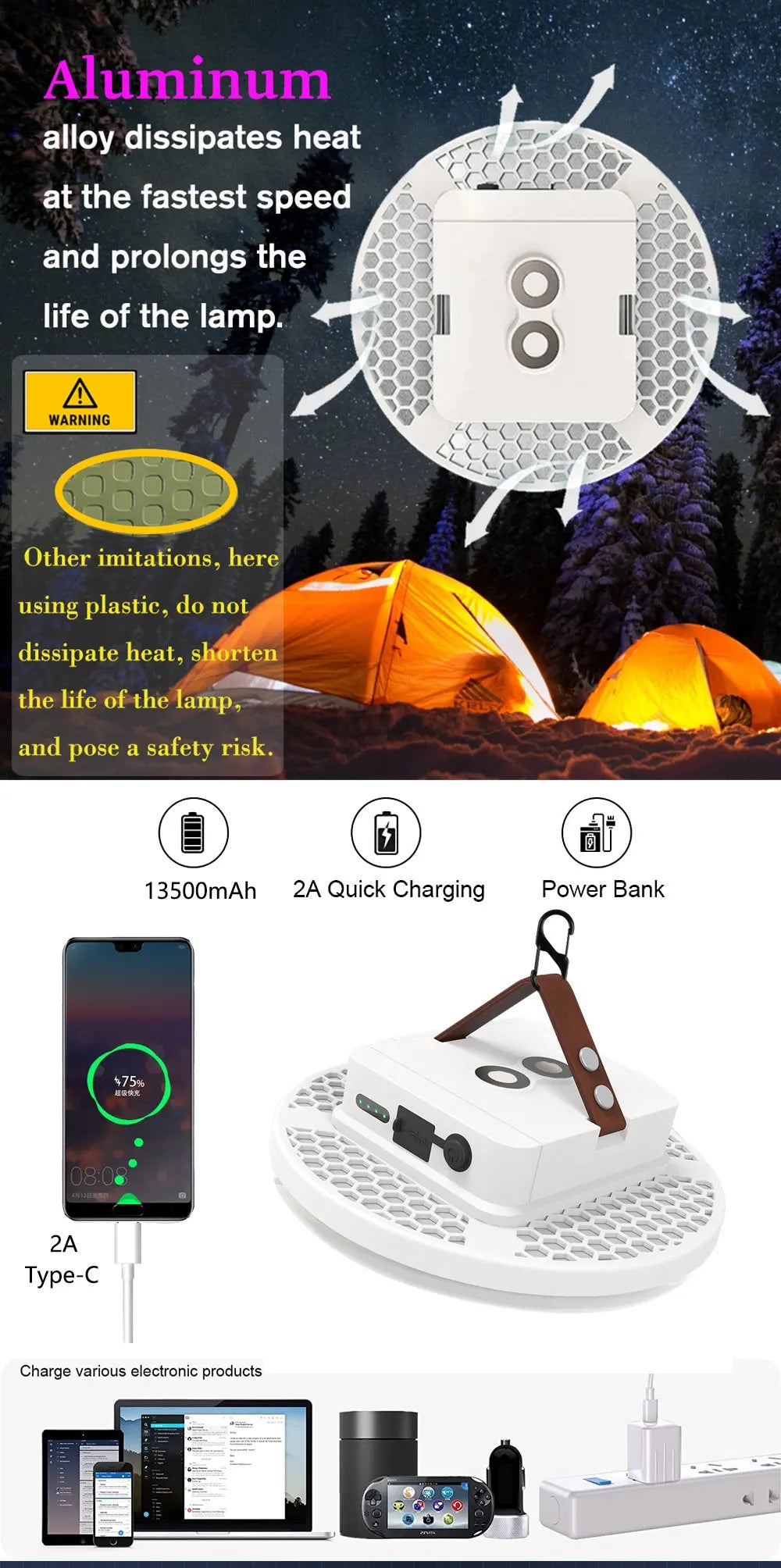 Specifications include a robust 13500mAh battery, ABS+aluminum body, a range of light temperatures, and a 6.5-hour charging time, ensuring it’s ready for any adventure.