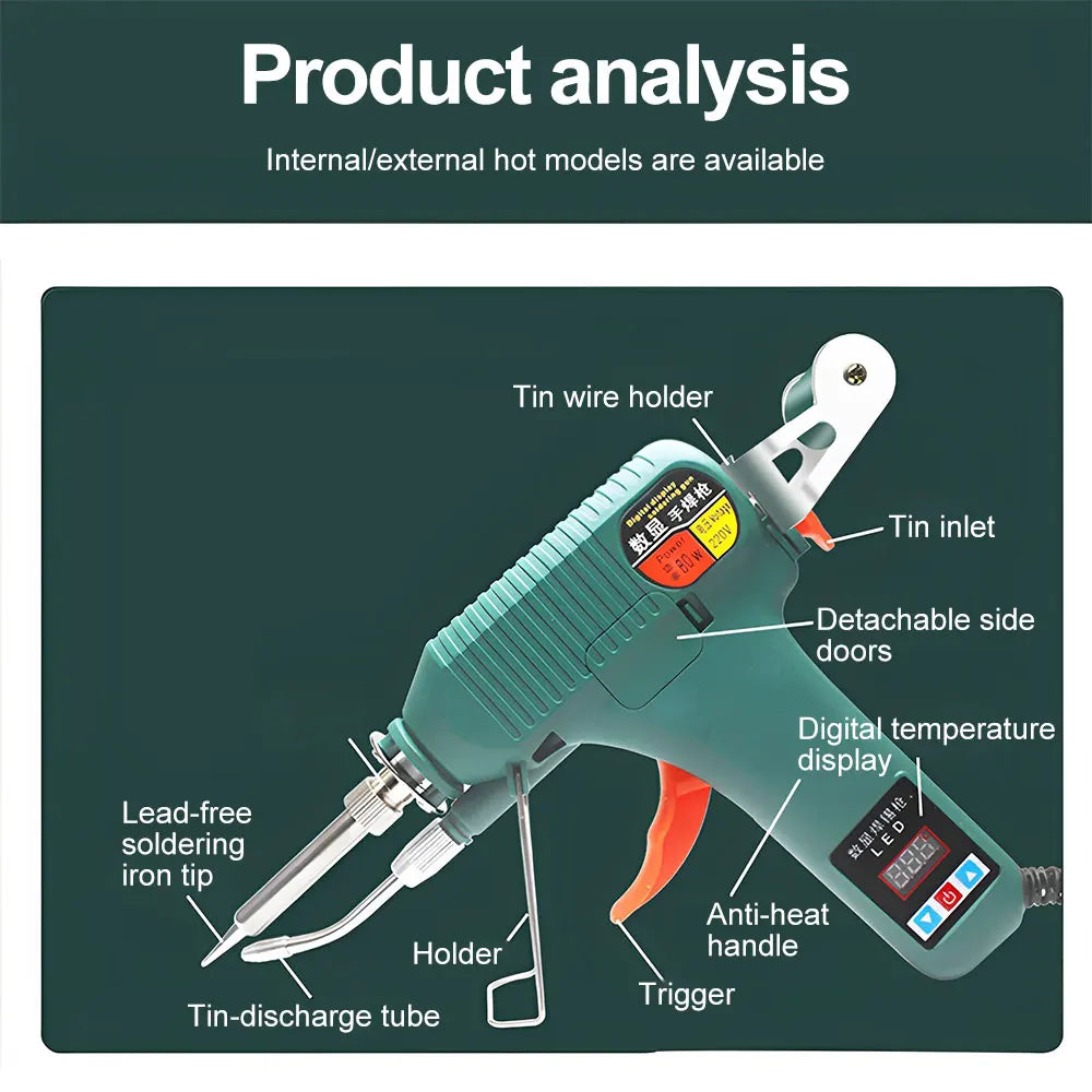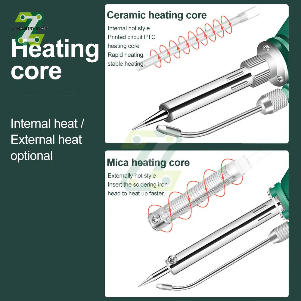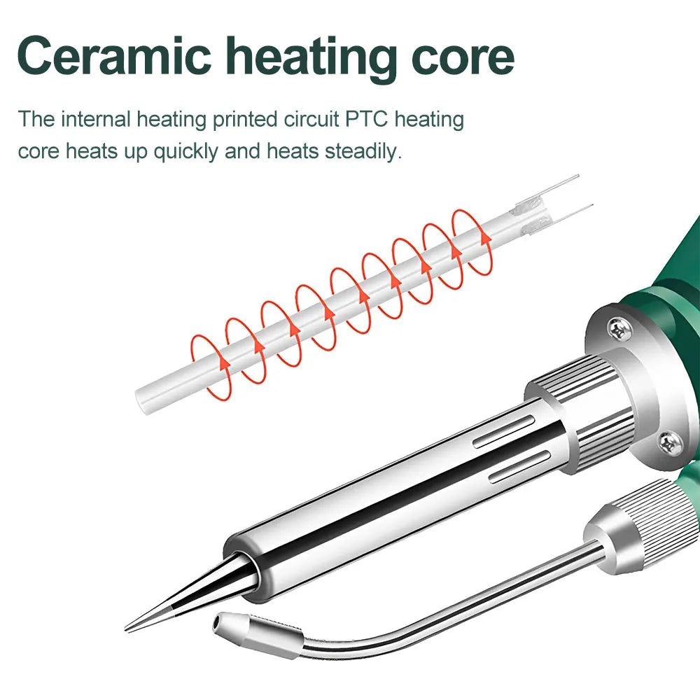 The innovative single-handed operation design includes an automatic tin feed and a solder holder, minimizing the risk of burns and freeing your hands for more efficient work. The natural mica heating core guarantees quick heating and a durable experience, with easy disassembly and replacement.