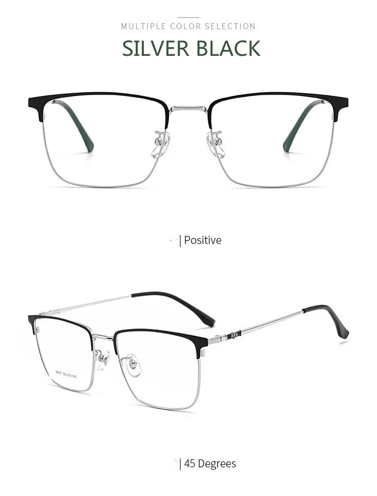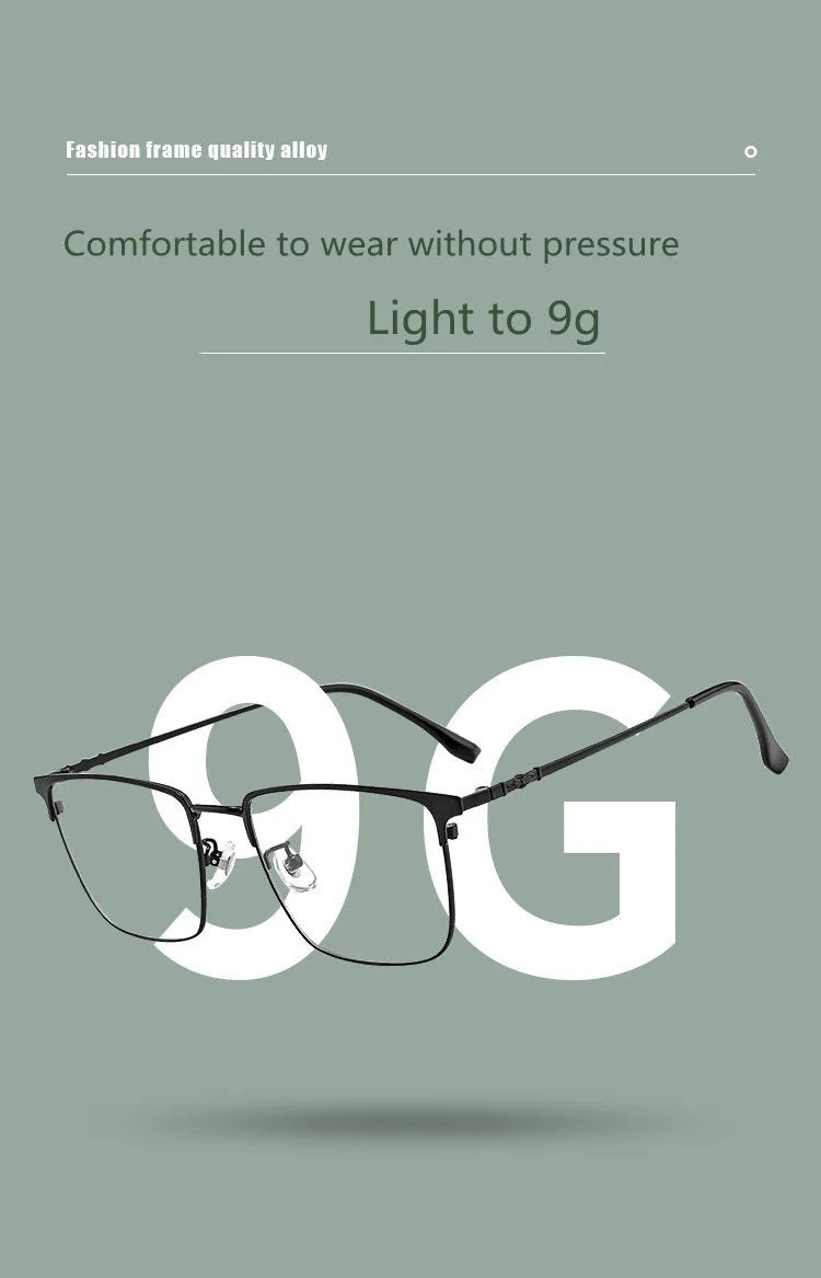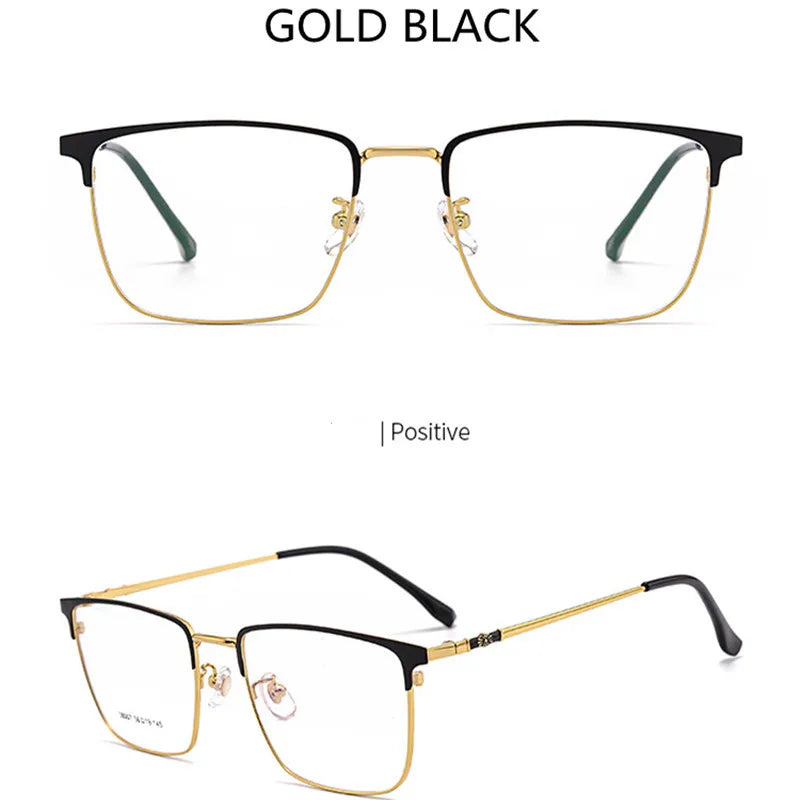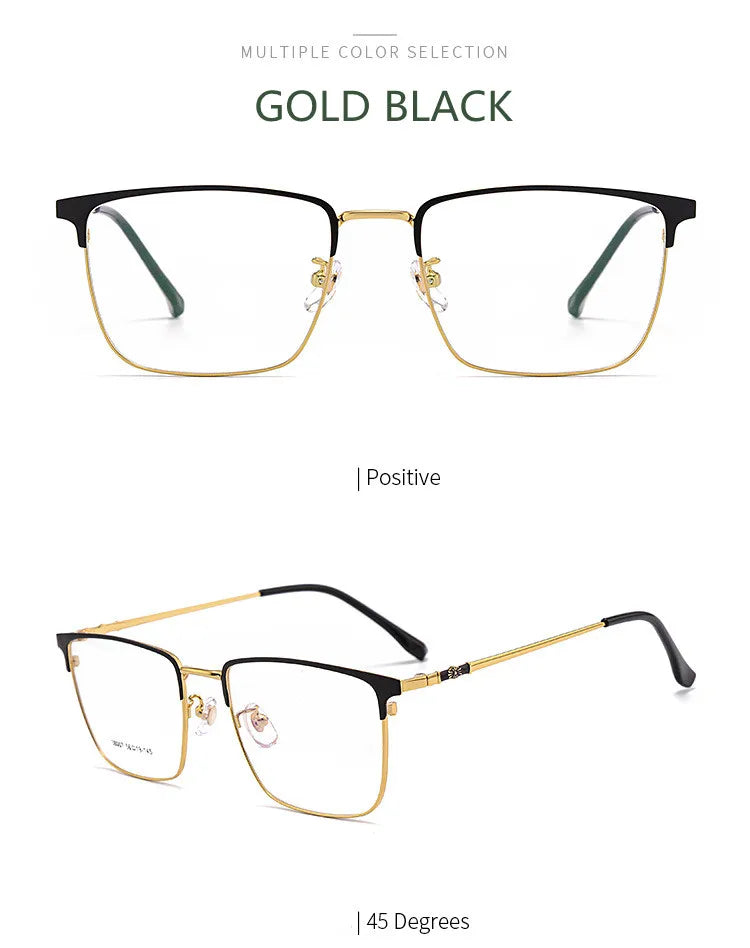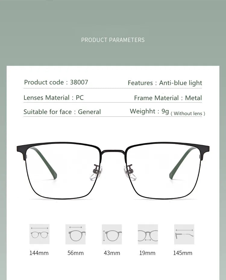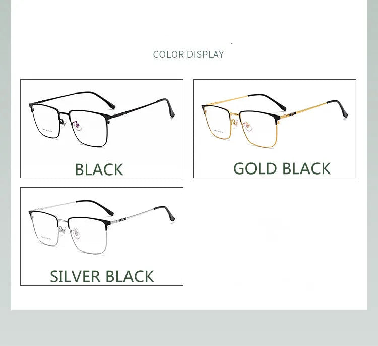 Introducing sleek and stylish eyewear designed to meet your digital needs. These full-rim glasses feature a durable alloy frame, available in chic color options: Gold Black, Silver Black, and Black. Equipped with cutting-edge blue light blocking technology, they help reduce eye strain during prolonged screen time. Suitable for both men and women, these glasses boast a modern rectangle shape and lightweight design, weighing only 9 grams for your comfort. The lenses are crafted from quality TAC material for clarity and resilience.