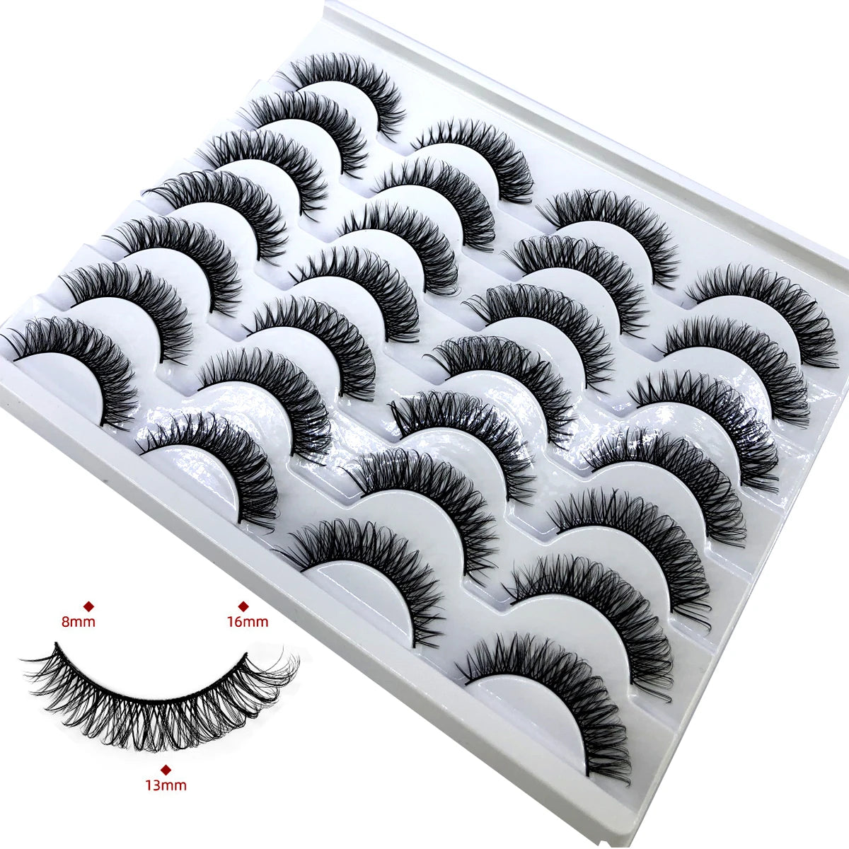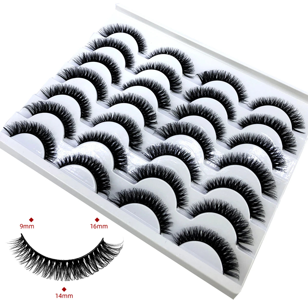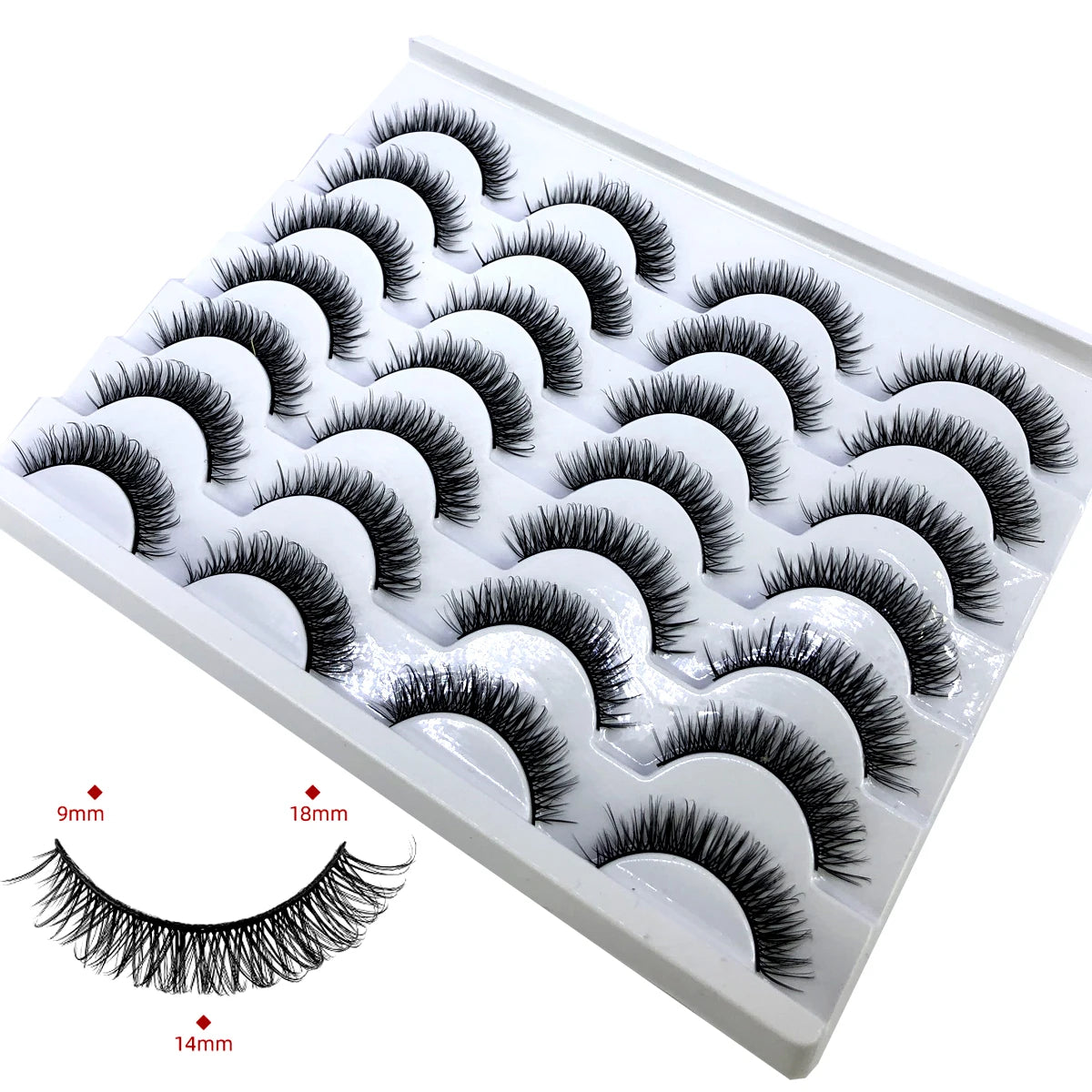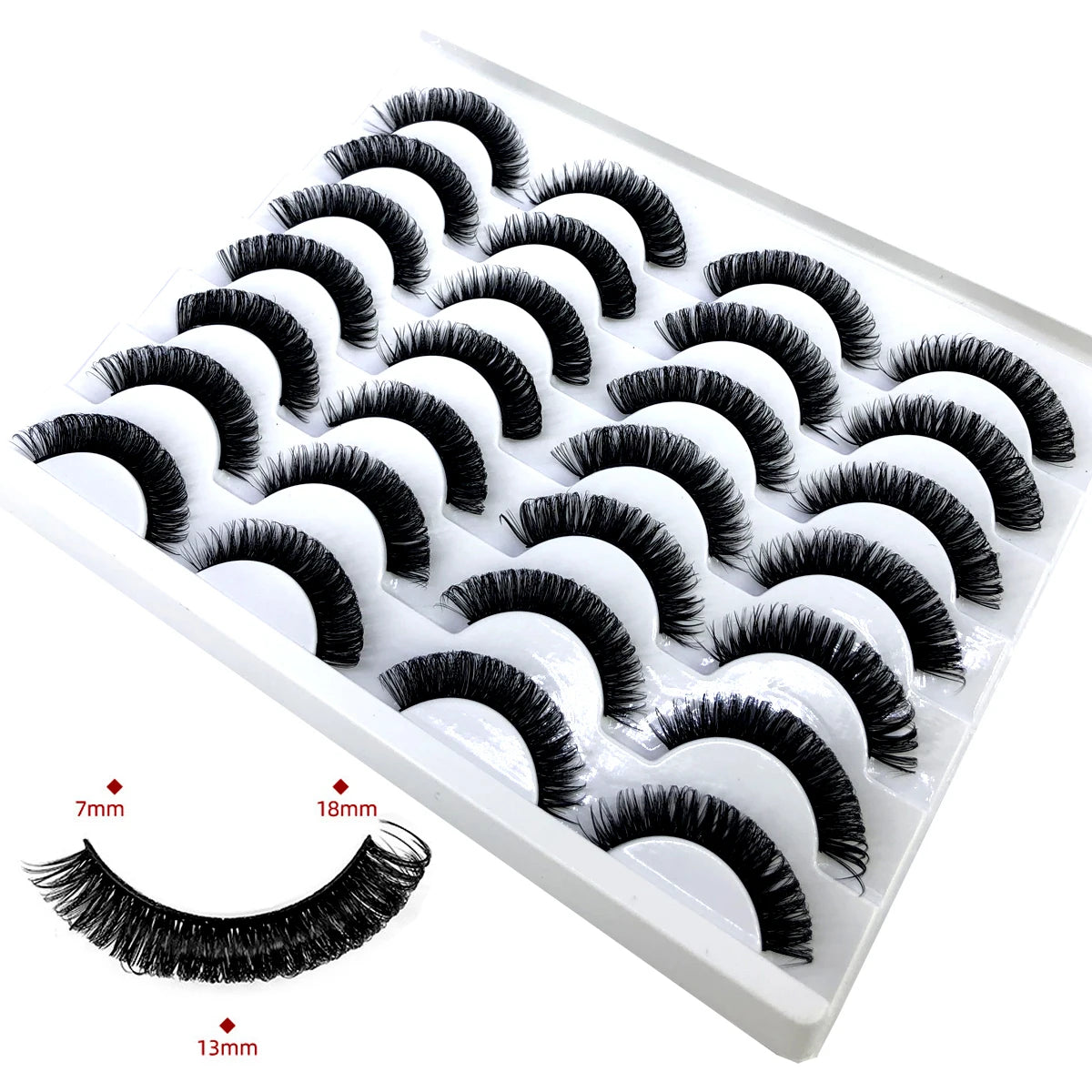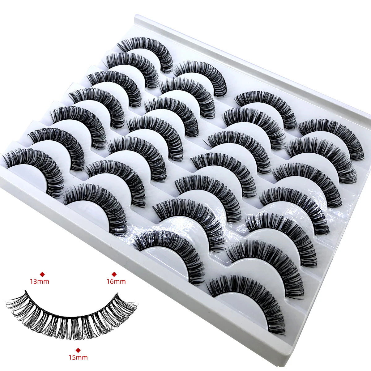 Discover the allure of these exquisite handcrafted false eyelashes, perfect for both everyday elegance and special occasions. Designed with a chic winged style, these lashes are crafted from premium, lightweight materials for all-day comfort. The innovative soft plastic cotton band ensures easy application and a secure fit, enhancing your eyes with timeless elegance. Each set includes 14 pairs, offering captivating lengths from 1 cm to 1.5 cm that beautifully balance volume and sophistication.