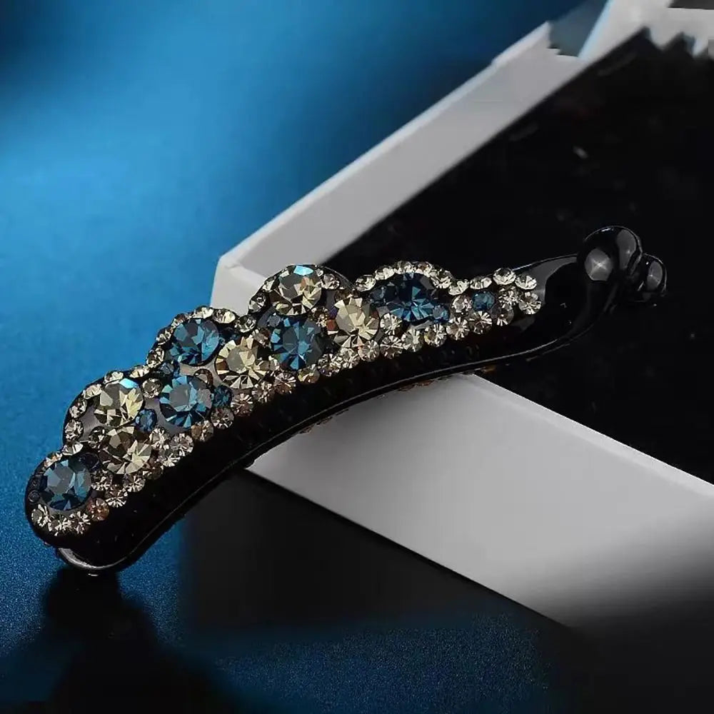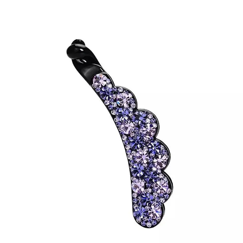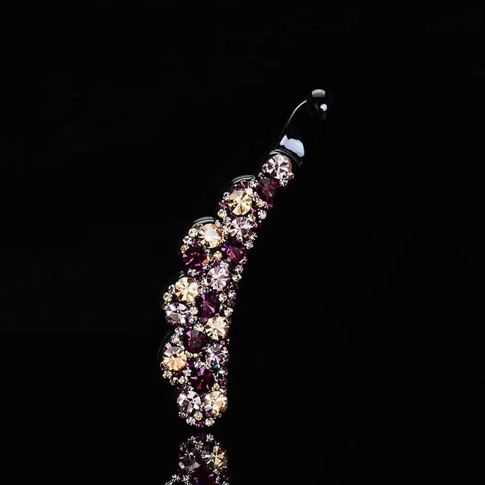 Enhance your hairstyle with this elegant banana clip, an ideal accessory for both casual outings and special occasions. Made from durable plastic and adorned with sparkling diamond accents, it adds a glamorous touch to any ensemble. Available in a beautiful array of colors—gold, multicolor, blue, purple, blue & grey, and champagne & purple—this clip seamlessly complements your wardrobe. Choose between two sizes, small (8cm) and large (10.5cm), to suit different hair types and styles. This versatile and chic accessory is a stylish and functional addition to your hair collection.