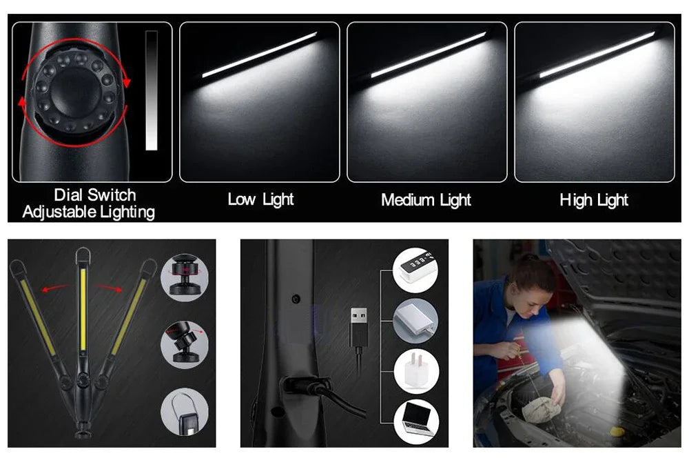 Introducing the versatile Portable LED Work Light, the perfect companion for car repairs, home projects, garage tasks, and emergency situations. This advanced lighting tool delivers up to 700 lumens of bright, adjustable LED light with a simple dial power switch, allowing you to customize the brightness to suit your needs. With a 180° beam angle, it effectively illuminates a wide area.