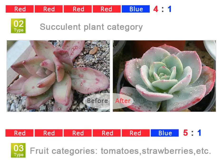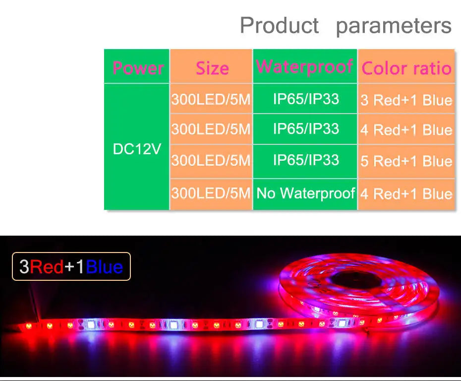 The light strip features a powerful blend of red and blue LEDs with adjustable ratios (3:1, 4:1, or 5:1 red to blue), offering tailored lighting that significantly impacts photosynthesis. With an IP65/IP20 rating, it is suitable for various indoor environments.