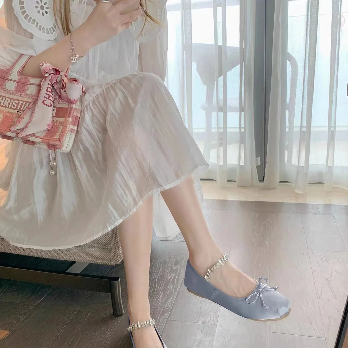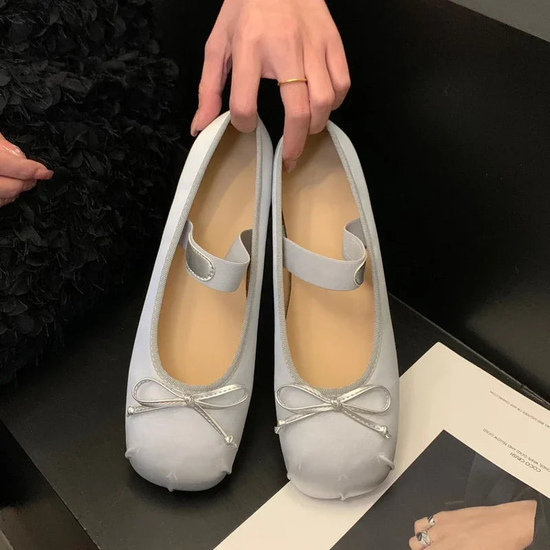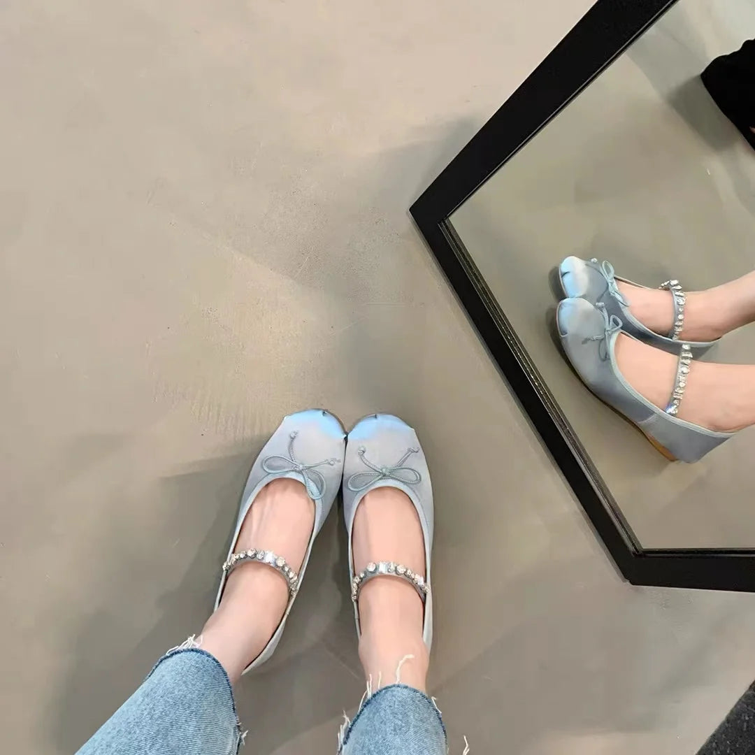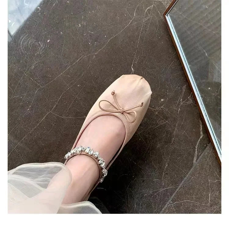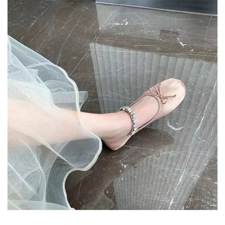 2023 Luxury Satin Silk Ballet Flats for Women - Square Toe Bowtie Elastic Band Ballerina Loafers
