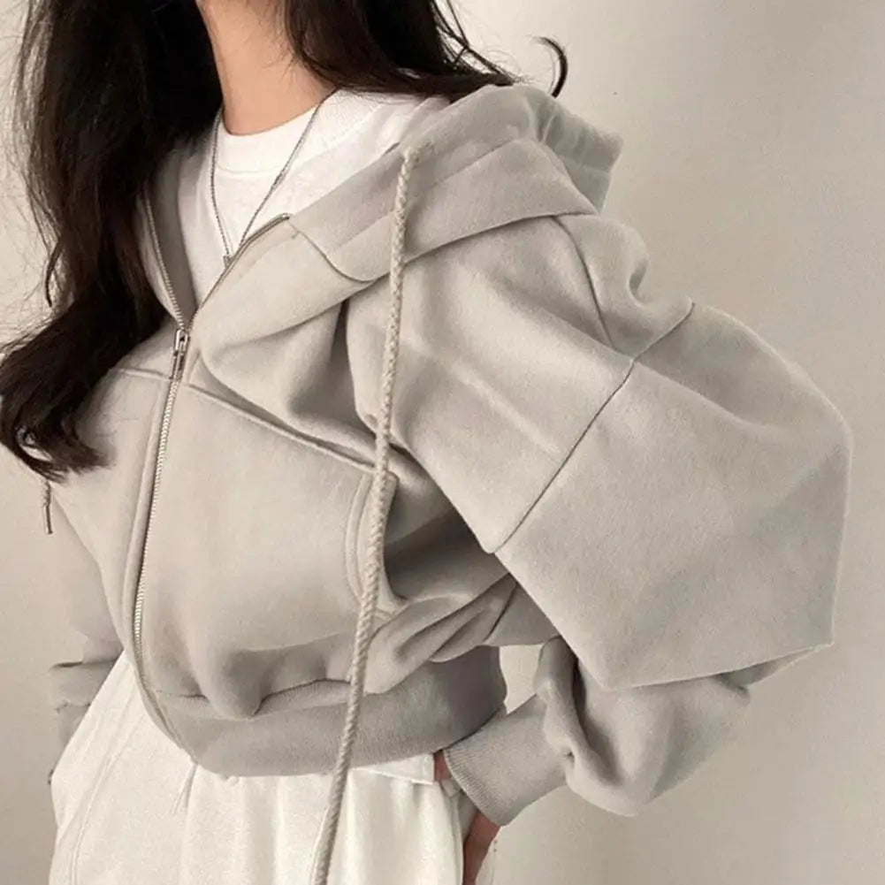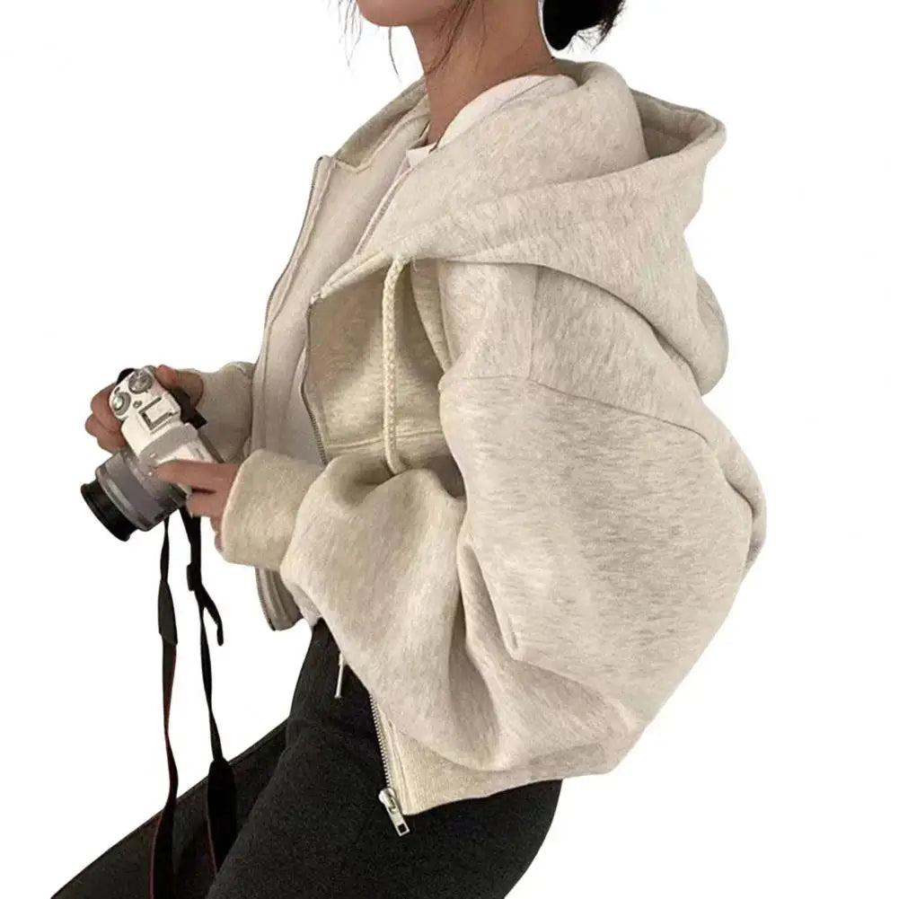 2024 Women's Hooded Cropped Zip-Up Jacket - Slim Fit, Warm Solid Color Coat for Autumn/Winter