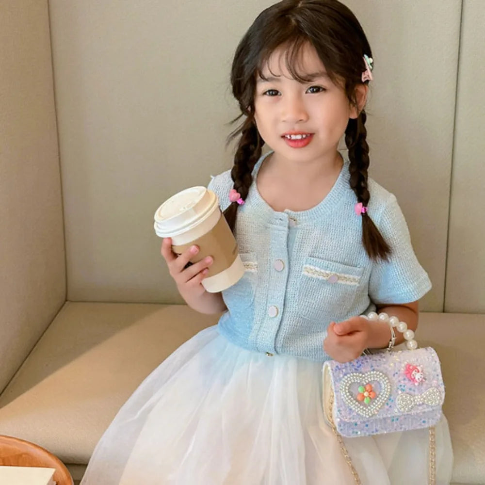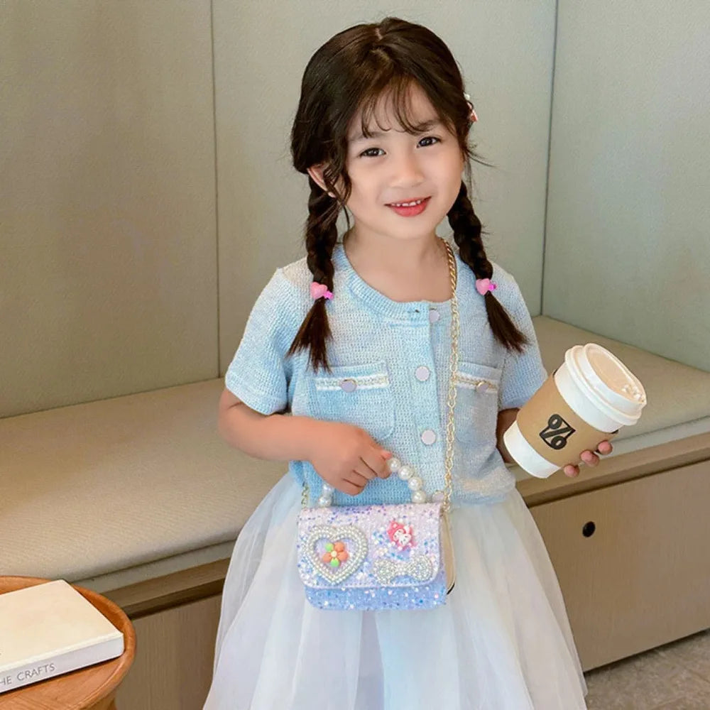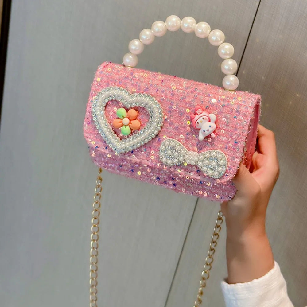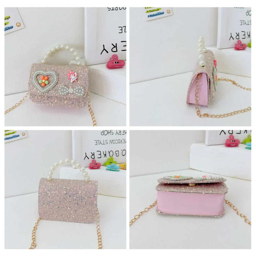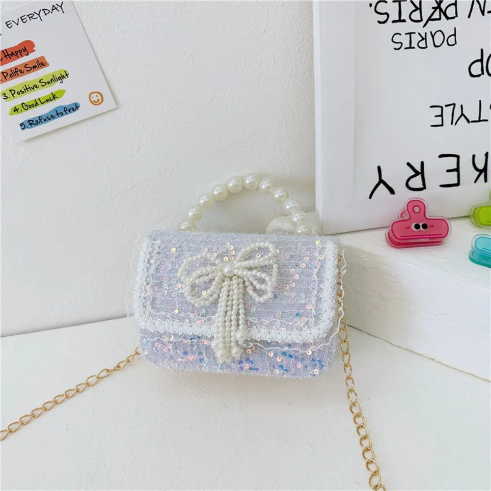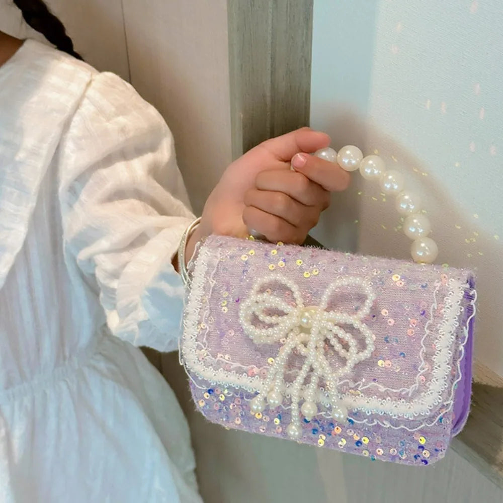 2024 Korean Pearl Kids' Handbag with Lace Bow, Sequin Shoulder Messenger Bag, Princess Wallet Pocket Pack
