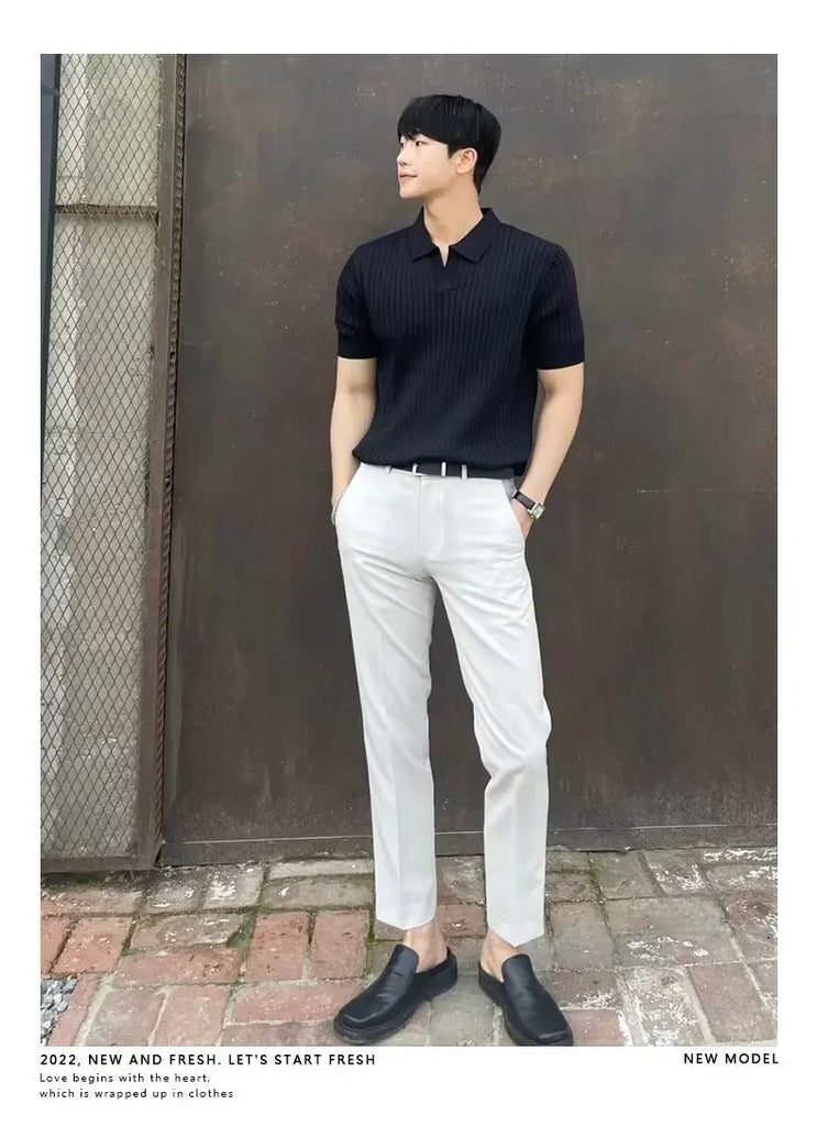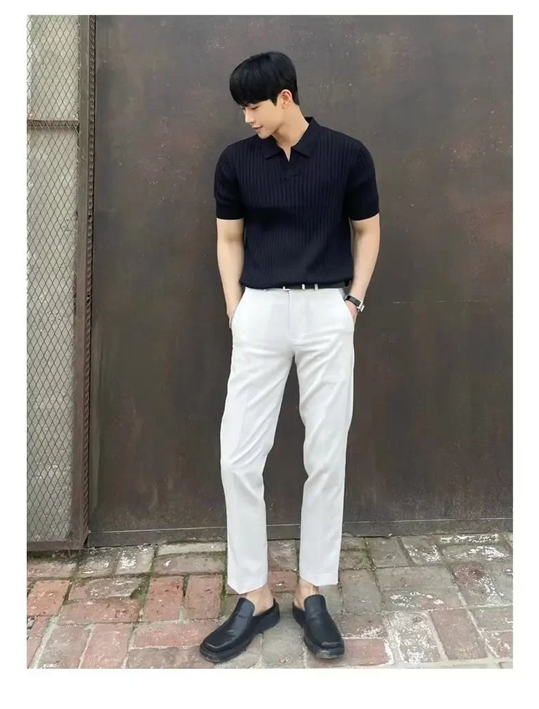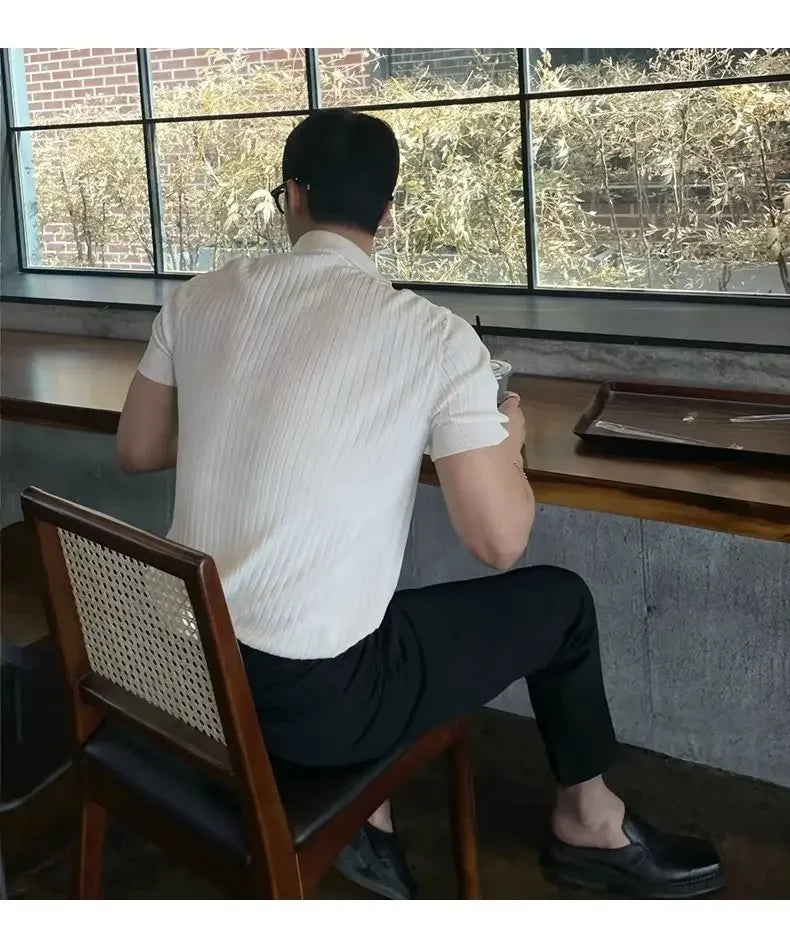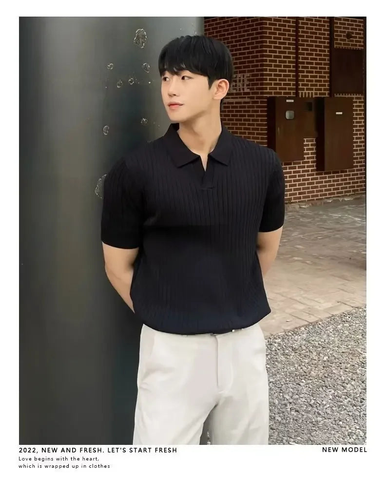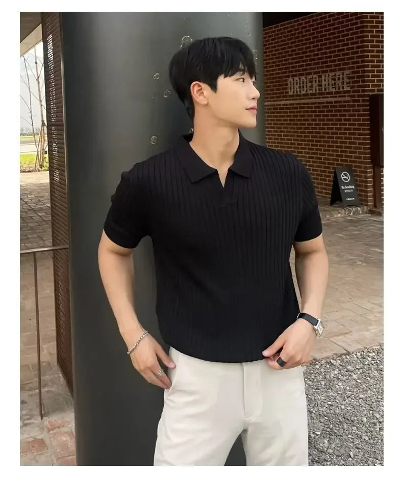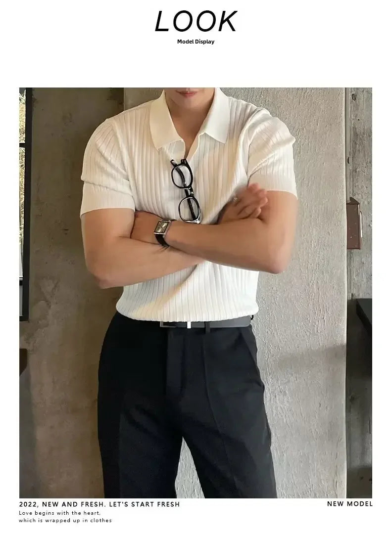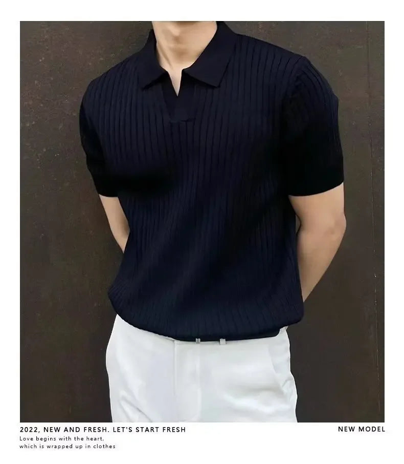 Elevate your summer style with this premium ice silk polo shirt, designed for ultimate comfort and coolness. Featuring a chic V-neck design and striped knitted base, it perfectly balances sophistication and trendiness. Ideal for casual settings, this short-sleeved T-shirt effortlessly complements your summer wardrobe. Its versatility allows pairing with various outfits for any occasion.