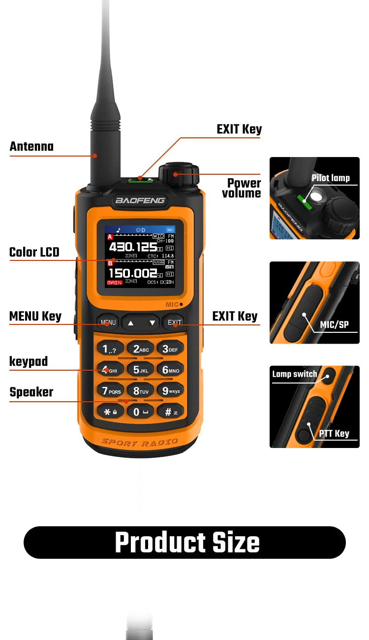 This walkie talkie arrives ready to use, featuring a 1.77” TFT large screen, a full keyboard, and an intuitive menu for effortless operation. Additional functionalities include a scanner mode, dual band/watch/reception, a monitor function, and an emergency alert system.