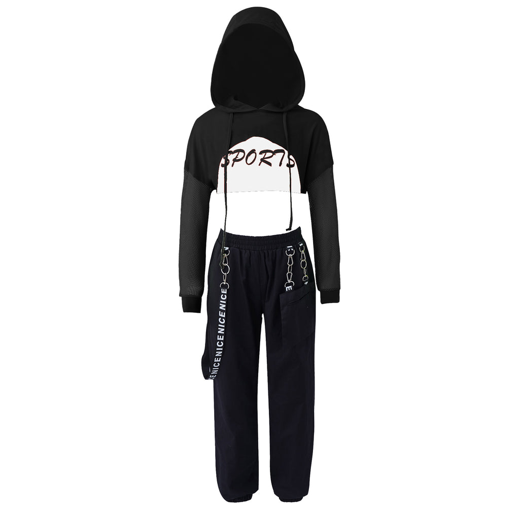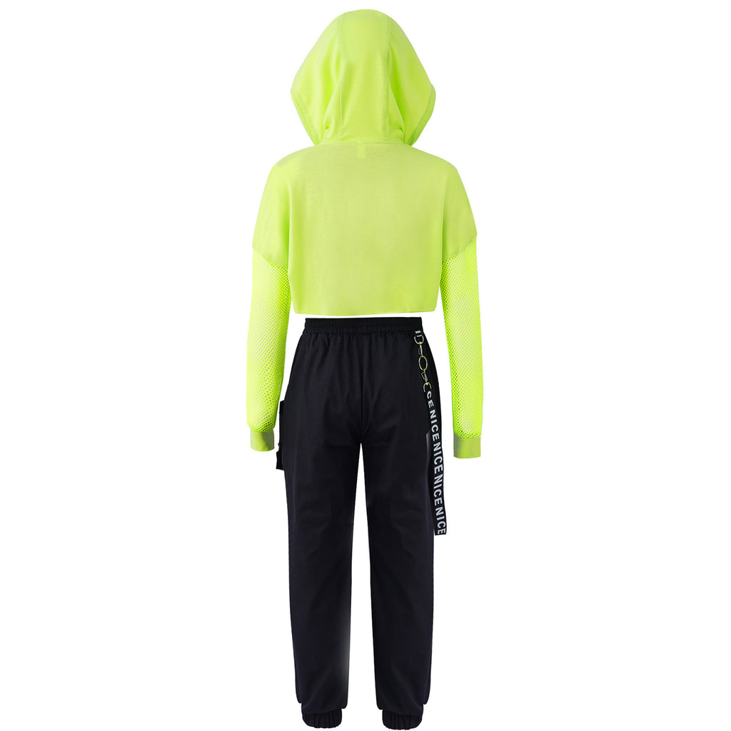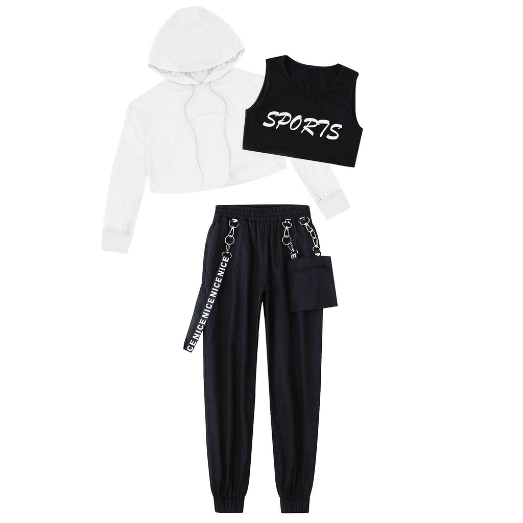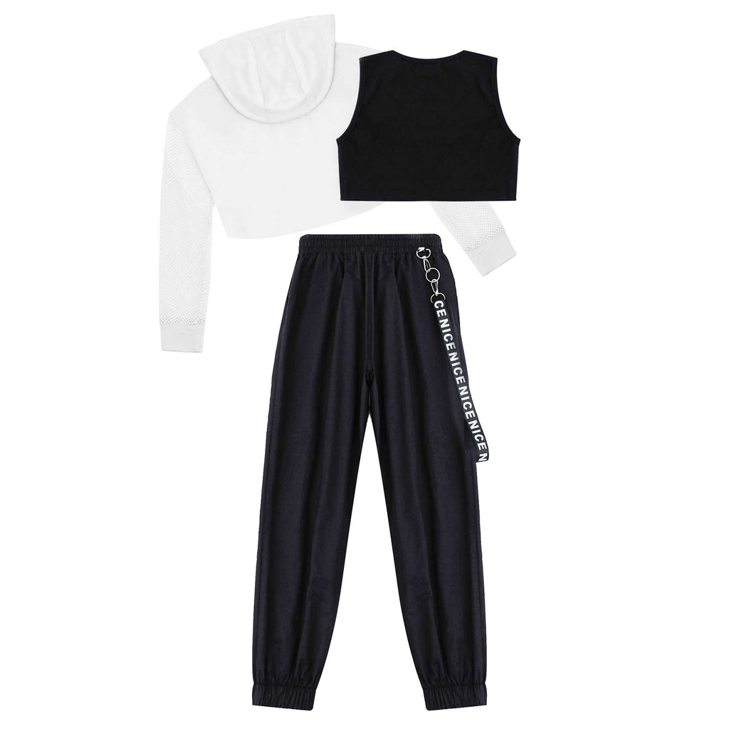 3pcs Kids Hip Hop Dance Costume Set: Hooded Top, Net Cover Up, Crop Tank & Pants