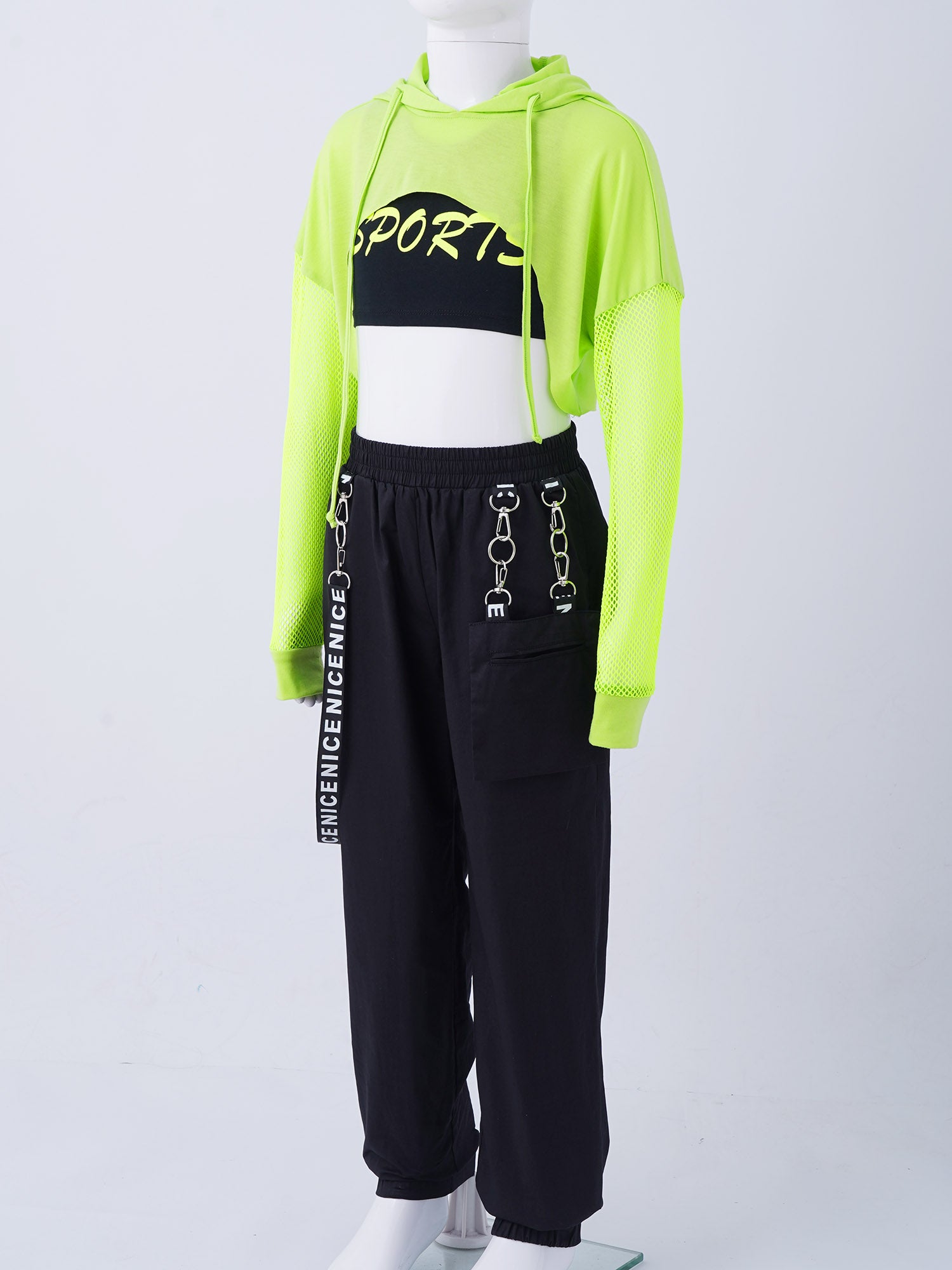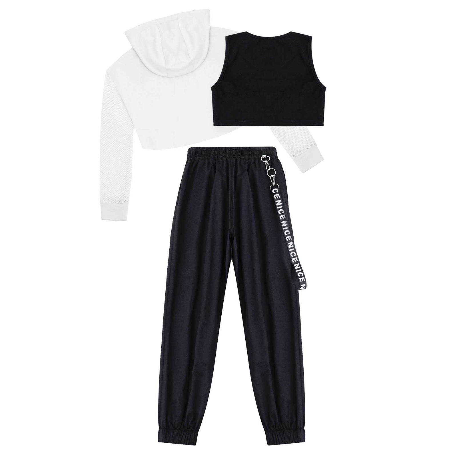 Elevate your girl's wardrobe with this stylish 3-piece set, perfect for dance and performance. This set includes a hooded net cover-up top, a trendy crop vest, and chic pants with a chain design. Made from skin-friendly polyester, it offers a soft, breathable, and moisture-wicking experience, ensuring comfort whether she's at practice or taking the stage.