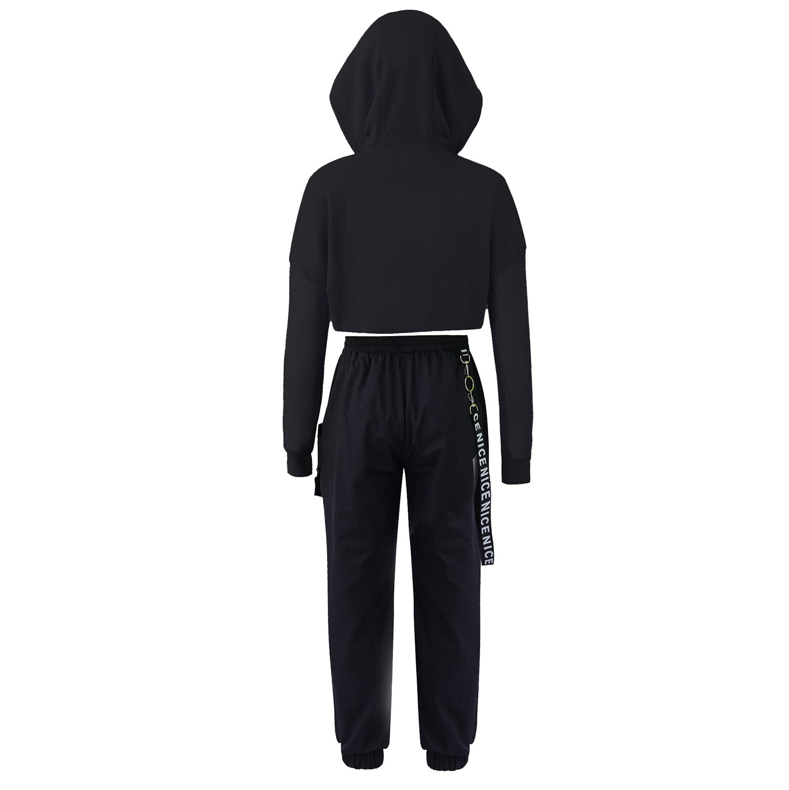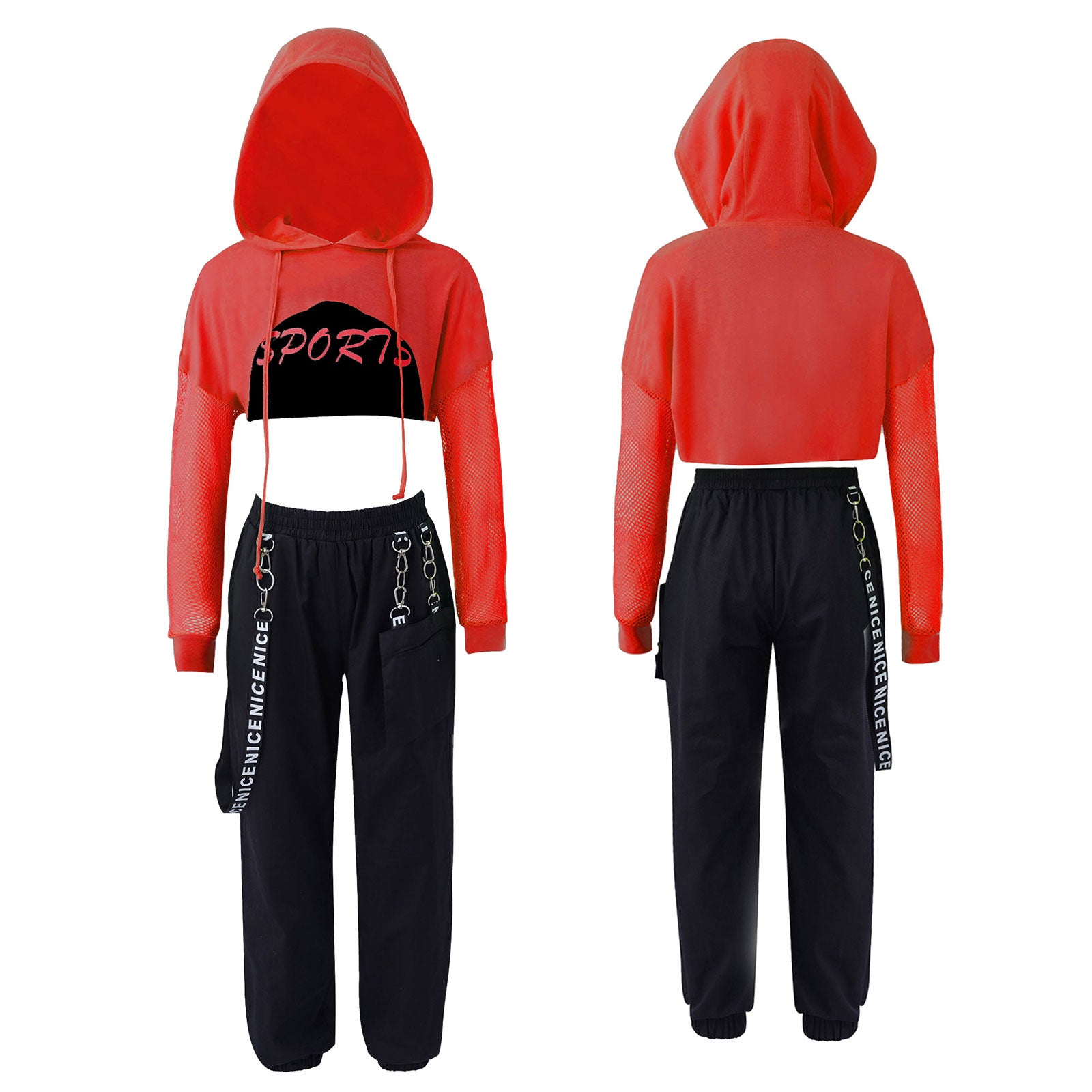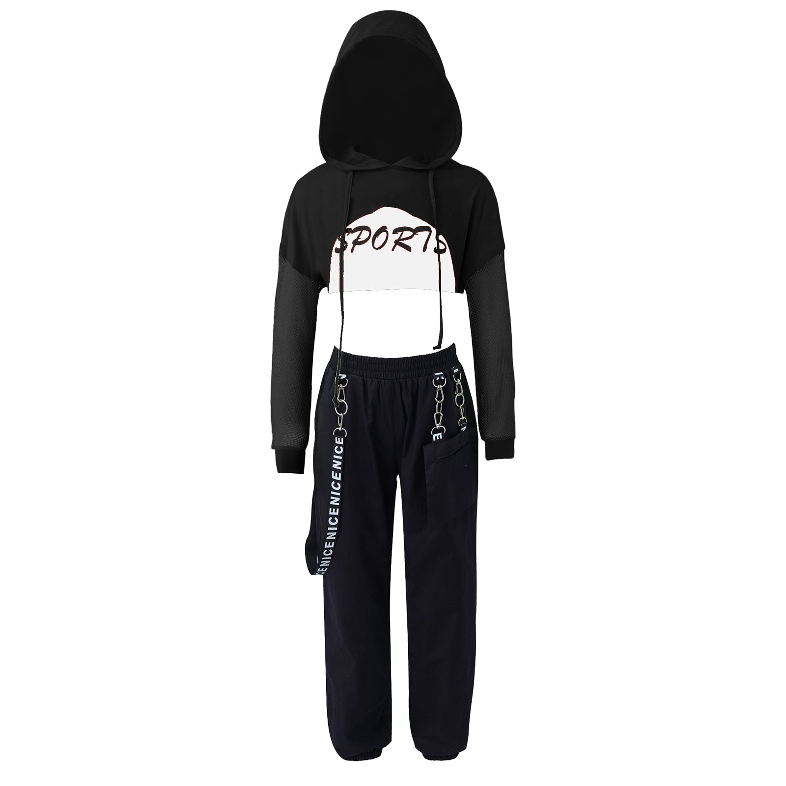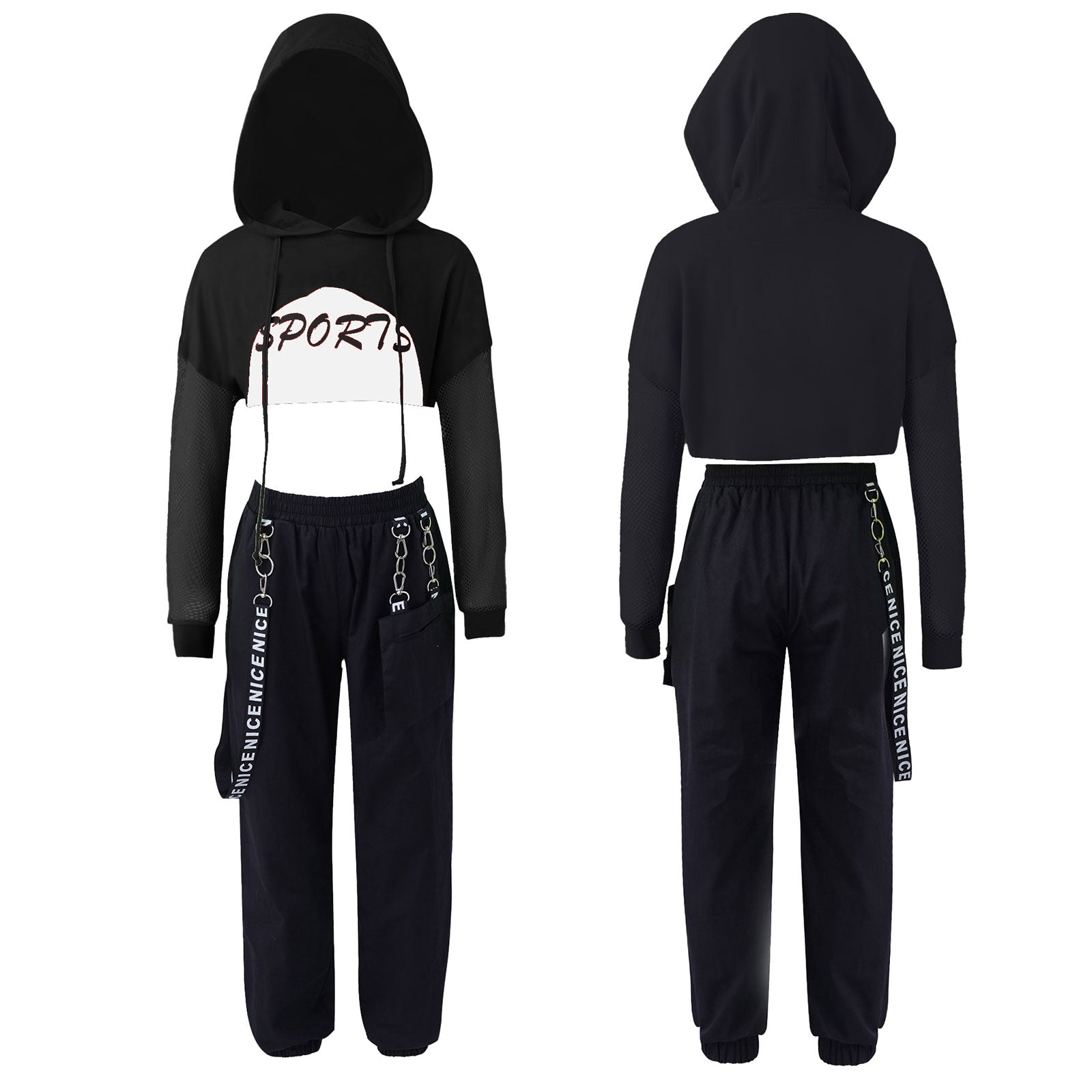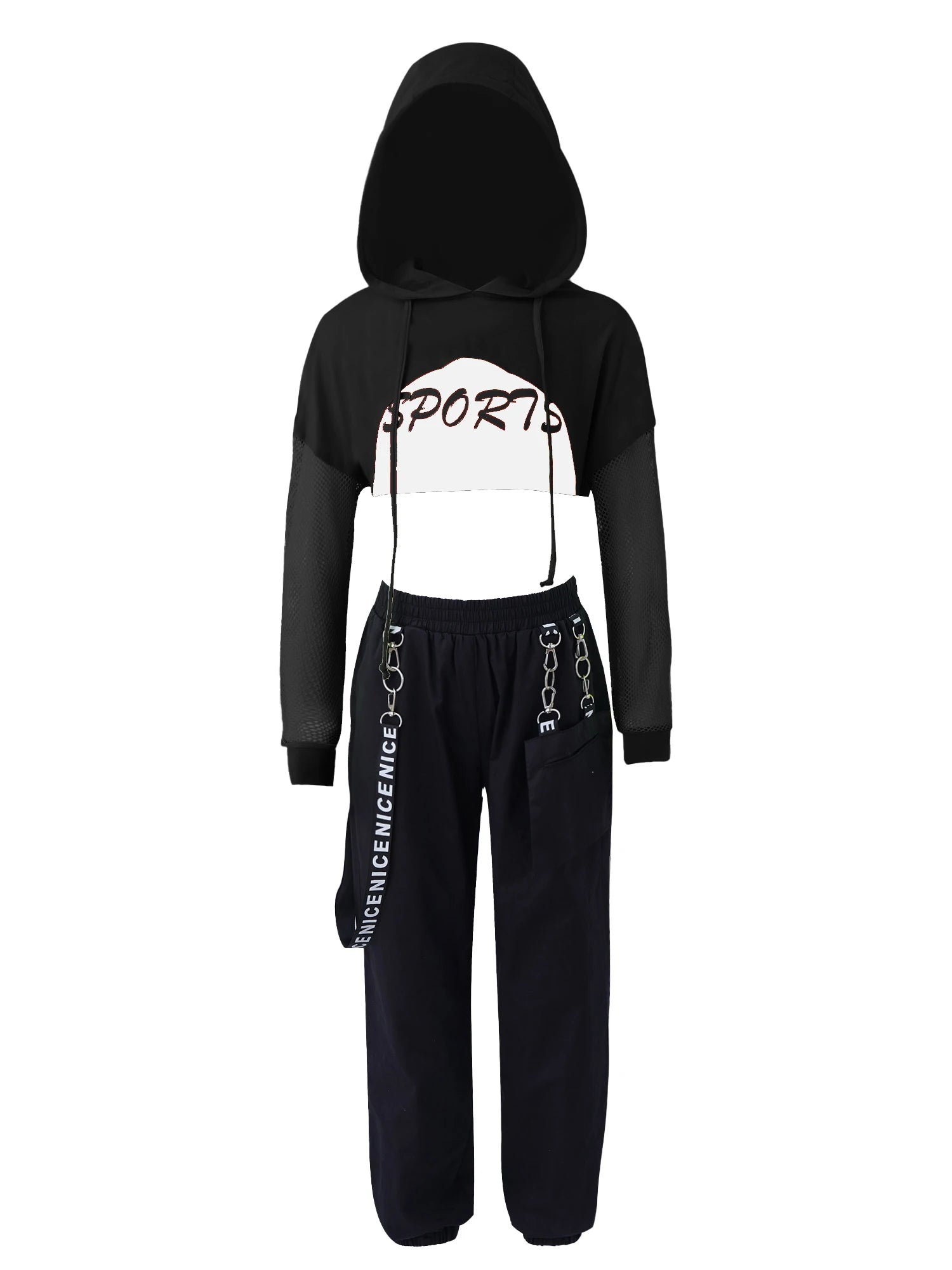 - Design: Hooded top with a modern chain-detailed pant