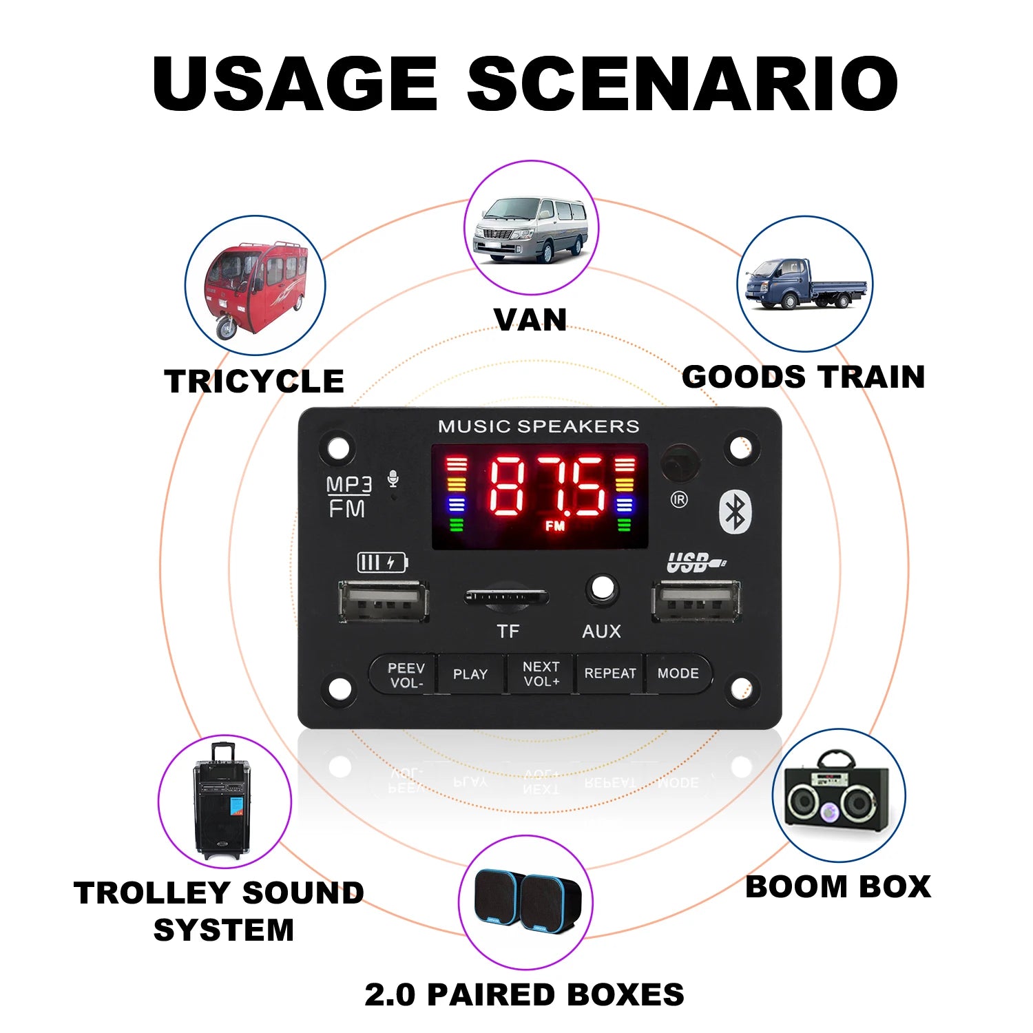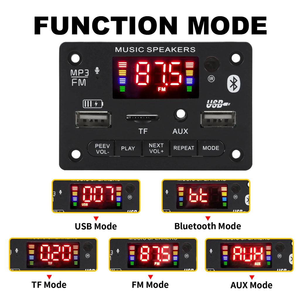- Automatic Switching: USB/TF/Bluetooth/FM/AUX