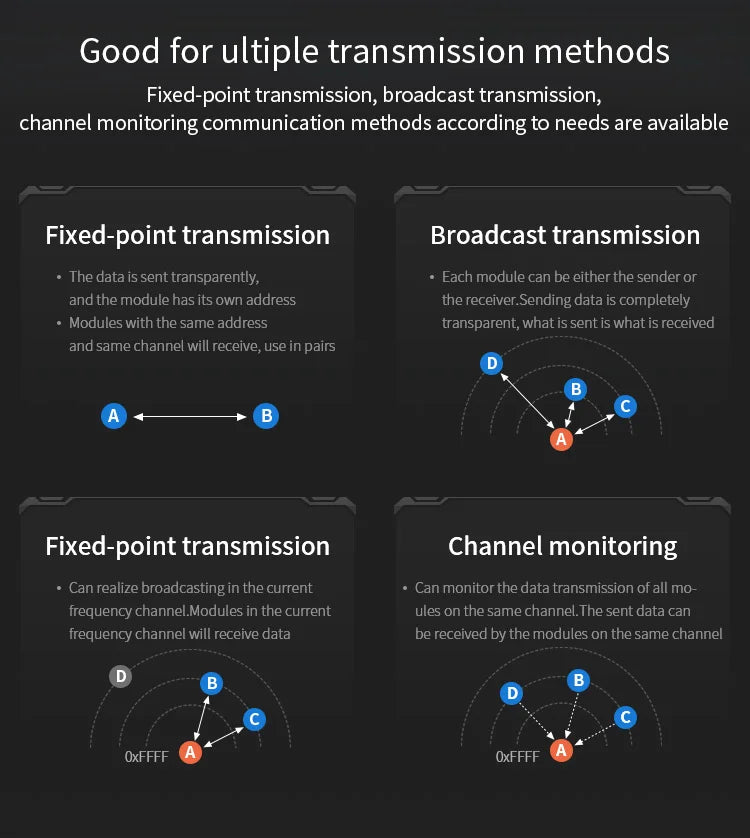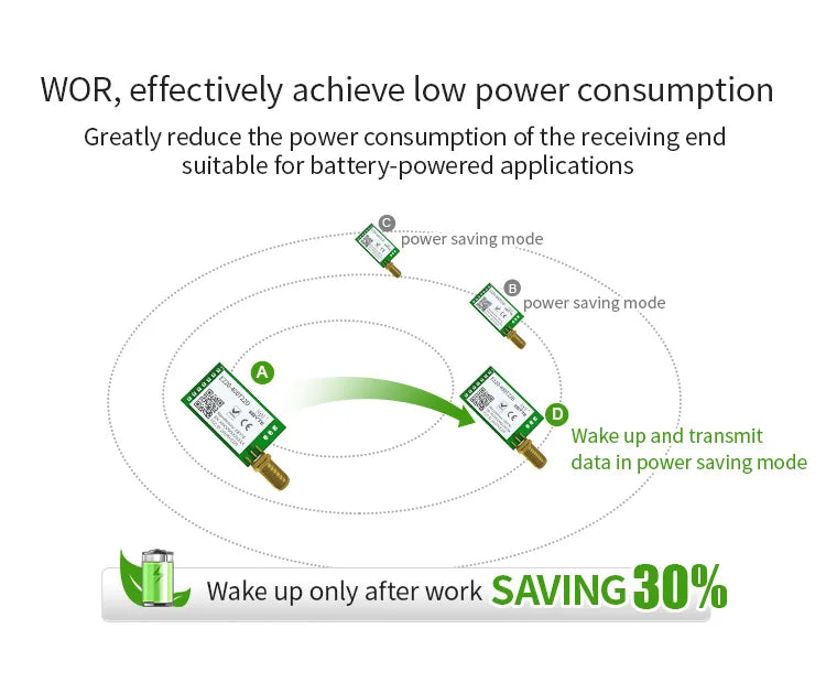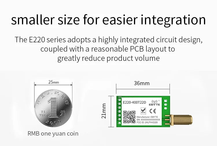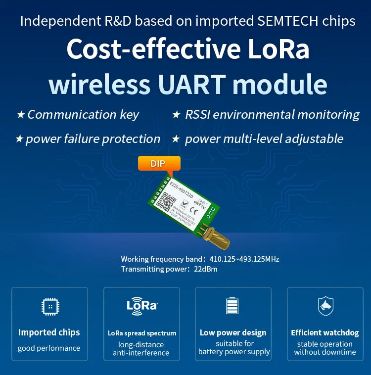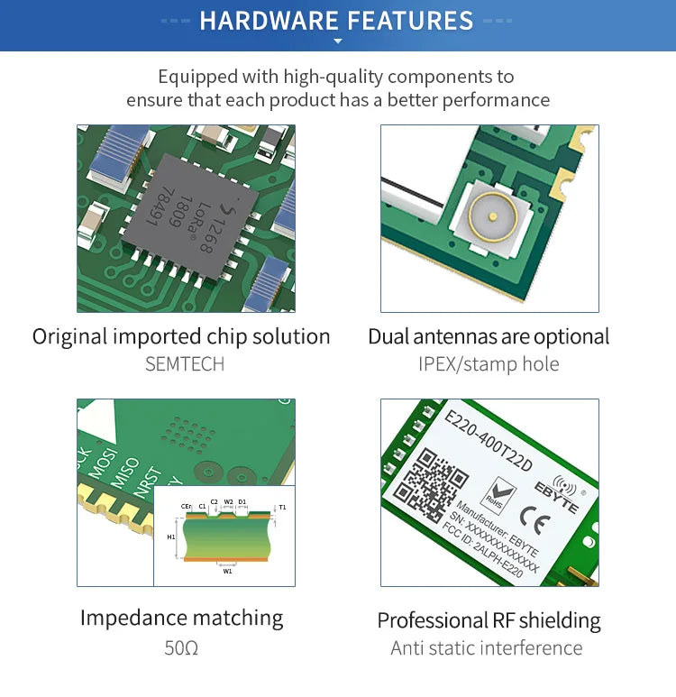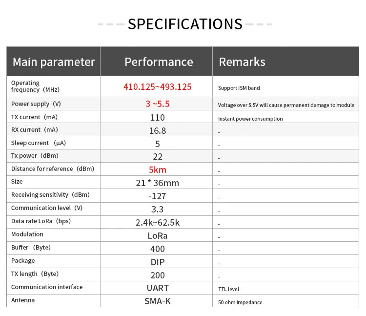 Equipped with an SMA-K type antenna and UART communication interface, this module provides high performance while maintaining compliance with CE, FCC, and RoHS certifications. Perfect for applications where efficiency and extended communication range are critical, this RF module is a versatile solution for modern connectivity needs.