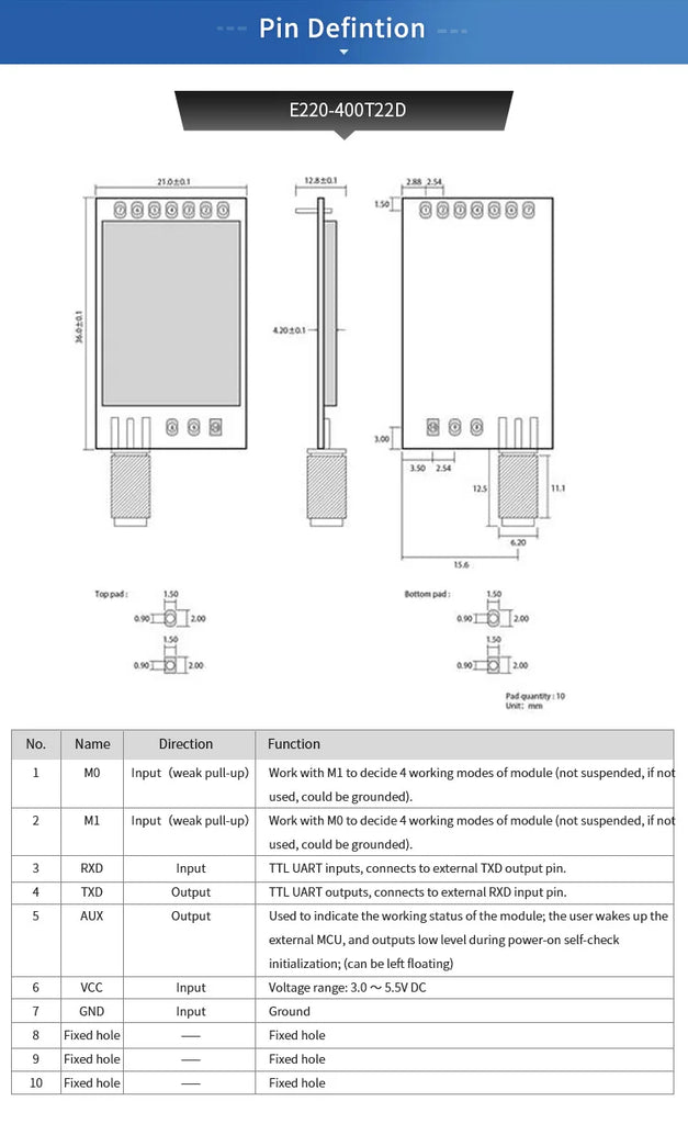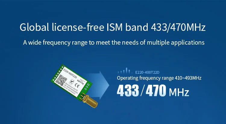 Introducing our advanced RF module designed for seamless long-distance communication. This module operates within a frequency range of 410.125~493.125MHz, specifically centered at 433MHz. Its compact size of 21*36mm makes it ideal for integration into various devices. With a robust transmitting power of 22dBm, it ensures reliable connectivity over a distance of up to 5km.