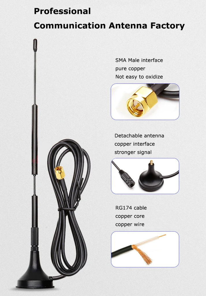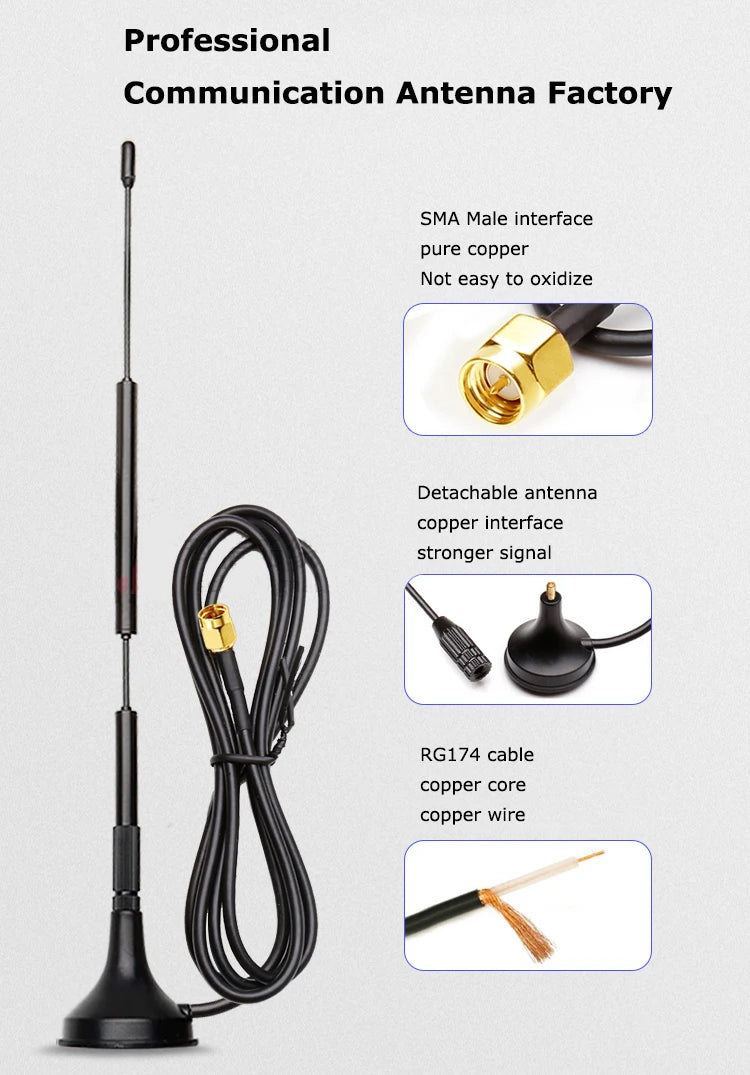 Measuring adjustable lengths from 10 to 31cm, the antenna is compatible with various setups and its SMA male connector ensures easy integration with your equipment. It is equipped with a durable RG174 cable that extends up to 3 meters and can be customized per your needs. The impedance of 50Ω and a SWR of ≤1.5 make it an excellent choice for reliable and efficient communication.