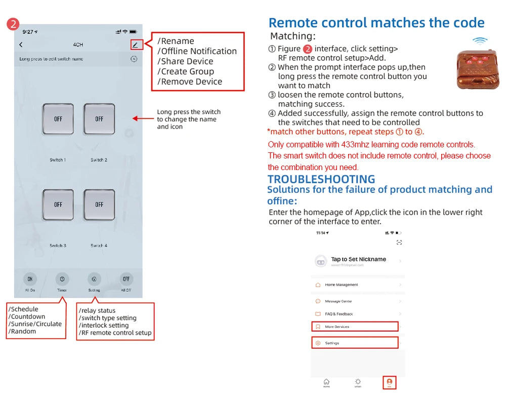 RF Remote Control: For local control, utilize the 433MHz RF remote (sold separately) to manage devices. Note that the switch requires a 433MHz learning code remote for this feature.
