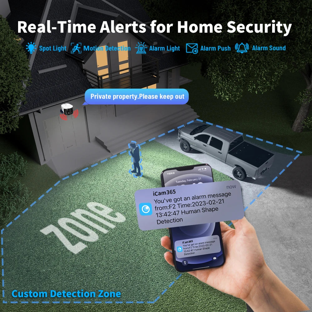 - Smart Detection: AI technology minimizes false alarms by accurately detecting humans, vehicles, and animals.