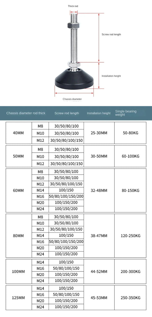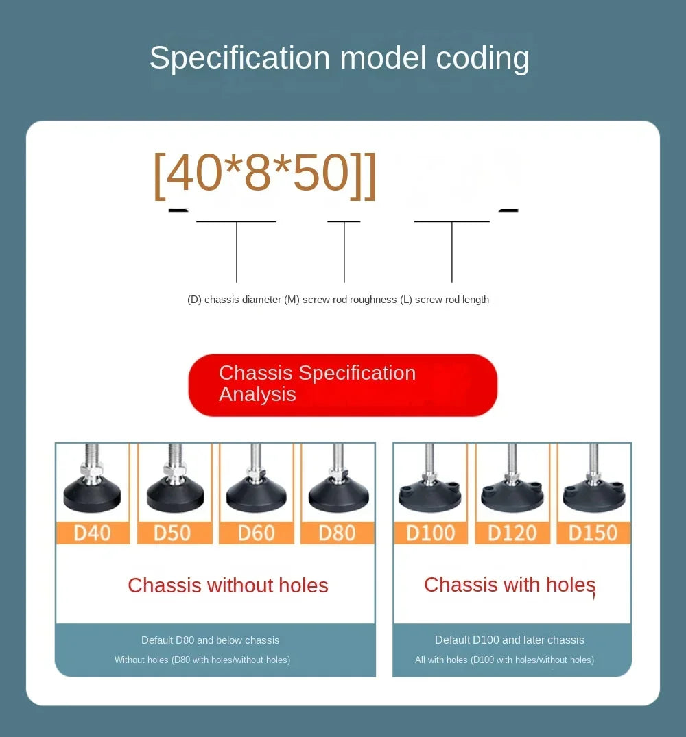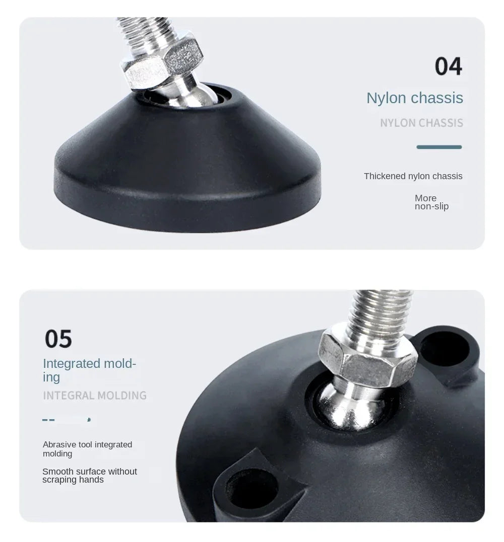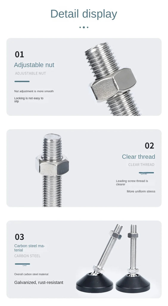 Ideal for both office and home use, these feet are perfect for light-duty furniture, machinery, and more. The universal thread design (available in M8, M10, M12) allows for easy installation and customization to achieve the desired height, making them suitable for various applications such as machine tools, sofas, tables, and cabinets.