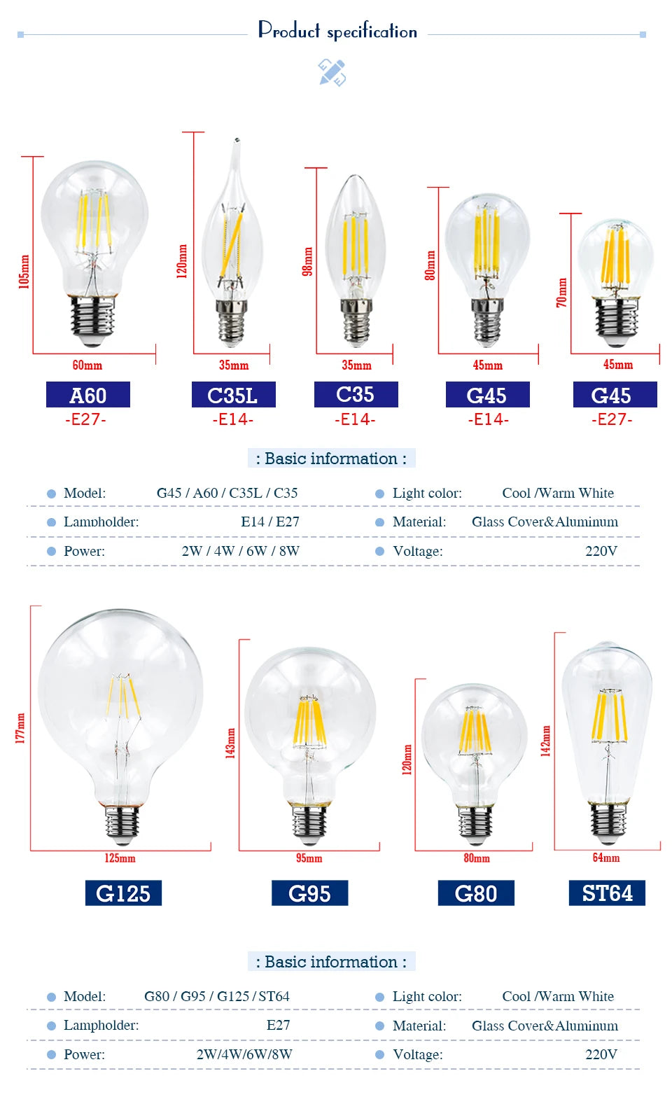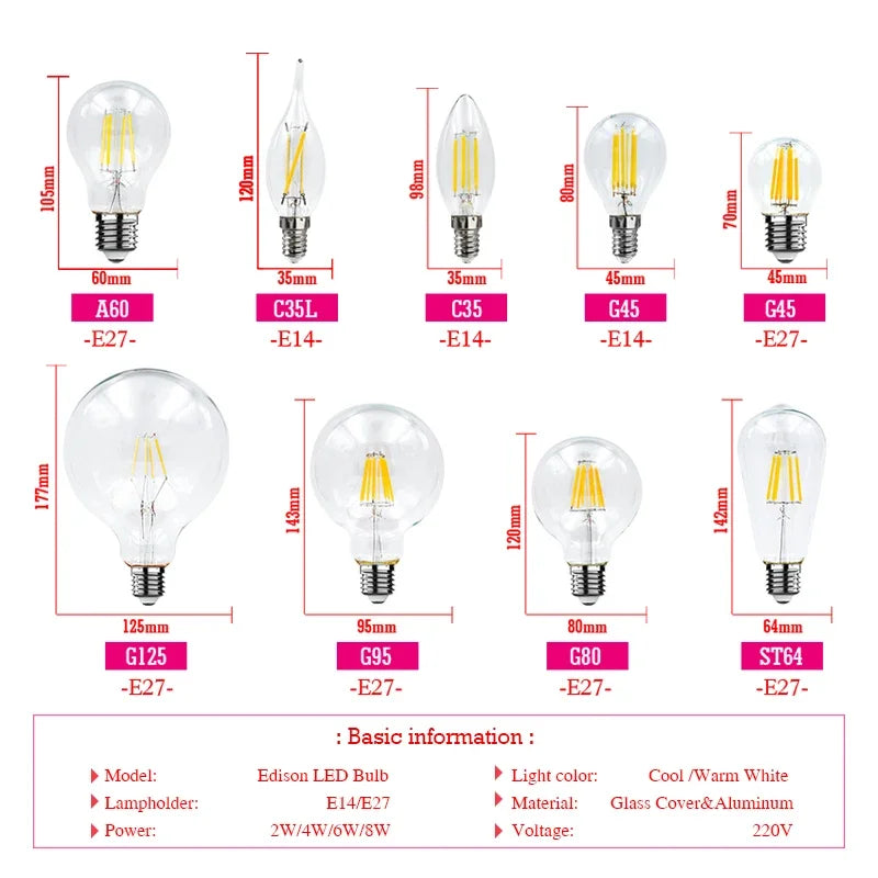 - Shapes Available: C35, C35L, G45, A60, ST64, G80, G95, G125