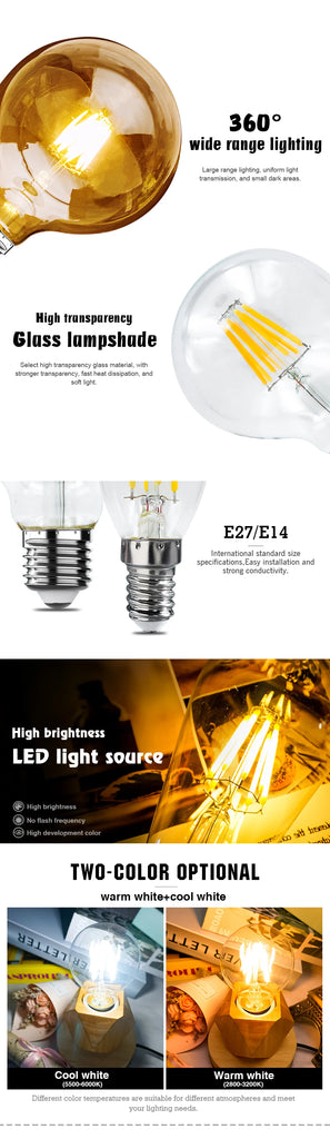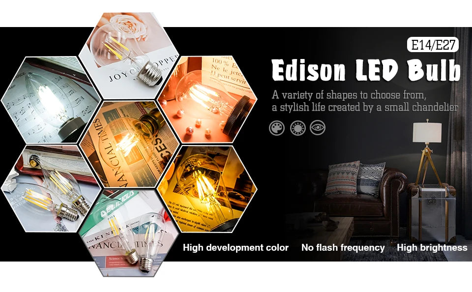 Illuminate your space with these stylish LED Edison Filament Light Bulbs, perfect for adding a vintage touch to any room. These energy-efficient bulbs offer a warm or cool glow and are designed to last over 50,000 hours. With a 360° beam angle, these bulbs provide even lighting across an area of 3-8㎡. Available in various shapes and sizes, including C35, A60, and ST64, they fit into standard E27 and E14 bases. Enjoy the aesthetic of classic filament bulbs with modern LED technology, making them a perfect addition to your living room or favorite space.