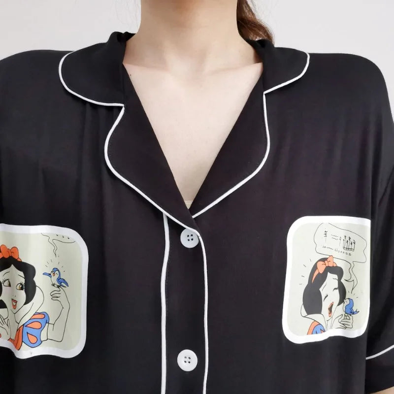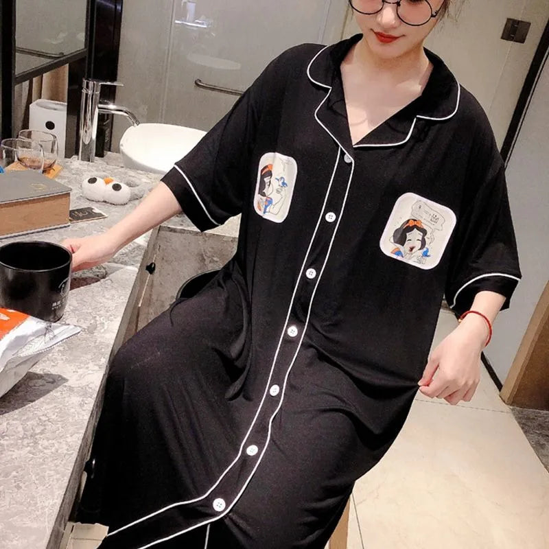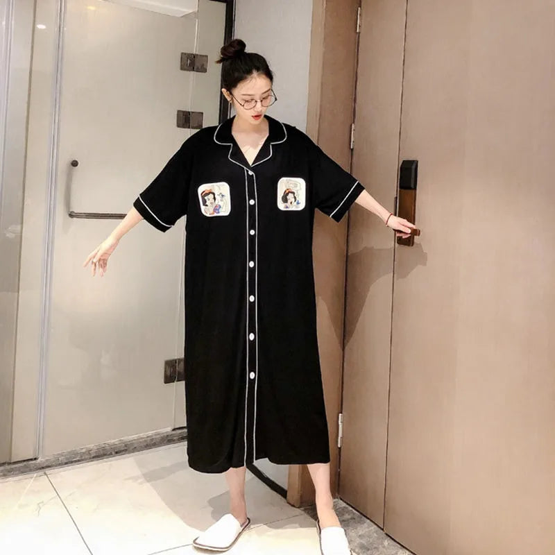 Unlock the perfect blend of comfort and style with this chic nightgown, perfect for youthful spirits aged 18-25. Crafted from soft polyester, the knit fabric ensures a breathable experience, ideal for summer nights. Its elegant mid-calf length and straight skirt design offer a relaxed fit, while the playful cartoon pattern adds a touch of fun. Featuring a turn-down collar and convenient pockets, this nightgown combines functionality with flair. Enjoy a peaceful night's sleep with its lightweight and thin material, tailored for a cool and cozy wear.