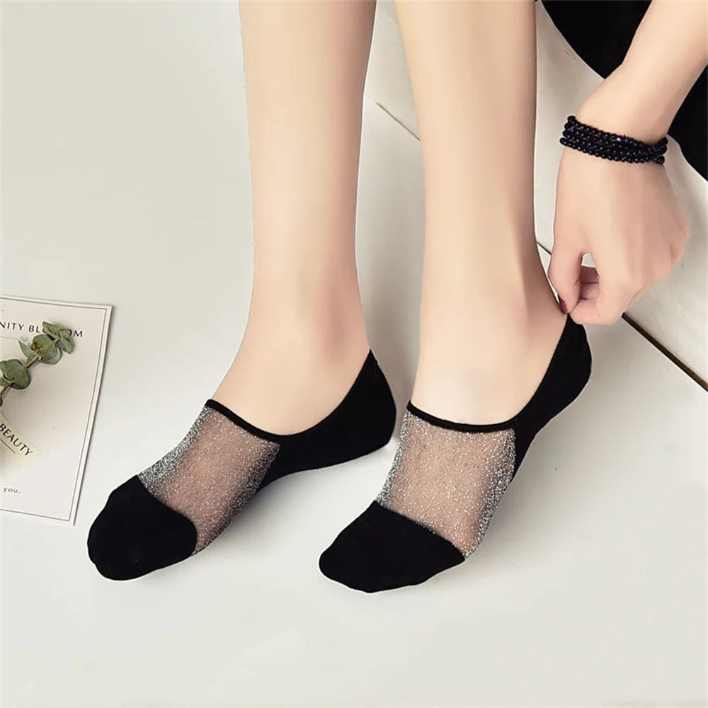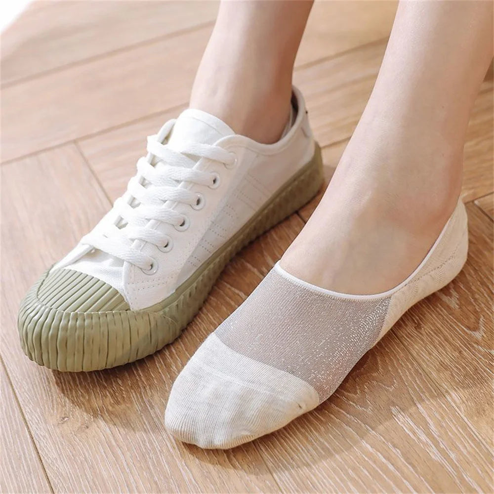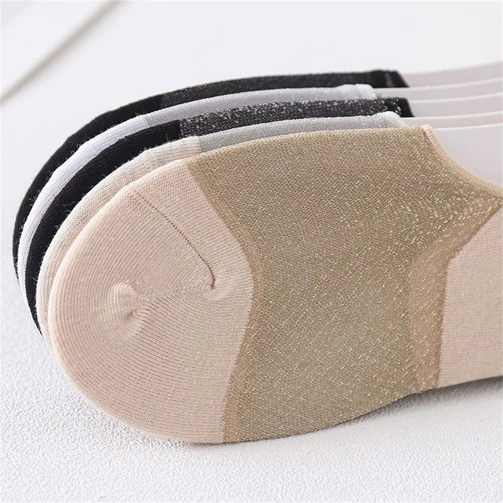 Elevate your comfort with these ultra-thin, transparent crystal silk socks. Designed for women, these invisible boat socks are ideal for spring and summer. The blend of nylon with a cotton sole ensures maximum comfort and breathability. Featuring an anti-slip design, these socks provide secure footing without compromising on style. Available in a variety of colors such as black, white, khaki, and gray, they fit EU sizes 36-41. Each package includes five pairs, all packed conveniently for easy access.