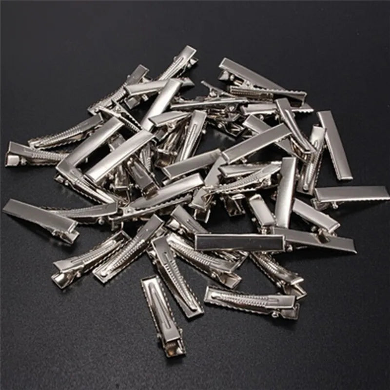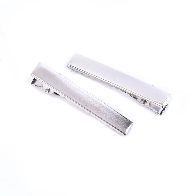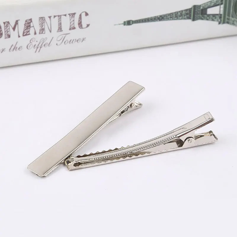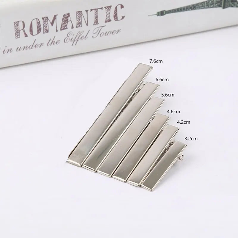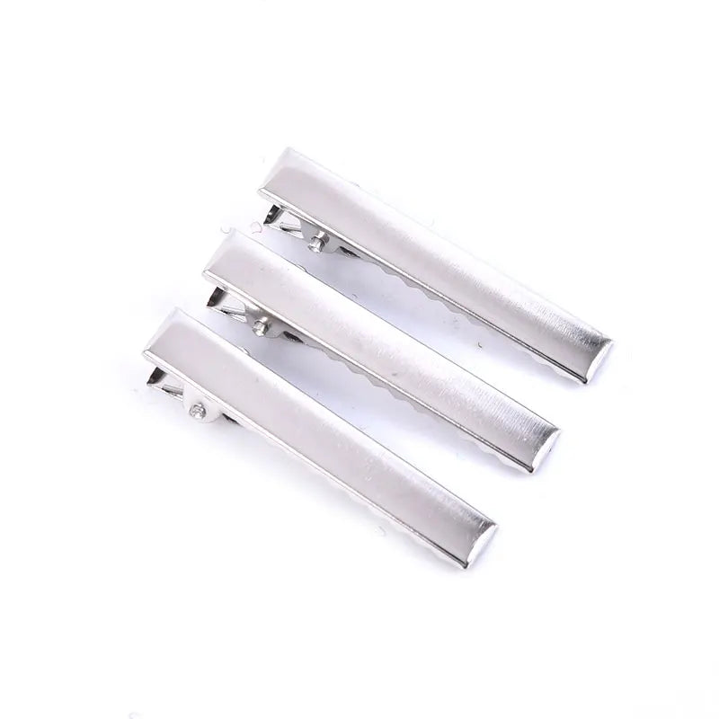 Enhance your collection of hair accessories with these versatile alligator hair clips. Crafted from nickel-plated plastic, these clips are both sturdy and elegantly designed. Available in silver, they come in six different sizes: 7mm wide and lengths of 32mm, 42mm, 46mm, 56mm, 66mm, and 76mm. Perfect for creating hair bows and other accessories, these clips are a reliable choice for all your styling needs. The package includes 50 pieces, offering plenty of options for customization and creativity.