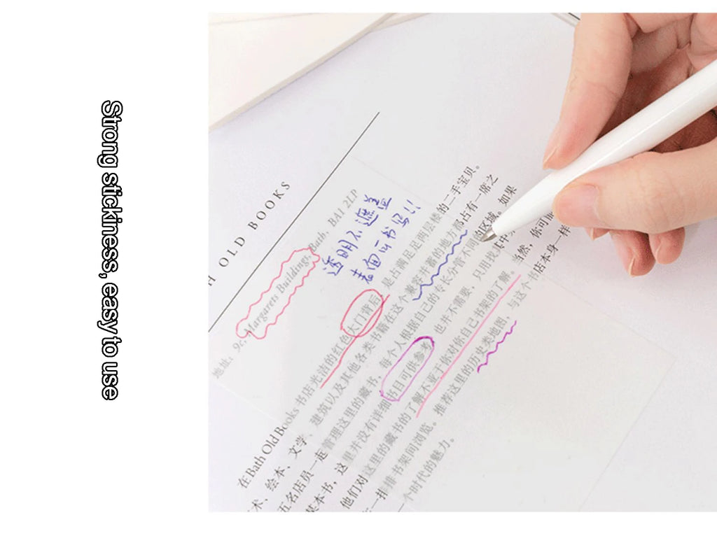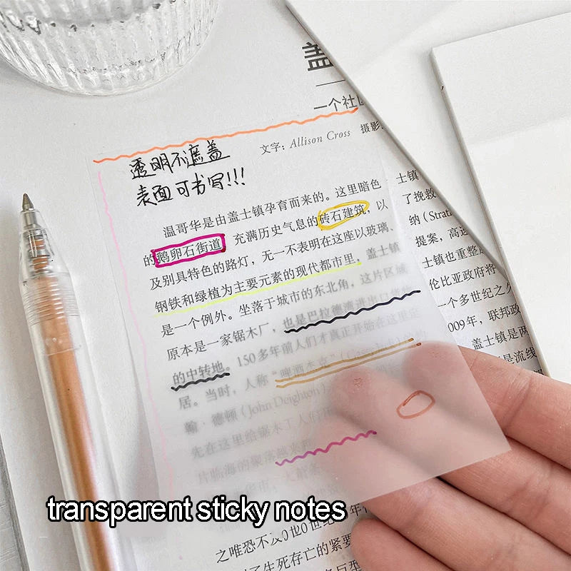 Introducing our versatile transparent sticky notes, perfect for adding a touch of organization to your study or office space. Made from high-quality PET material, these self-adhesive notes are ideal for planners, memos, and sketchbook annotations. Whether you're at school, work, or home, these sticky notes offer a clear way to highlight important information without covering up the details. Available in medium, large, and small sizes, each set includes 50 sheets per book, providing ample space to jot down notes or reminders. Elevate your stationery collection with these cute and functional memo pads.