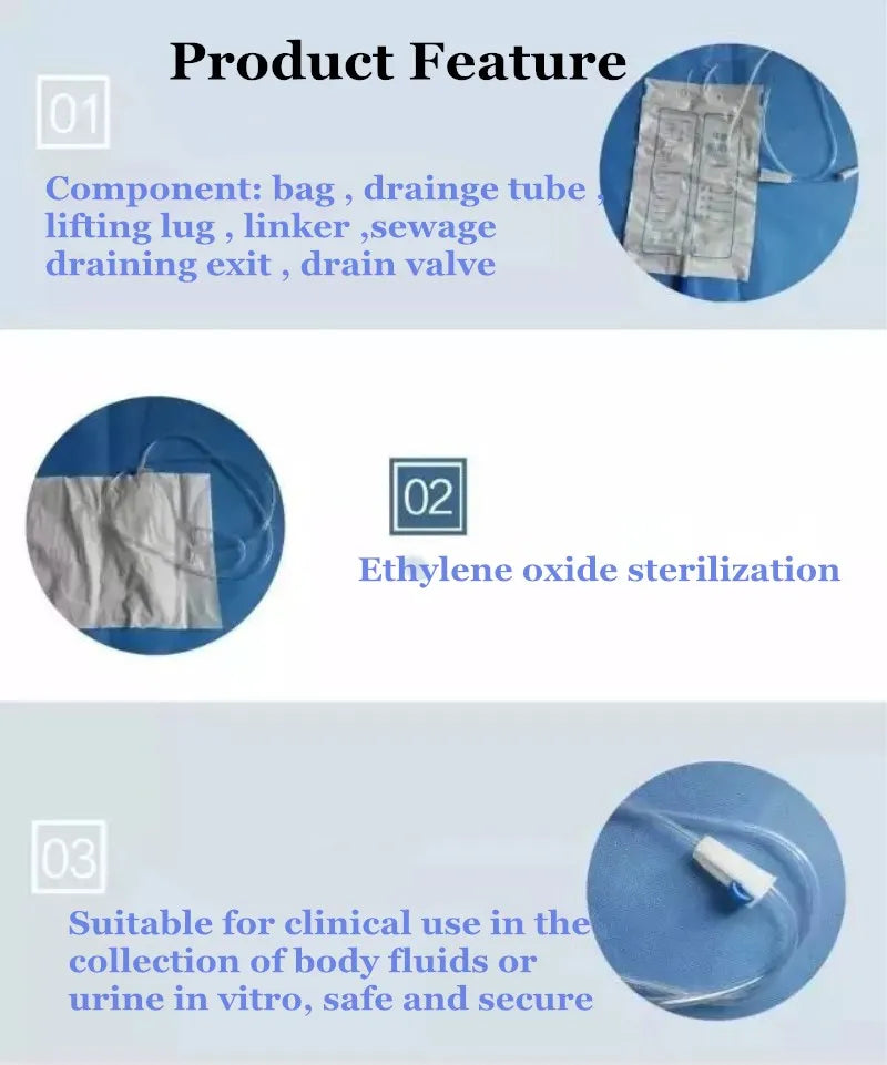 The urine bag includes essential components such as a drainage tube, lifting lug, linker, sewage draining exit, and drain valve, all packed in a sterile package to ensure hygiene and safety. The tapered head design allows compatibility with various catheters, making it versatile for diverse medical needs. Additionally, the 90cm tube provides ample length for comfortable use, and the observation line ranges from 50ml to 1000ml for easy monitoring.
