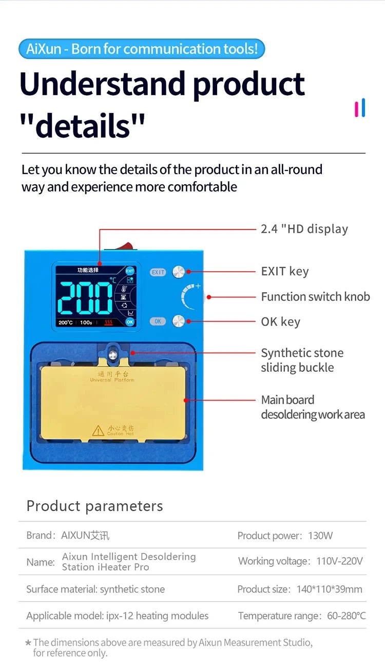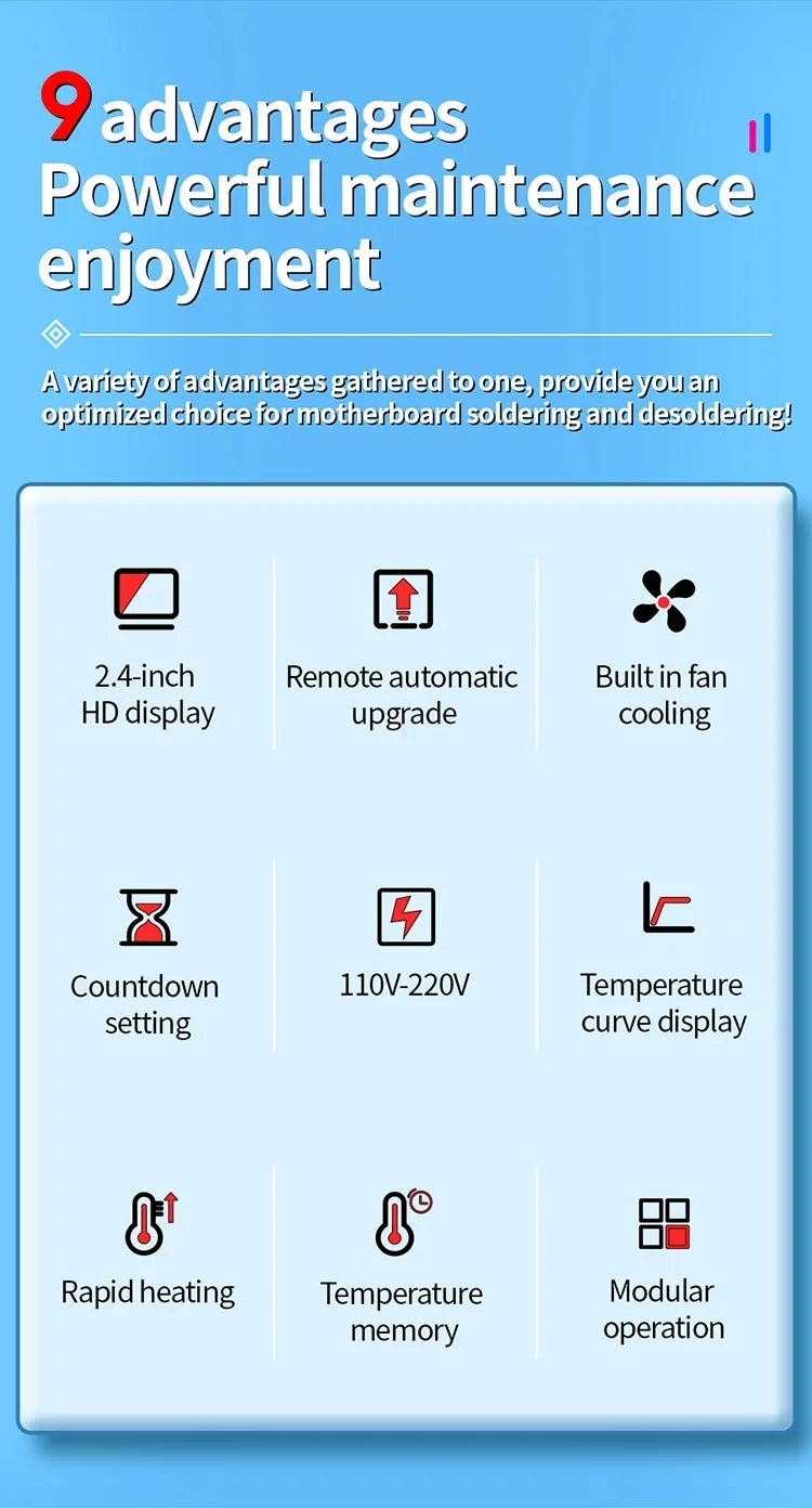 - Suitable for motherboard layered repairs, degumming, heating desoldering