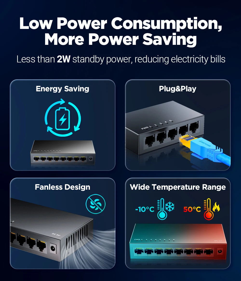- Low Power Consumption: Energy-efficient design with less than 2W standby power.