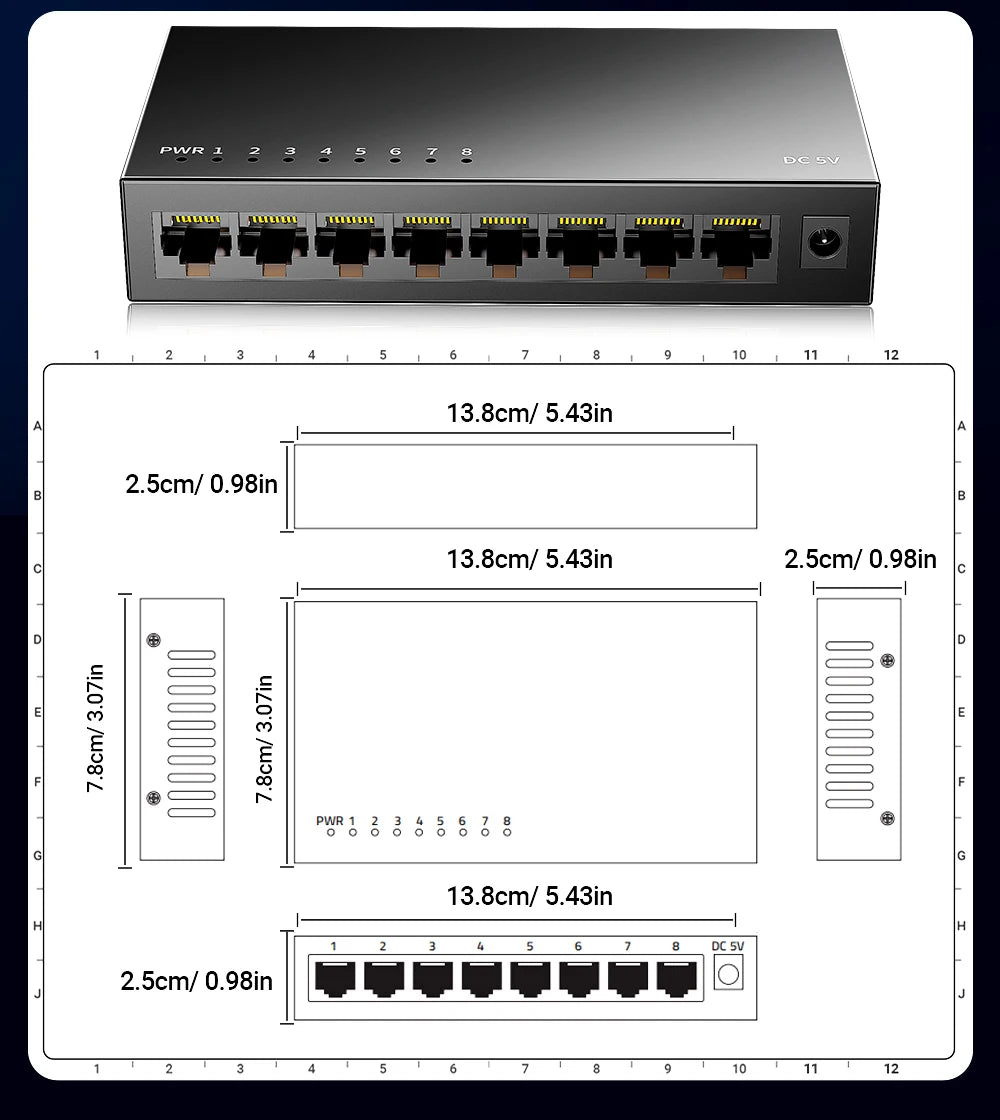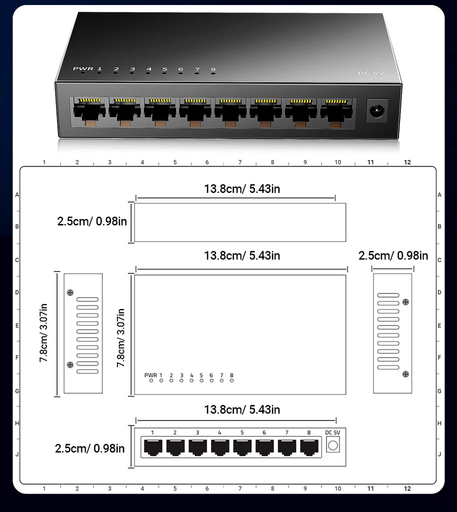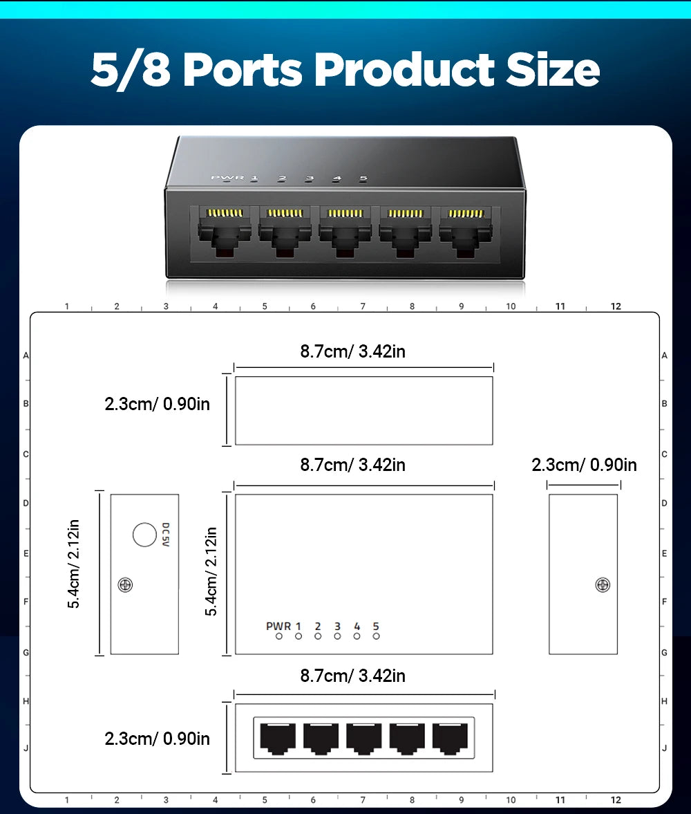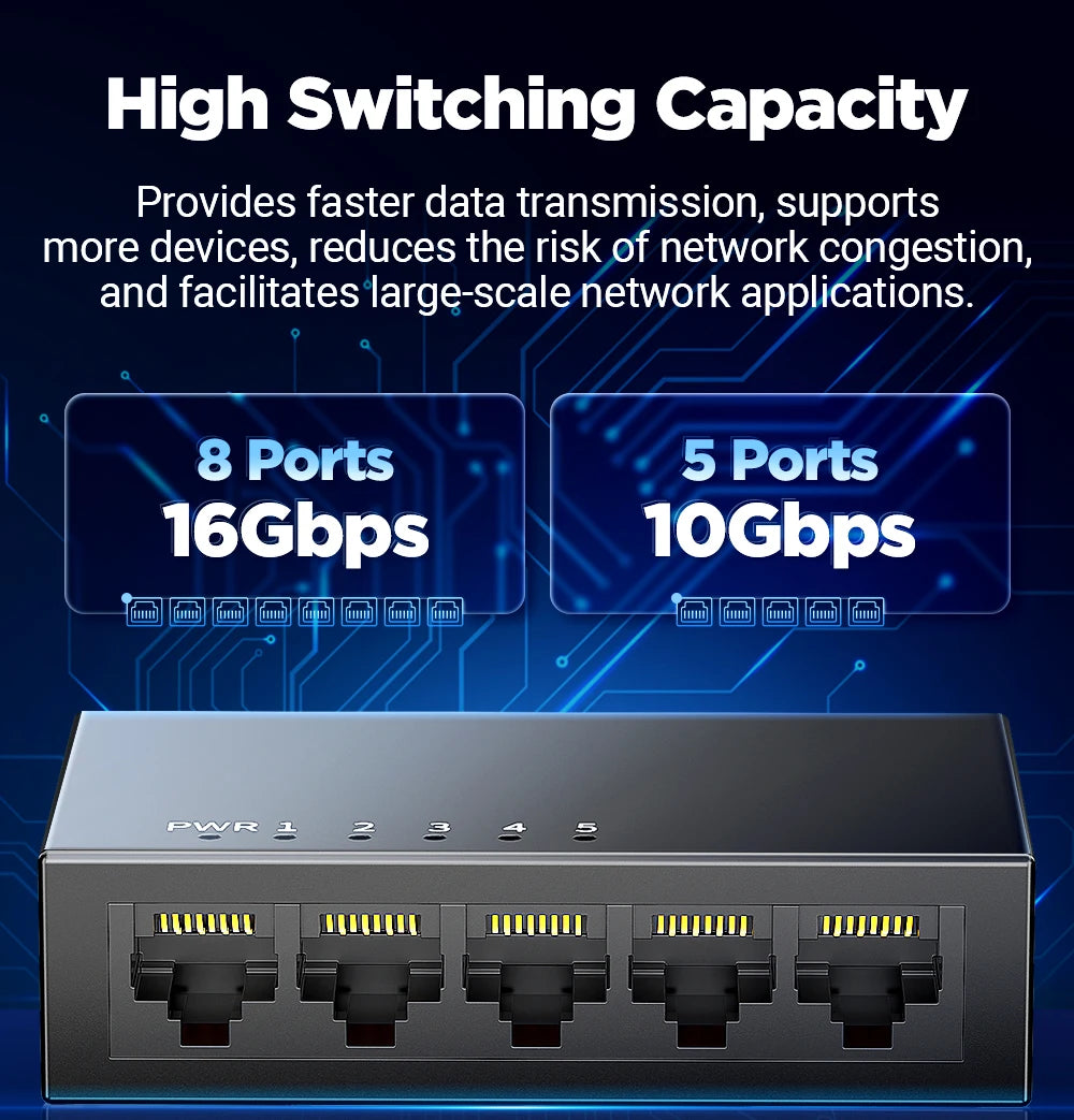 - Switching Capacity: 16Gbps@8 Ports, 10Gbps@5 Ports.