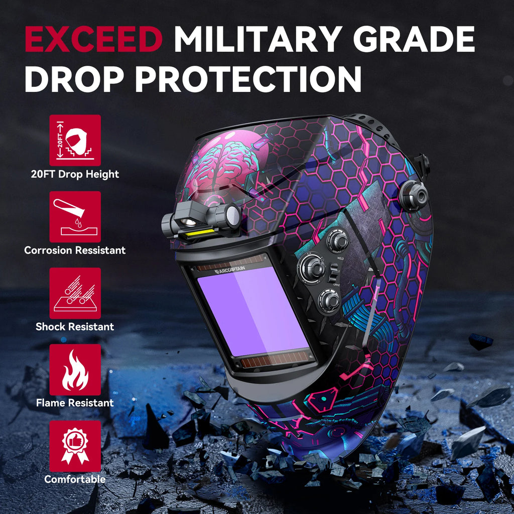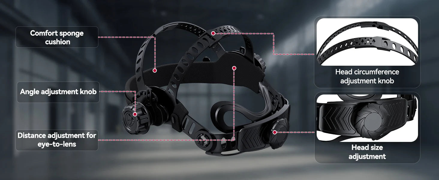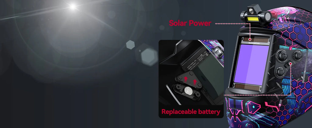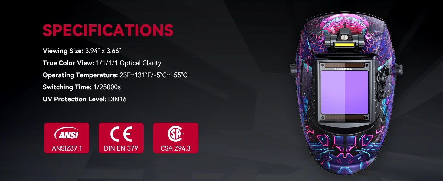 This welding helmet is powered by dual solar panels and a robust CR2450 lithium battery, ensuring longer usage and durability. Made from flexible PP material, it weighs just 1 lb, featuring adjustable, ergonomic headgear with breathable padding for superior comfort during extended periods of use.
