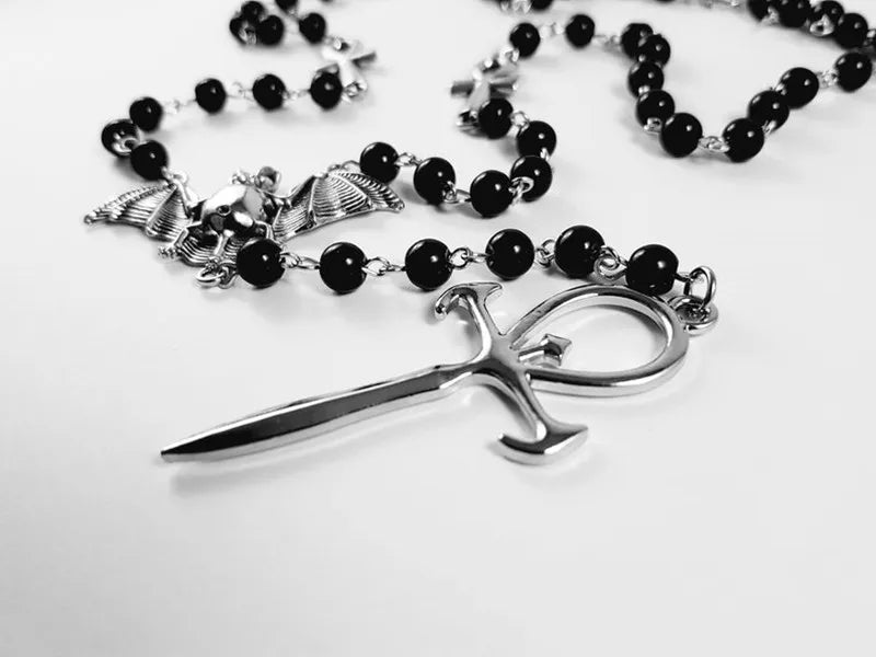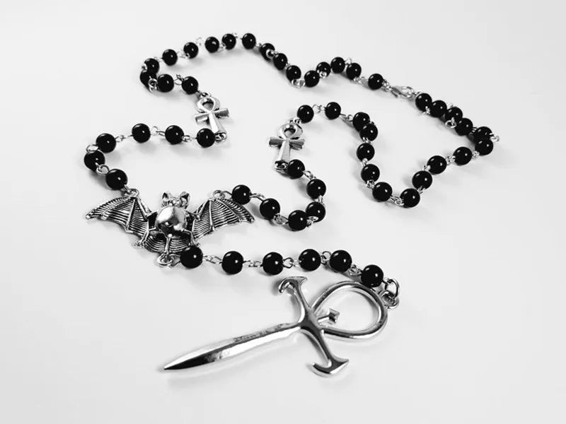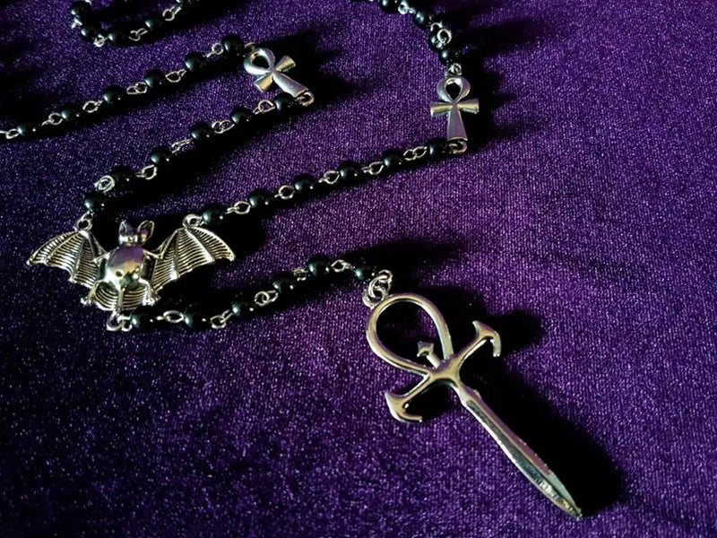 Gothic Bead Necklace Vampire Ankh Rosary Pendant Bat Cross Occult Emo Punk Necklace