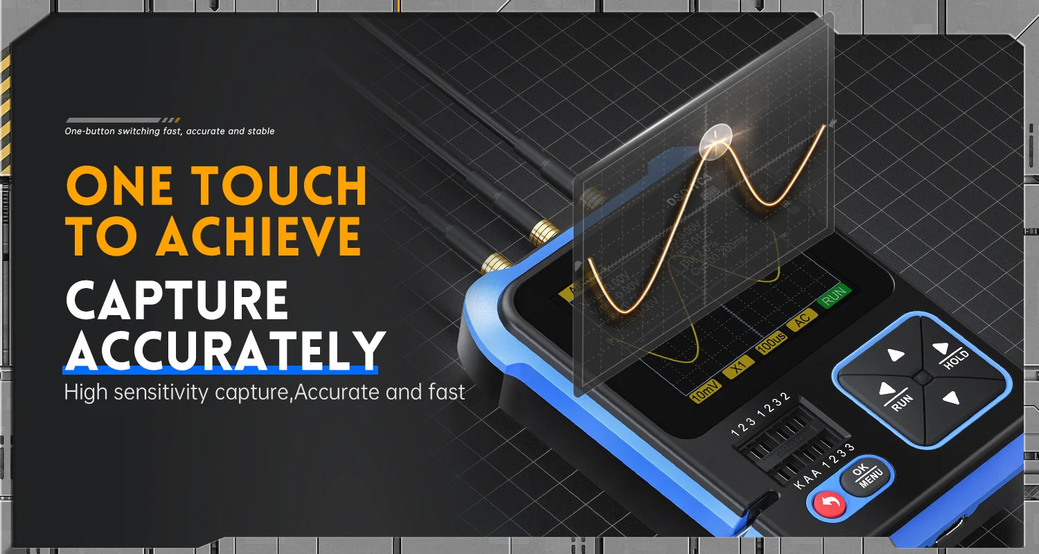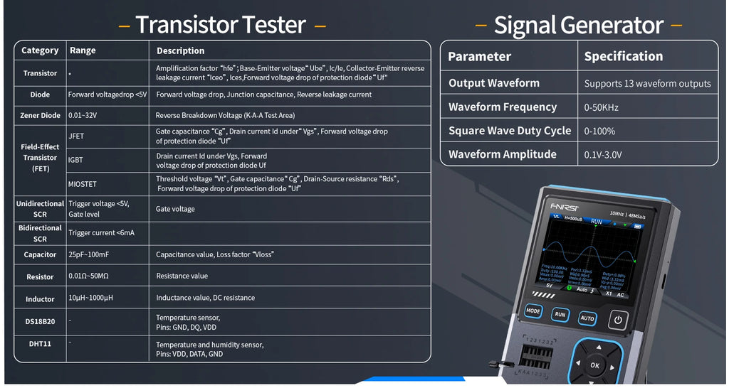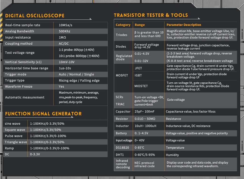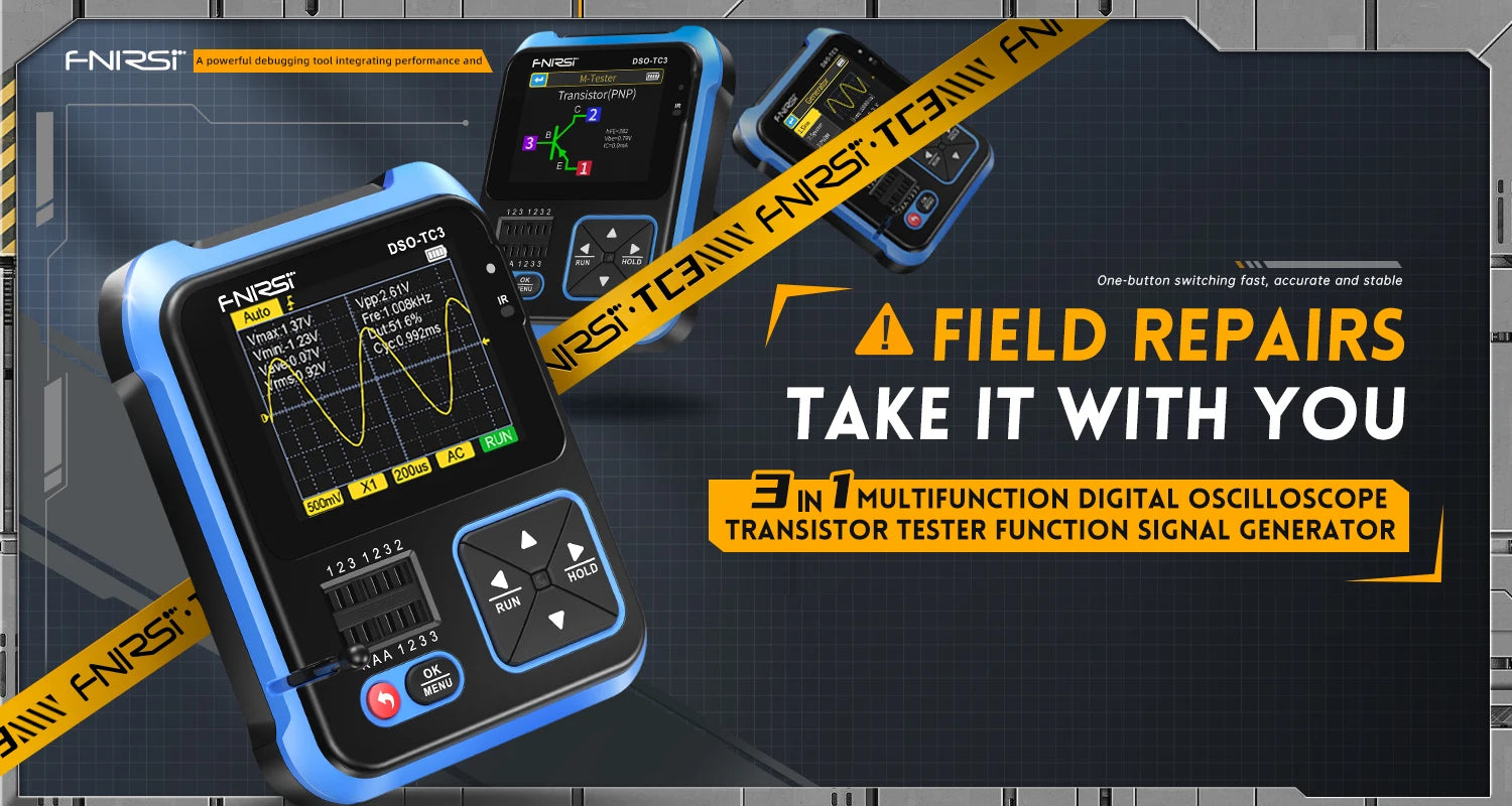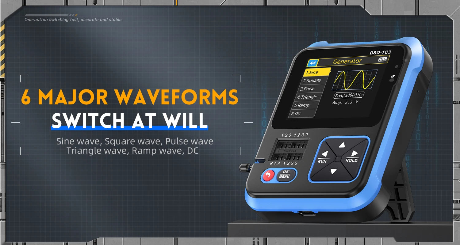 This versatile device is an essential tool for technicians, combining multiple functionalities into a portable and intuitive package. Ideal for both professional and DIY electronics work, it serves as a digital oscilloscope, transistor tester, and function signal generator, making it perfect for development, repair, and testing tasks.