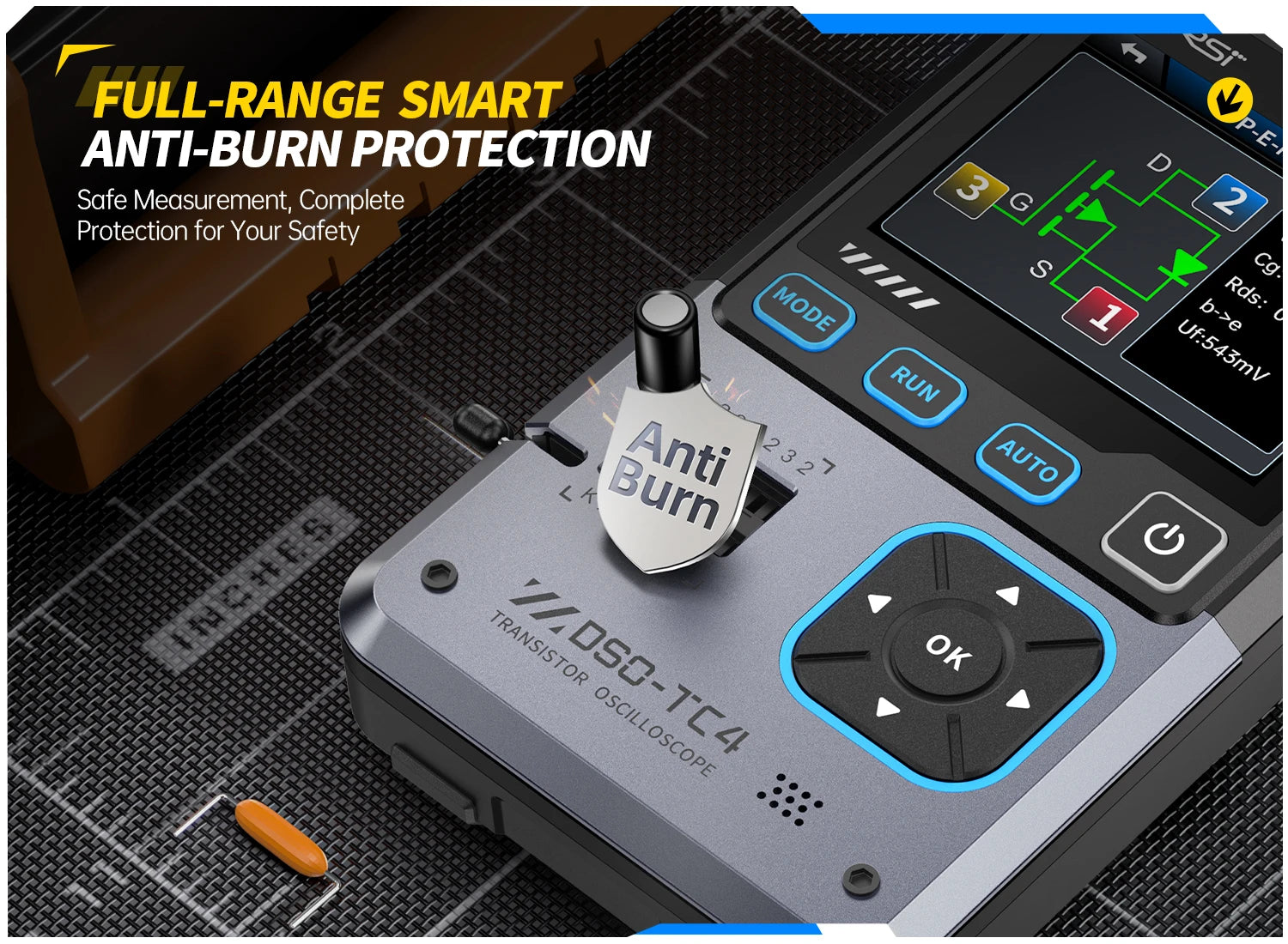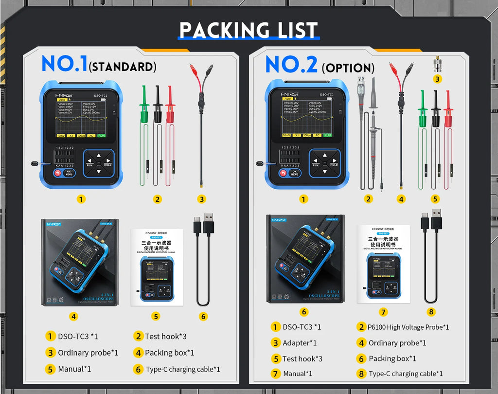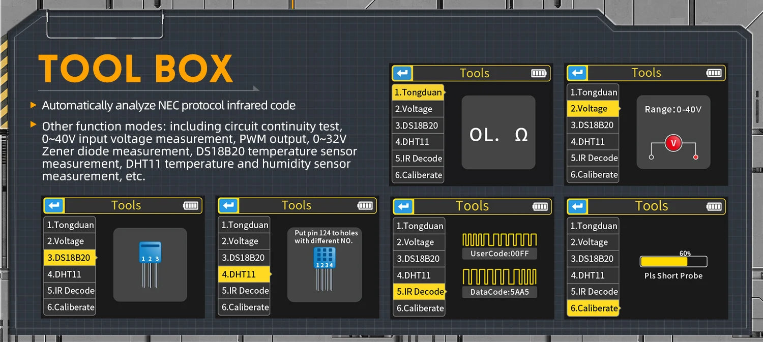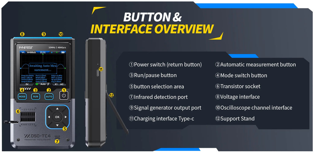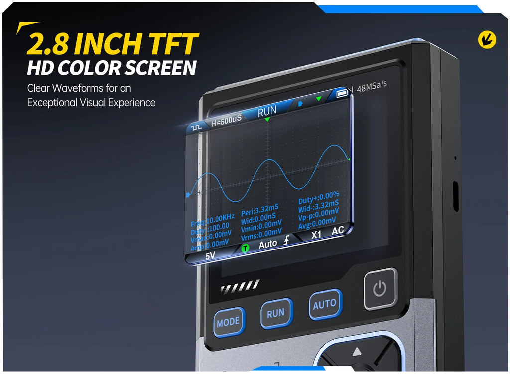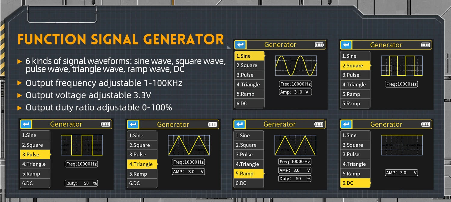 This versatile device is an essential tool for technicians, combining multiple functionalities into a portable and intuitive package. Ideal for both professional and DIY electronics work, it serves as a digital oscilloscope, transistor tester, and function signal generator, making it perfect for development, repair, and testing tasks.