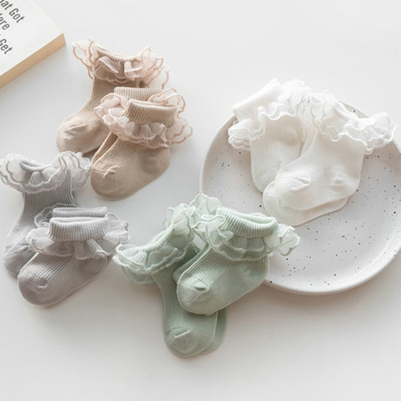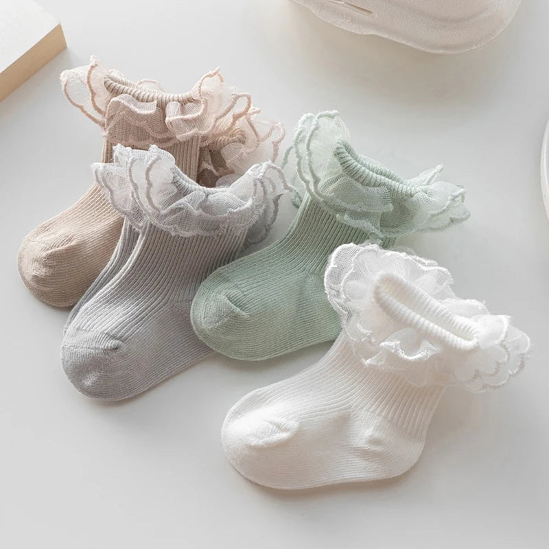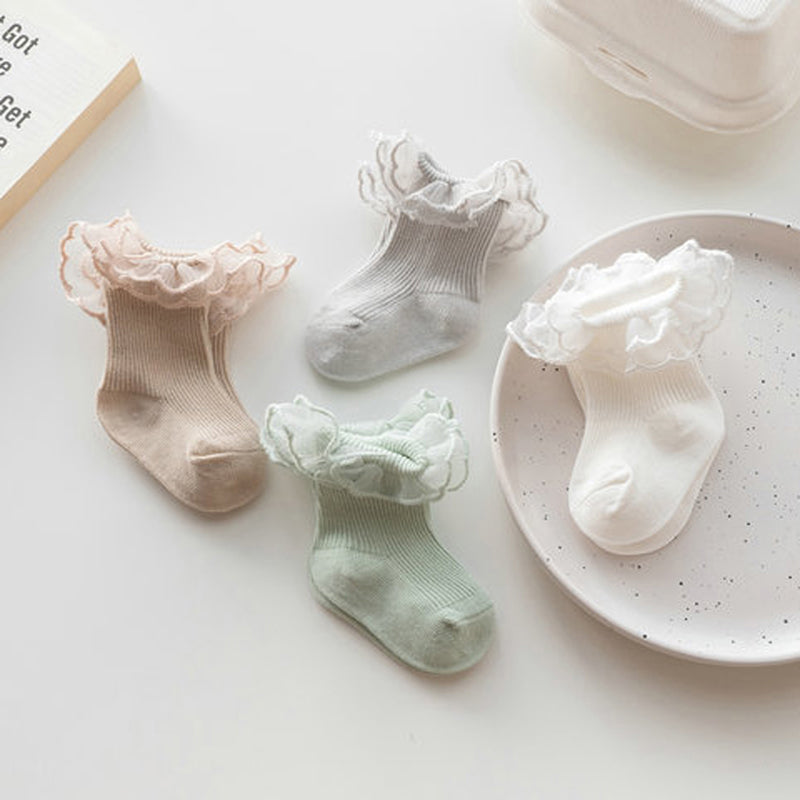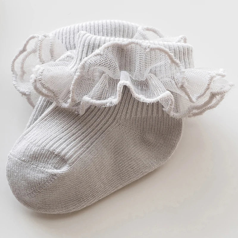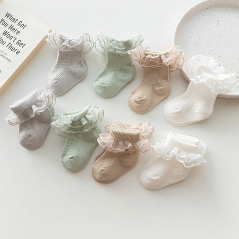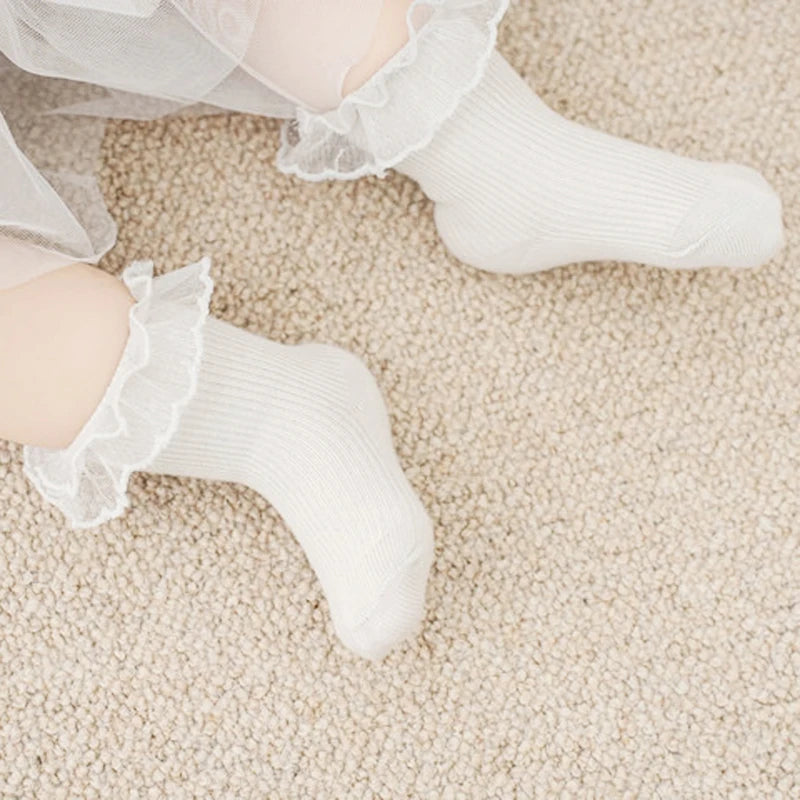 Enhance your little one's wardrobe with these adorable Baby Socks, featuring charming lace ruffles and an anti-skid design. Perfect for any season, these socks are crafted from a soft cotton blend, ensuring comfort and breathability for your baby. Suitable for both infants and toddlers, these socks are designed to stay on securely, making them ideal for active little ones.