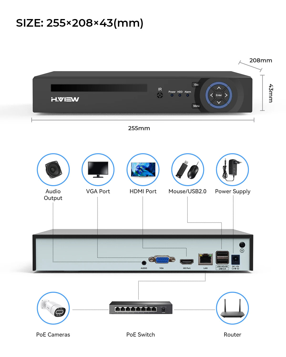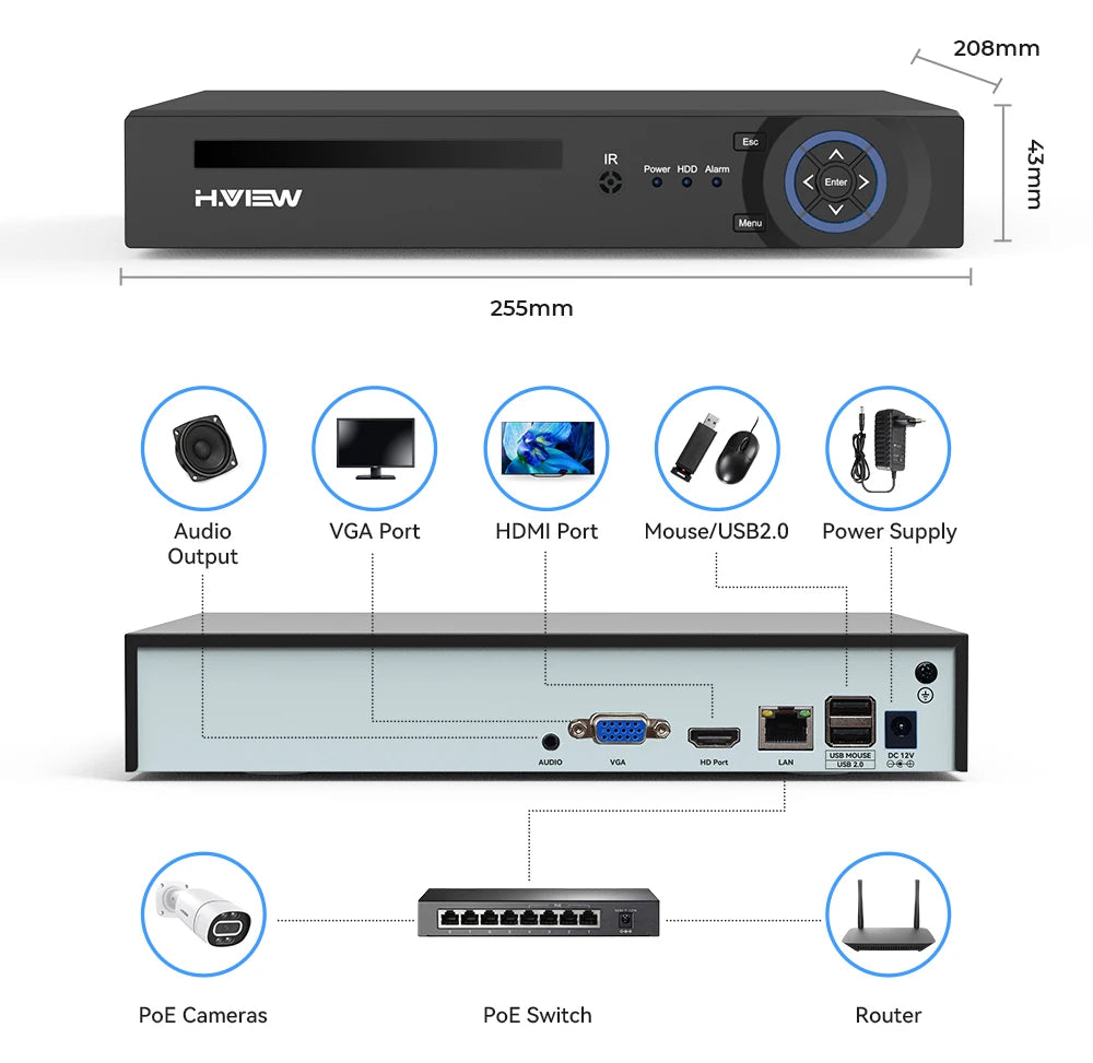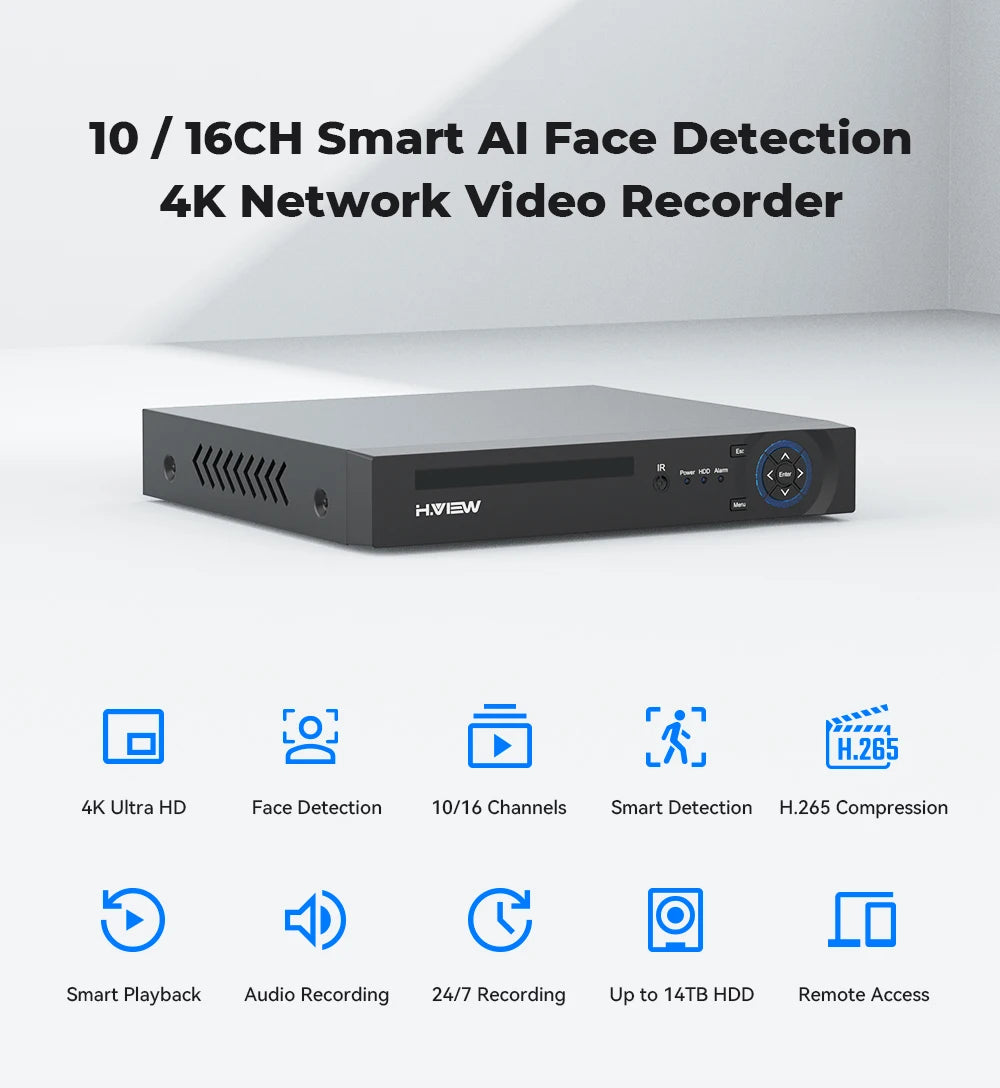 Upgrade your security with the H.VIEW NVR system, a reliable choice for those who require dependable video surveillance with intelligent features. Compatible with smart AI detection cameras for enhanced monitoring efficiency.