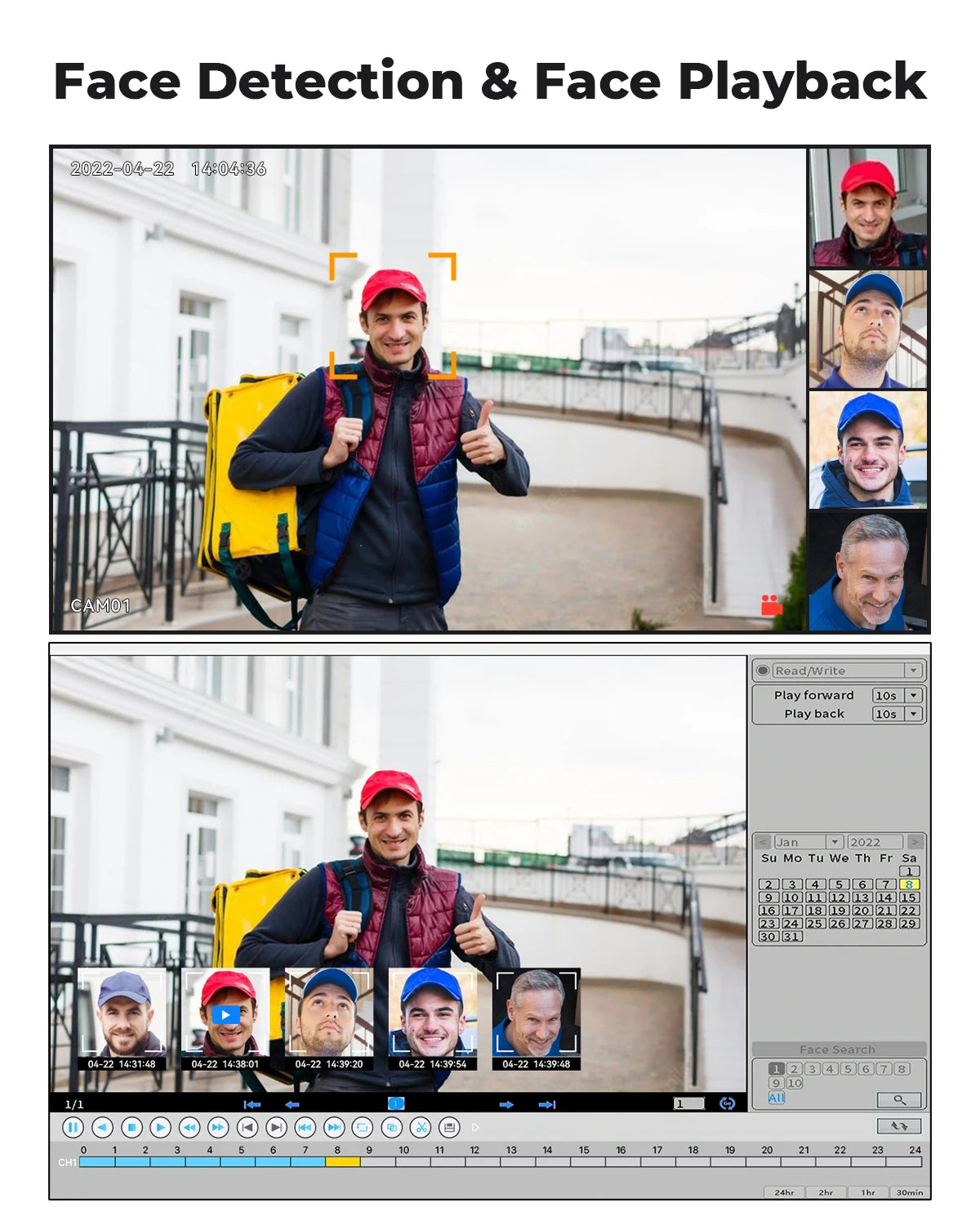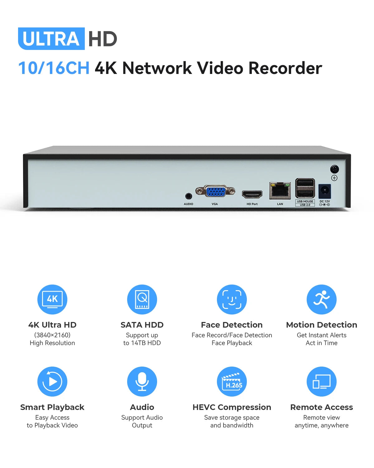 4K 8MP ONVIF 2.4 NVR 16CH Face Detect CCTV Security Network Video Recorder for IP Cameras, P2P Cloud, 24/7 Recording