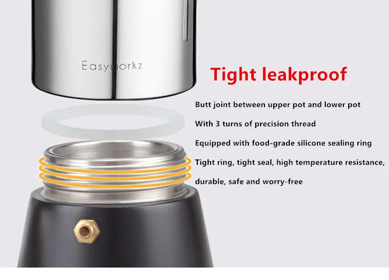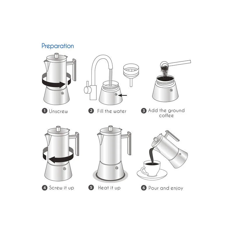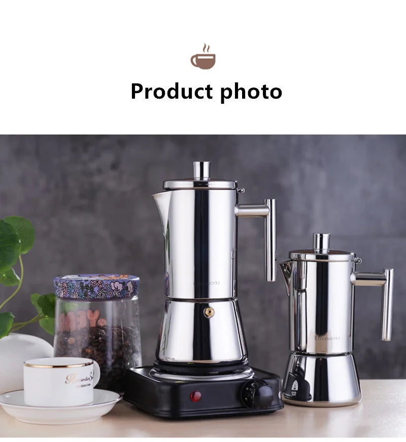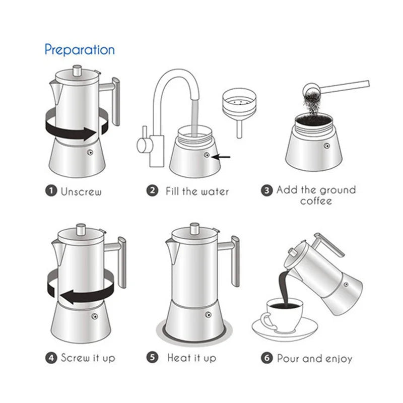 Introducing the versatile and elegant Moka Pot, designed for coffee enthusiasts seeking a rich and aromatic brew. Crafted from high-quality 304 stainless steel, this durable and safe coffee maker exudes both elegance and functionality. The Moka Pot features a finely pressed, three-layer filter mesh, ensuring a refined and fragrant extraction every time.