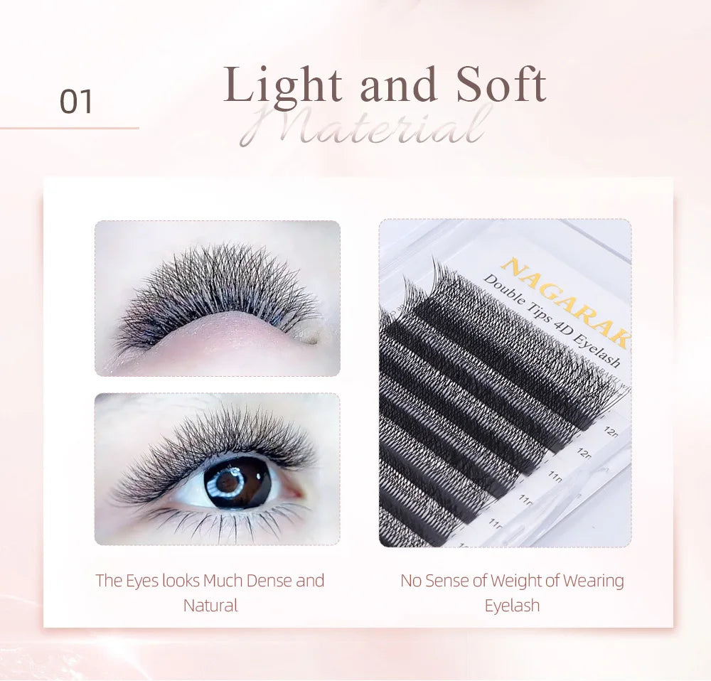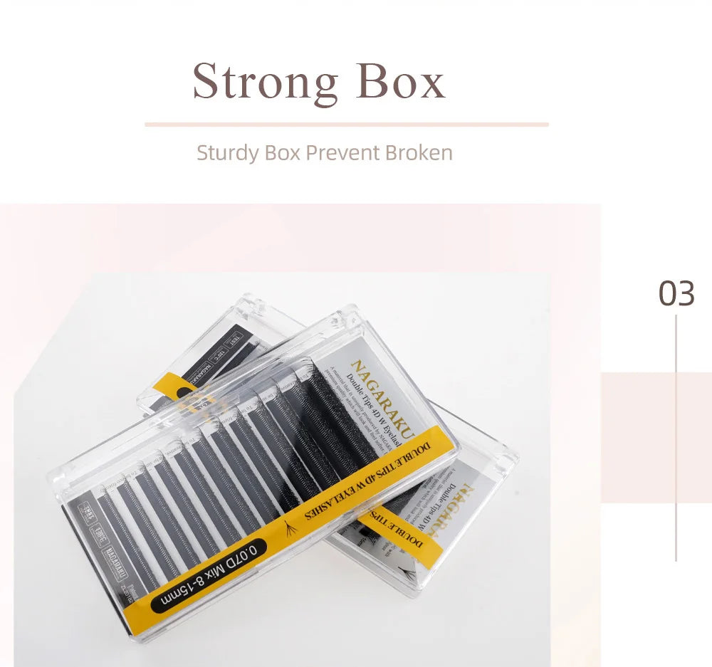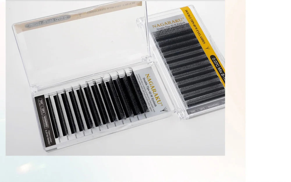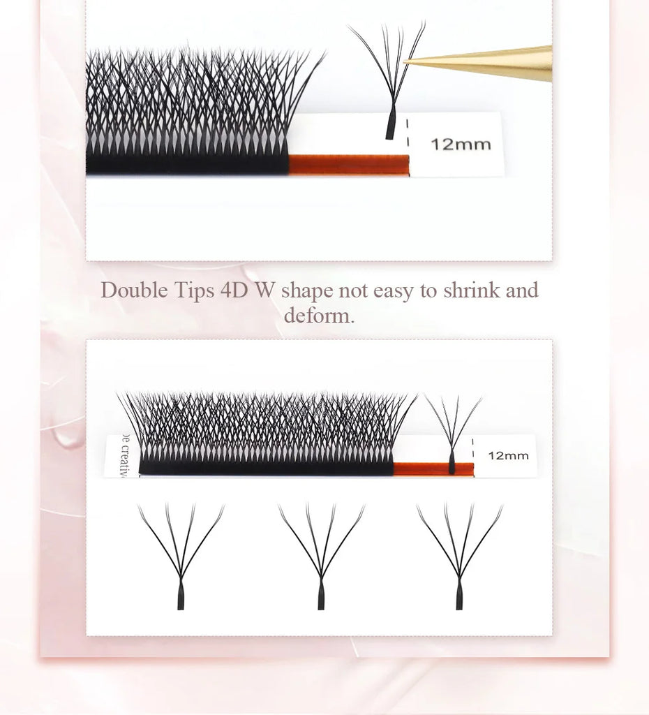 Elevate your beauty routine with our Double Tips 4D W Eyelash Extensions. Crafted from premium synthetic fibers, these lashes provide a captivating, voluminous look perfect for any occasion. The innovative 4D W design ensures a seamless, salon-quality finish, enhancing your eyes effortlessly. Enjoy easy application and removal, all packaged in chic silver foil for convenience and hygiene.