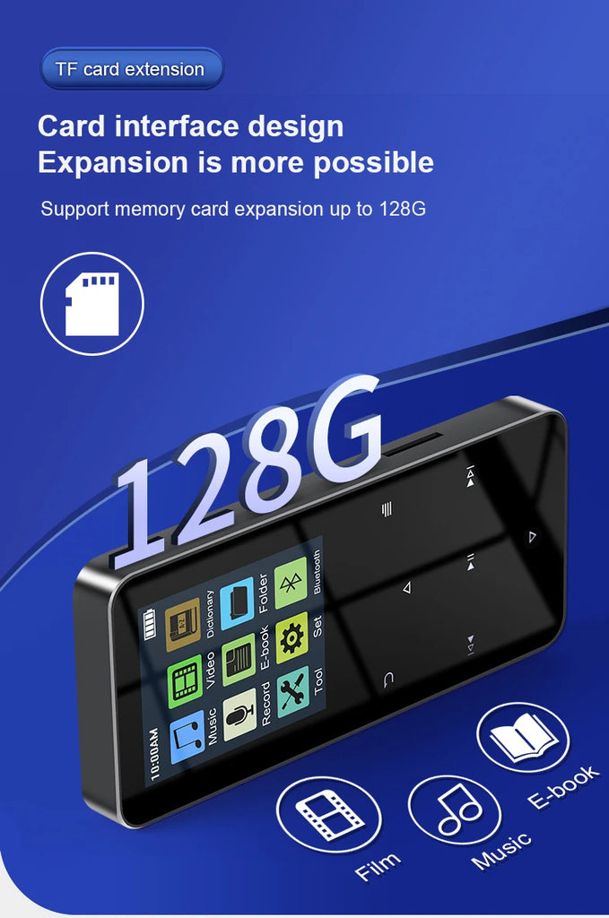 2" Metal Touch MP3 MP4 Music Player, Bluetooth 5.0, FM Radio, Alarm, E-book, Card Support