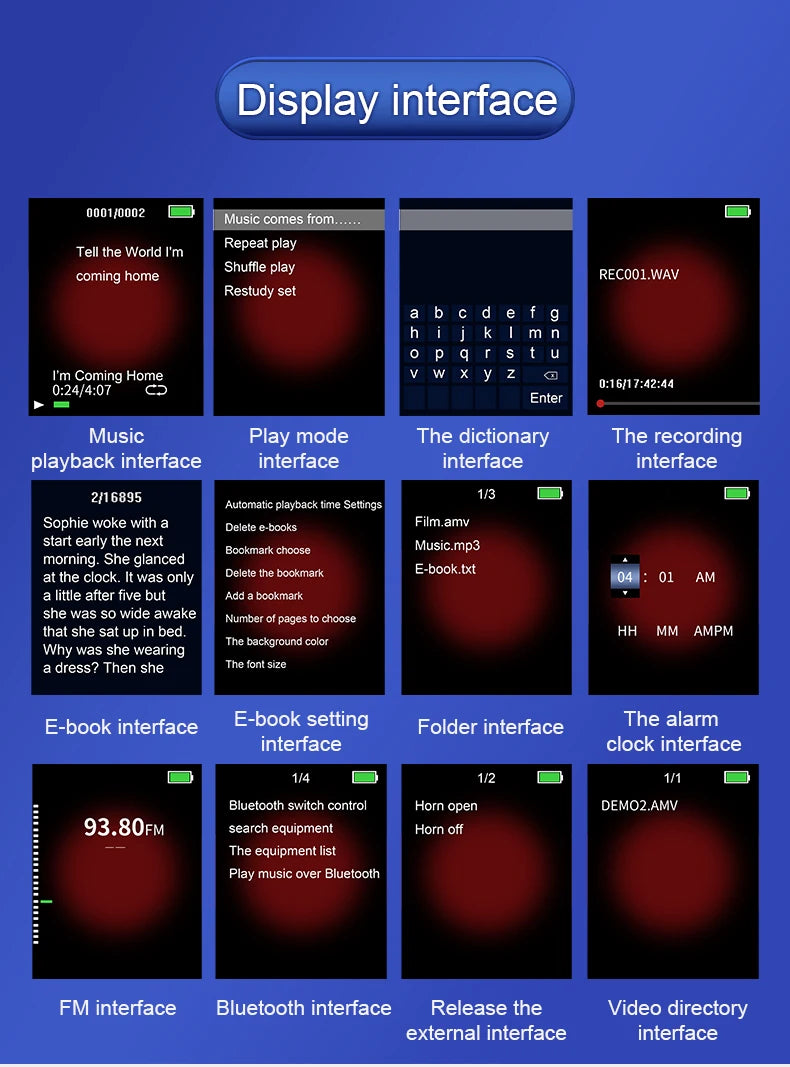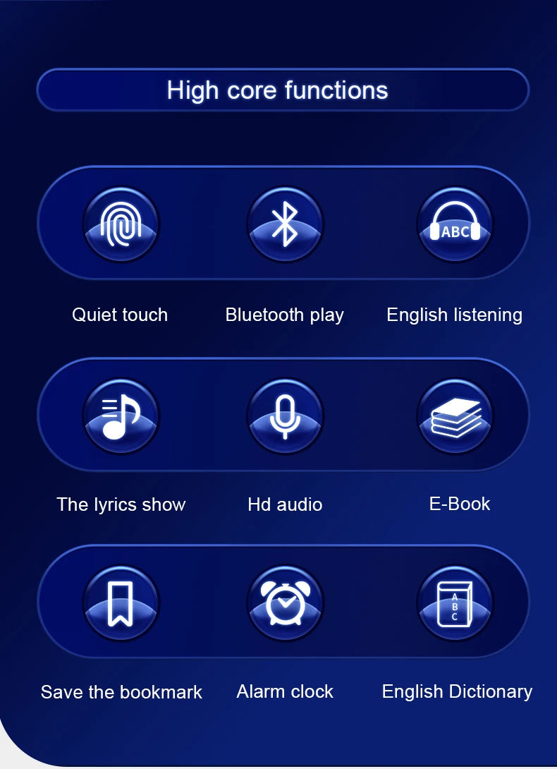 This versatile device also includes an FM radio, e-book capabilities, and a recording function for flexibility in entertainment and learning. The smart e-book reader enriches your experience with customizable fonts and backgrounds, while the music alarm clock ensures you wake up to your favorite tunes.