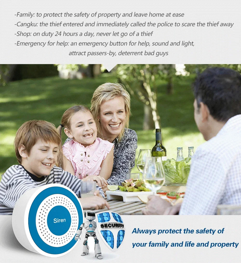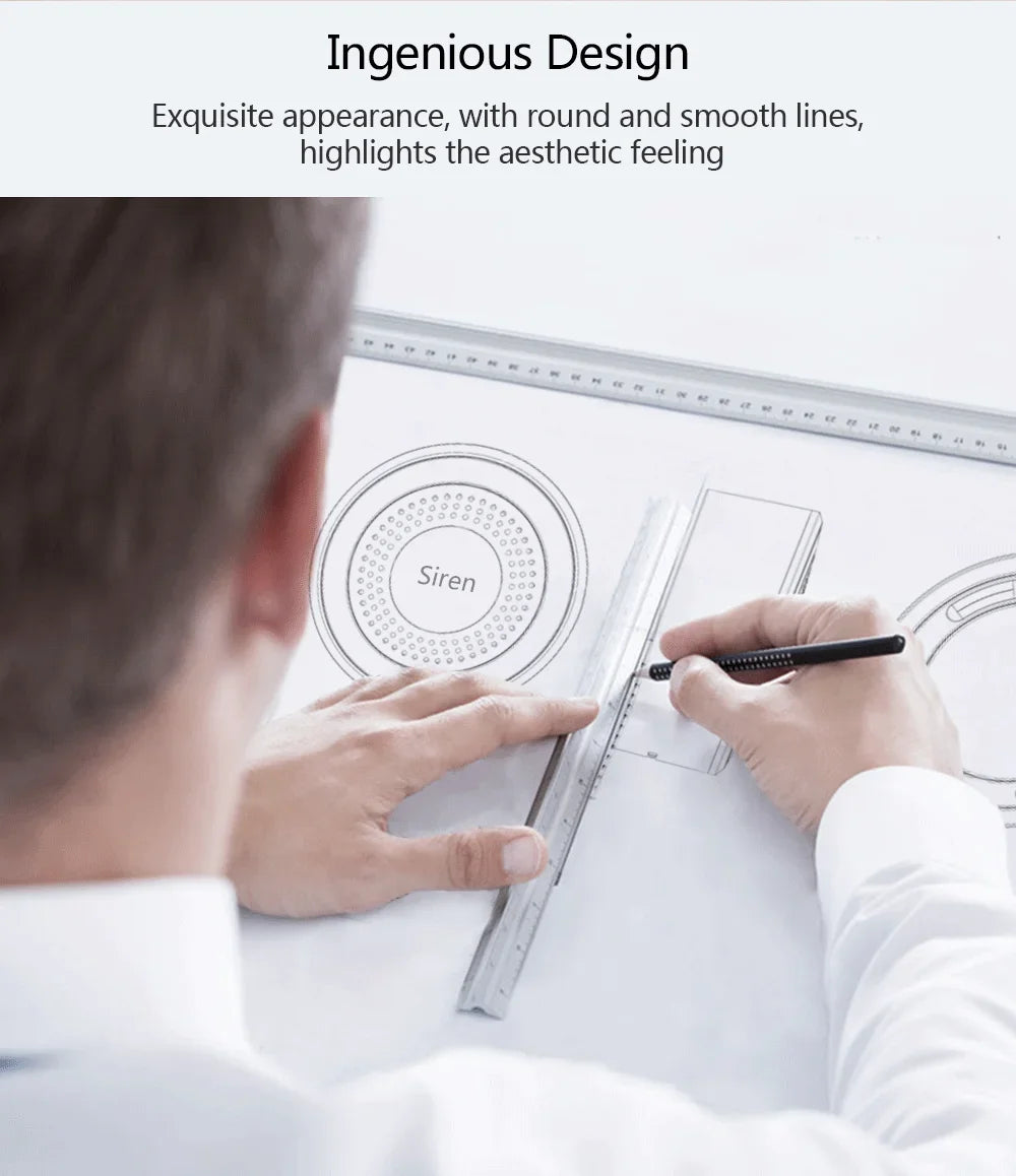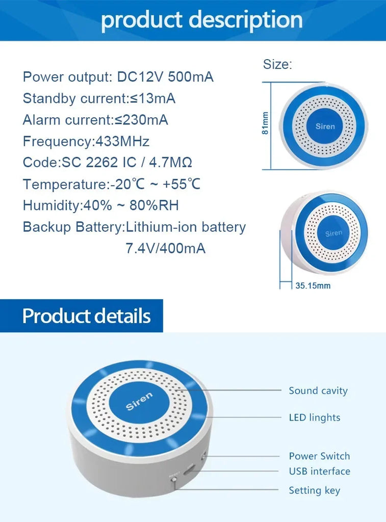 Equipped with a backup 7.4V/400mA lithium-ion battery, the device maintains functionality even during power outages. Its sound volume ranges from 100-110dB, making it highly effective for security applications. The power output is DC 5V/1A, and the device maintains a low standby current of ≤13mA and an alarm current of ≤230mA, ensuring energy-efficient operation. The product operates without concern for harmful chemicals, emphasizing user safety.