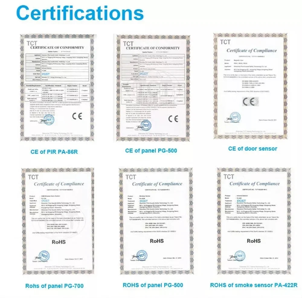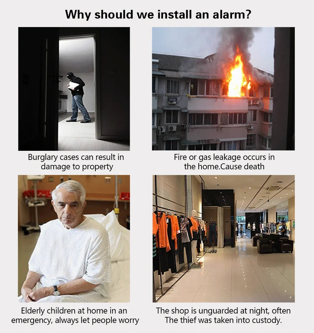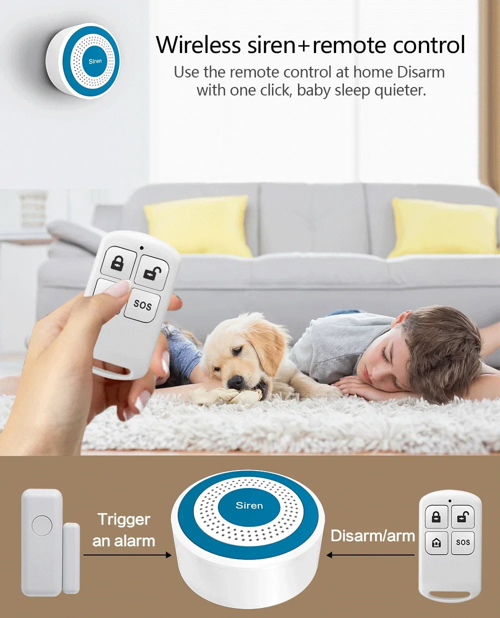 Equipped with a backup 7.4V/400mA lithium-ion battery, the device maintains functionality even during power outages. Its sound volume ranges from 100-110dB, making it highly effective for security applications. The power output is DC 5V/1A, and the device maintains a low standby current of ≤13mA and an alarm current of ≤230mA, ensuring energy-efficient operation. The product operates without concern for harmful chemicals, emphasizing user safety.