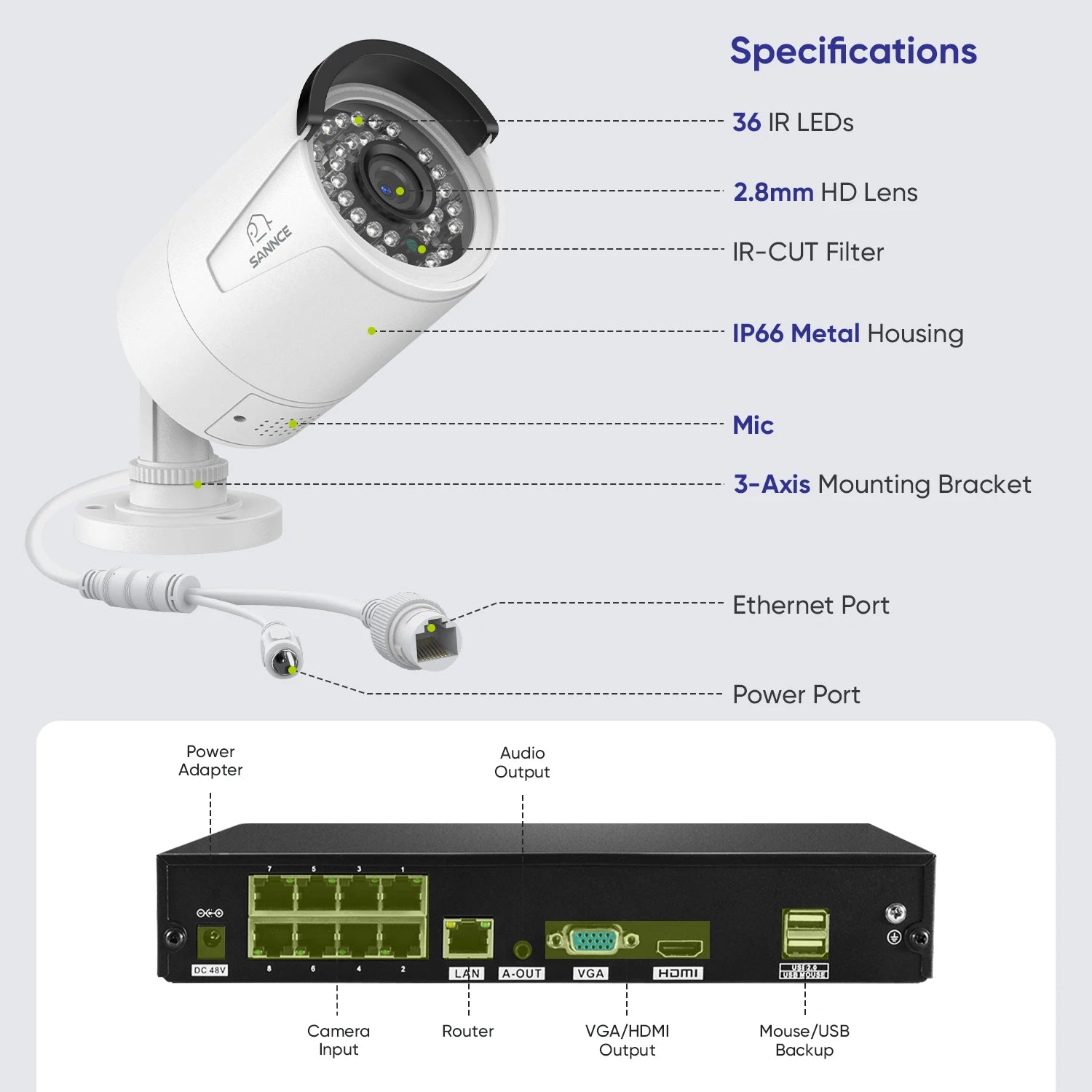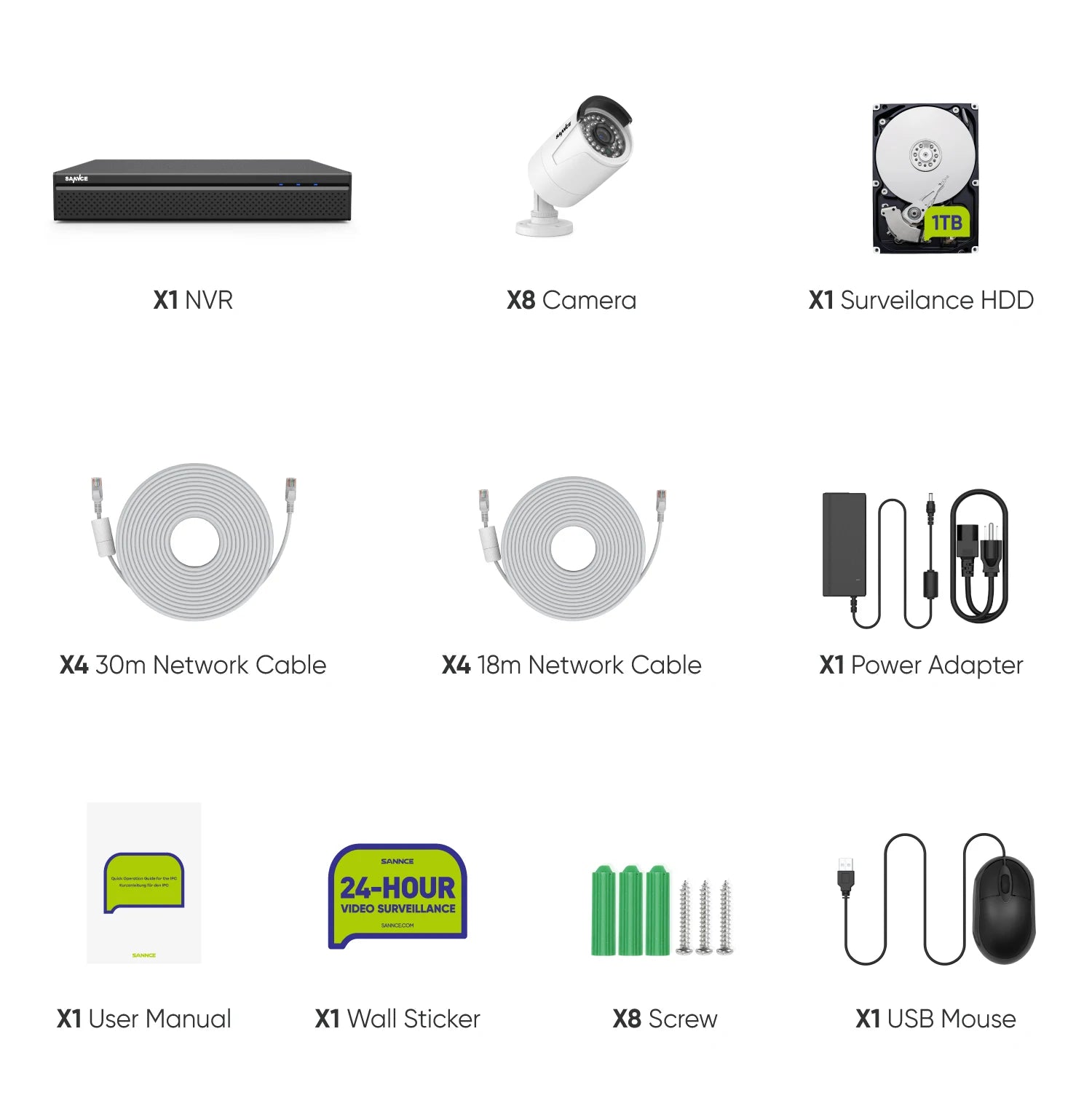 Enhance your security setup with the SANNCE 8MP POE Video Surveillance System. This top-tier CCTV kit delivers pristine 4K Ultra HD resolution, ensuring every detail is captured with clarity, both in live streaming and playback. With ONVIF support, you can easily expand your system with additional POE IP cameras.
