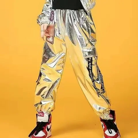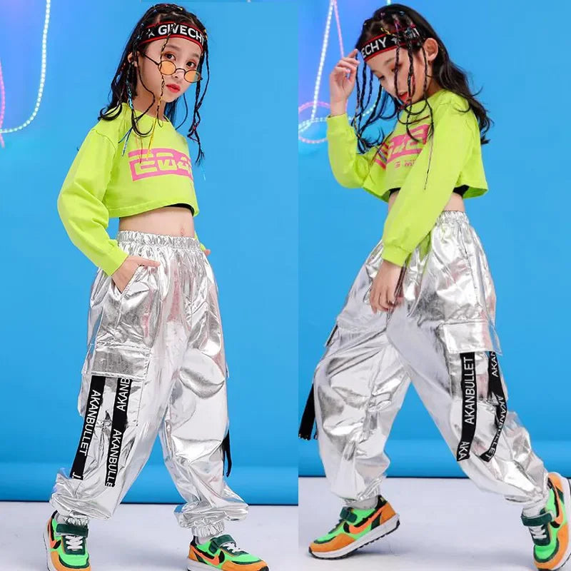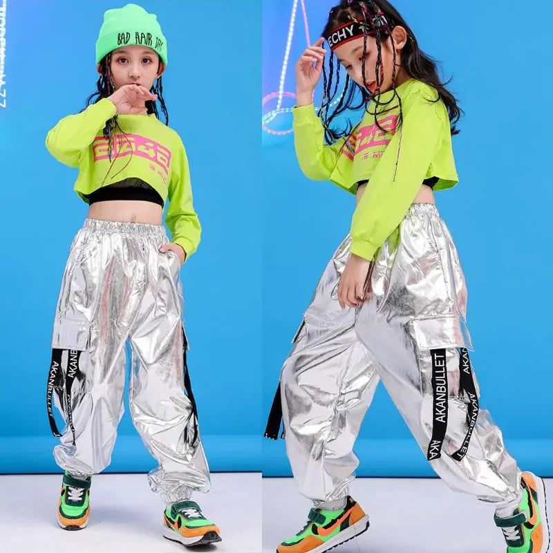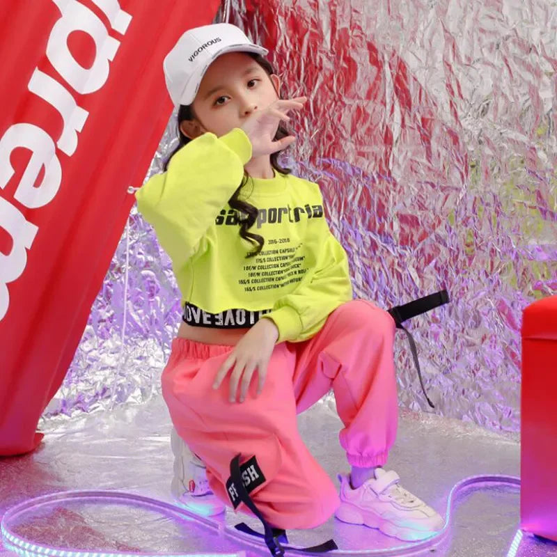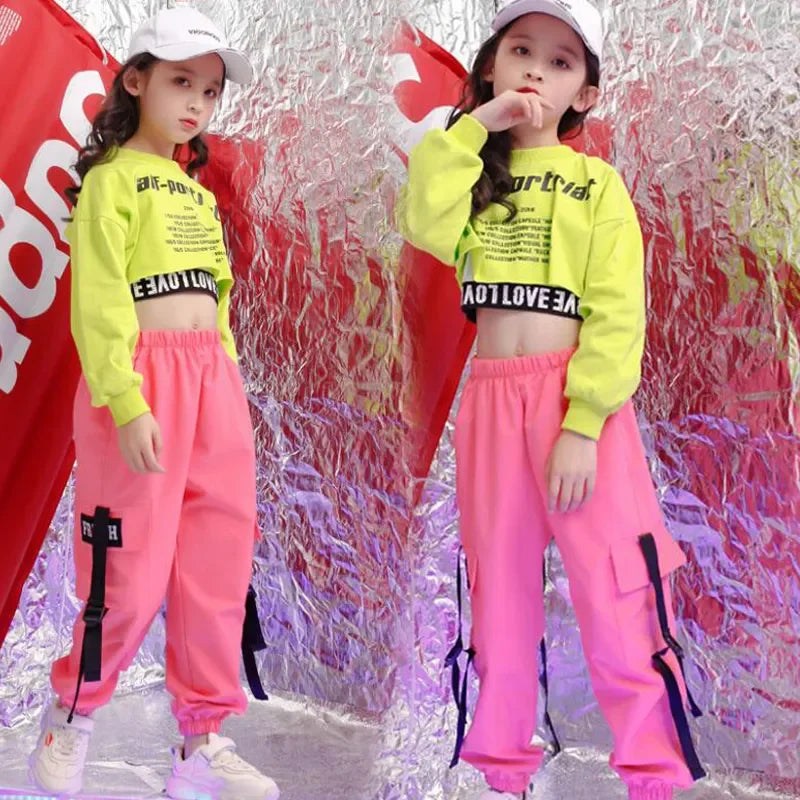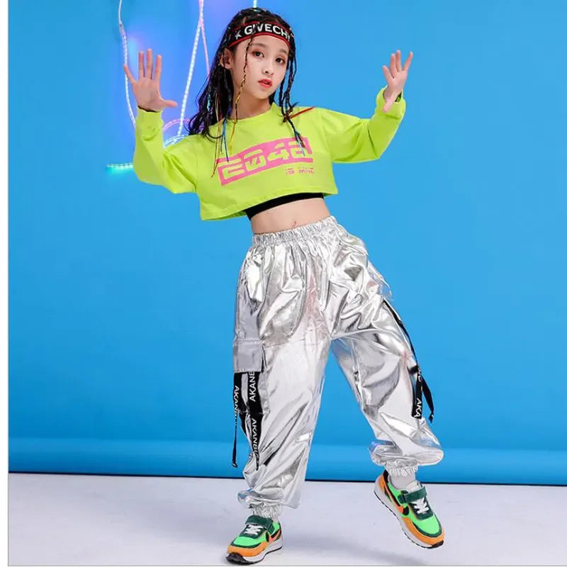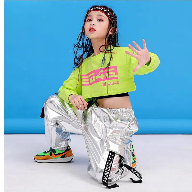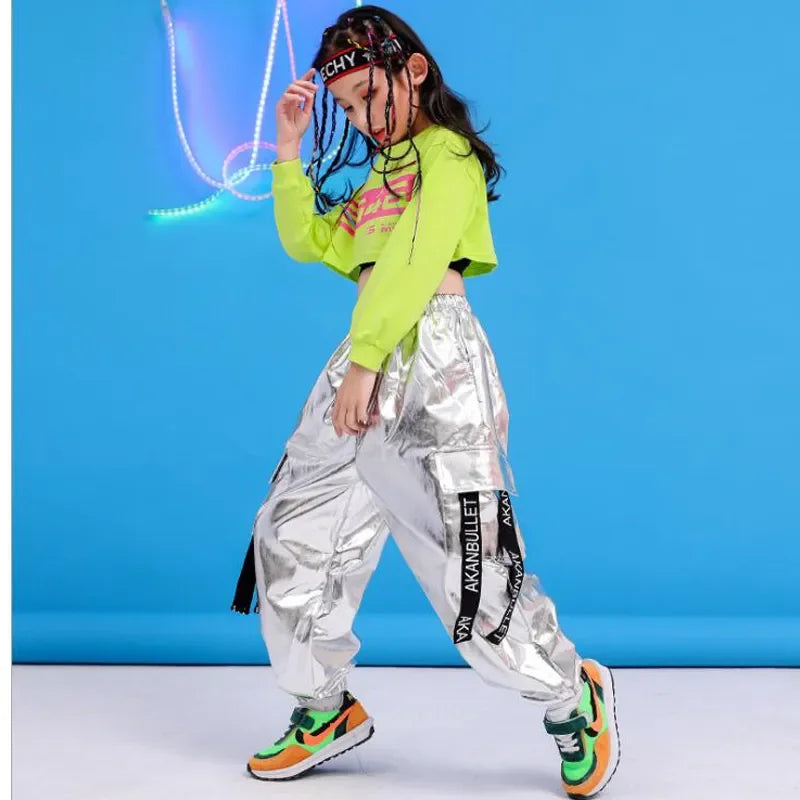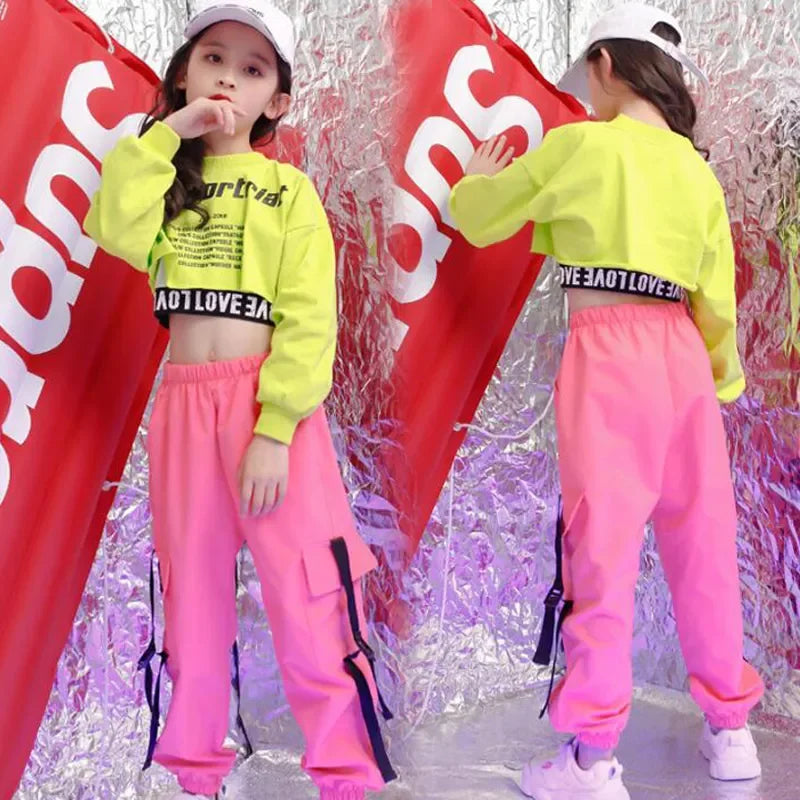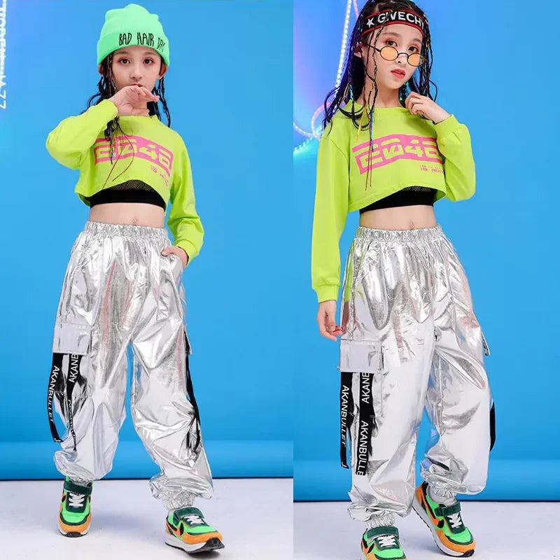 Girls Green Hip Hop Dance Outfit - Crop Sweatshirt & Casual Pants for Kids Jazz/Ballroom