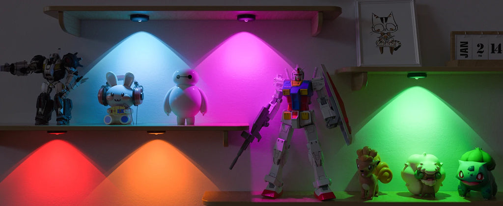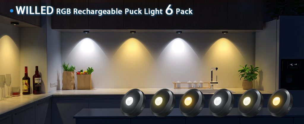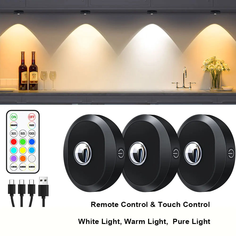 Rechargeable RGB Puck Light, Remote Control, 1200mAh Battery, Dimmable Touch Under Cabinet Night Lighting