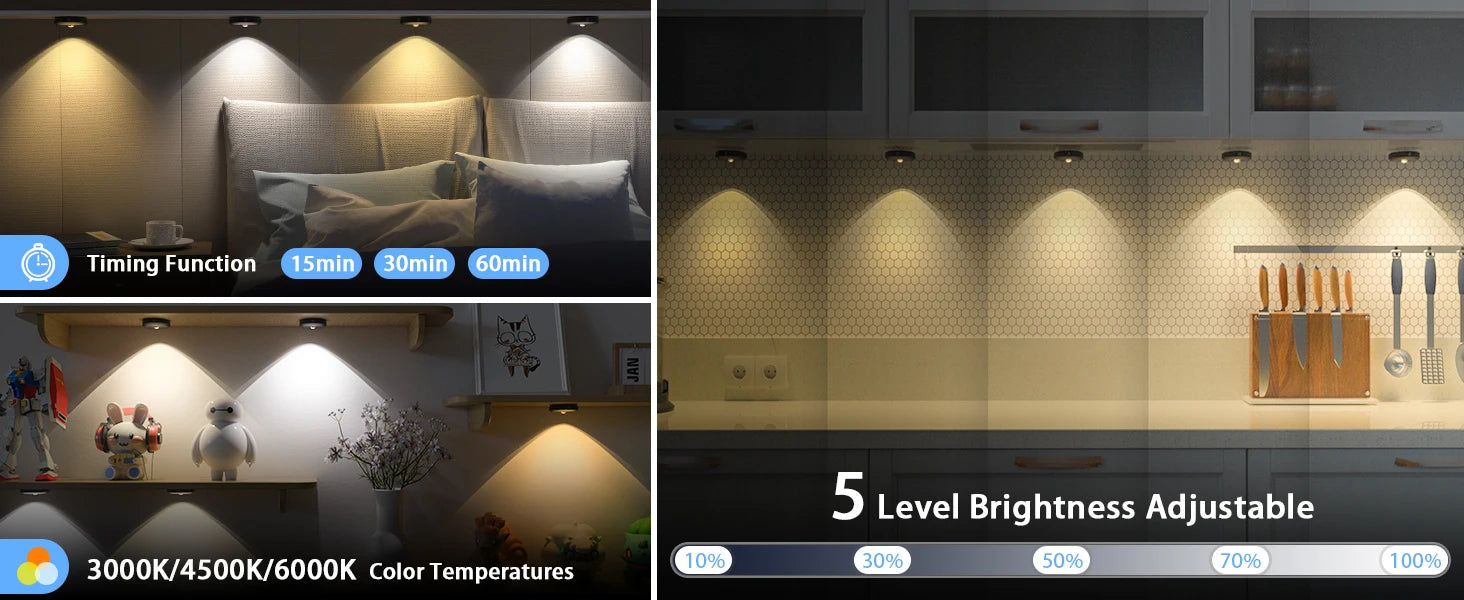 Perfect for various applications like walls, paintings, closets, and more, these lights are equipped with a magnetic base for easy installation on metal surfaces. The built-in timer function lets you set an auto-off for 15, 30, or 60 minutes, providing both convenience and efficiency.
